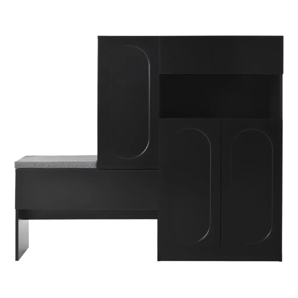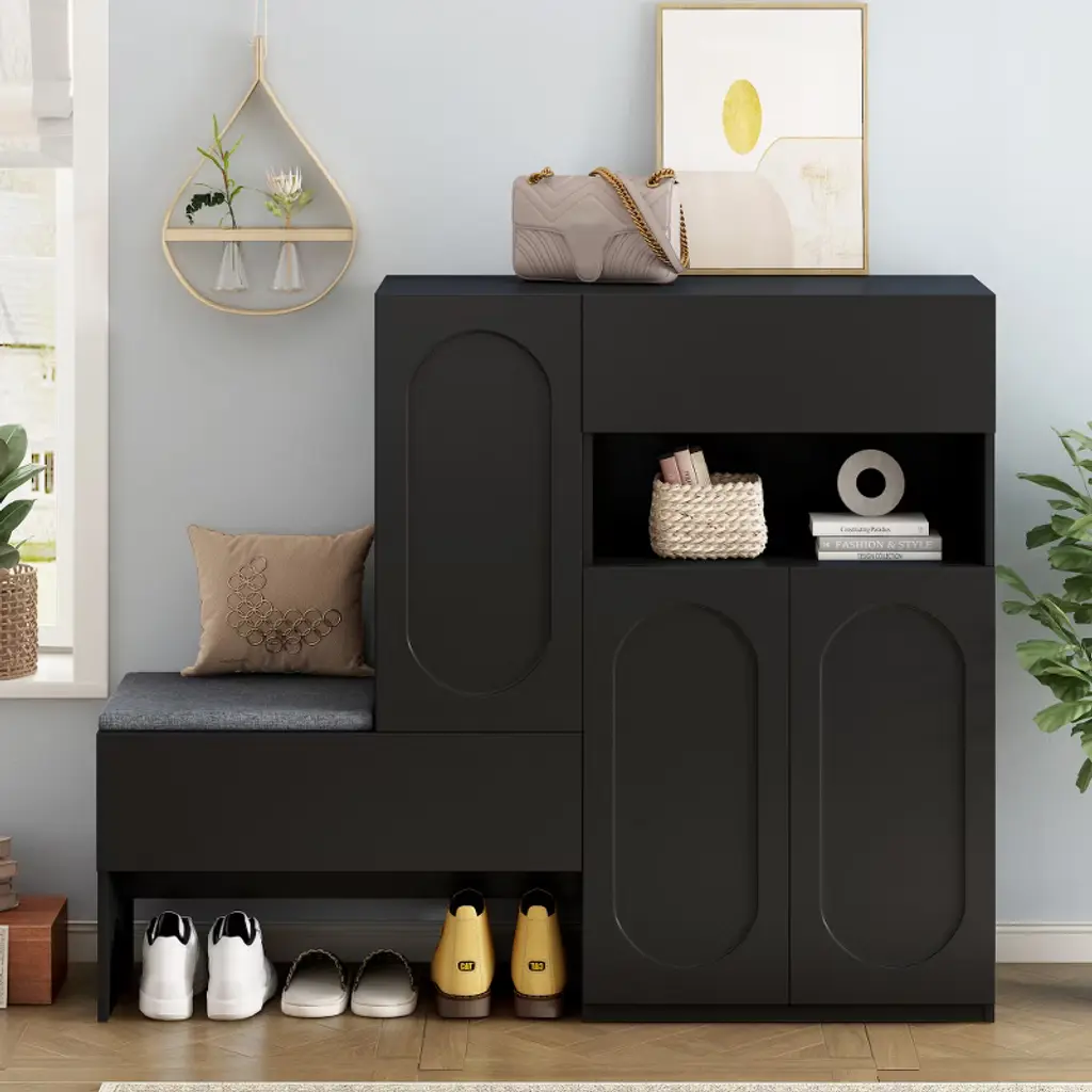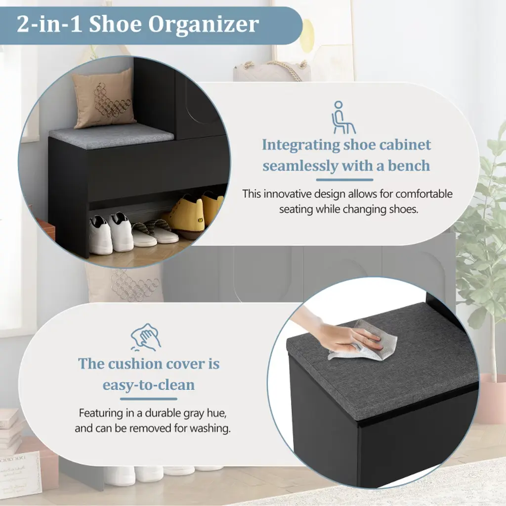 Risokeys Elegant 2-in-1 Versatile Shoe Rack Organizer With Soft Cushion Storage Bench With Arched Doors & Rebound Devices And Adjustable Shelves,black