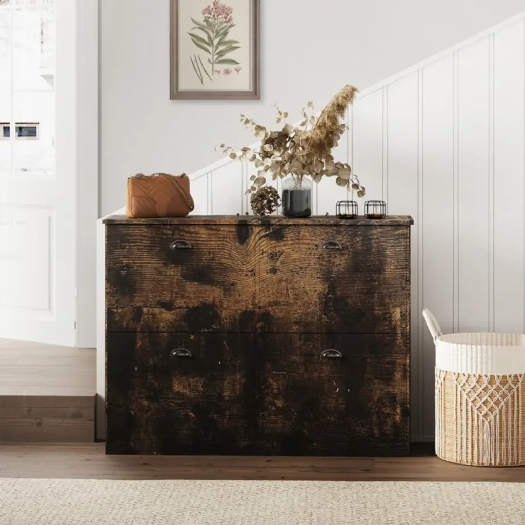 Upgrade your home organization with the Shoe Storage Cabinet with 4 Flip Drawers, combining fashion-forward design and effortless usability for busy households. Crafted for modern living, this ultra-slim 9.4”-deep cabinet slides seamlessly into narrow entryways, hallways, or cramped corners, offering discreet storage for up to 28 pairs of shoes. The easy-open flip drawers with adjustable two-tier shelves adapt to flats, heels, or tall boots, while removable panels accommodate bulkier footwear.Keep your space tidy and dust-free with a minimalist, décor-friendly design available in rustic brown, black, or white—perfect for blending into apartments, family homes, or chic urban spaces. Ease of use shines through its quick assembly (tools included) and multi-level storage, ideal for families, pet owners, or anyone craving clutter-free solutions. Durable MDF construction and anti-tip wall anchors ensure safety, while the raised base cleverly houses slippers or a robot vacuum. Simplify your routine and elevate your space with this stylish, user-friendly storage essential!