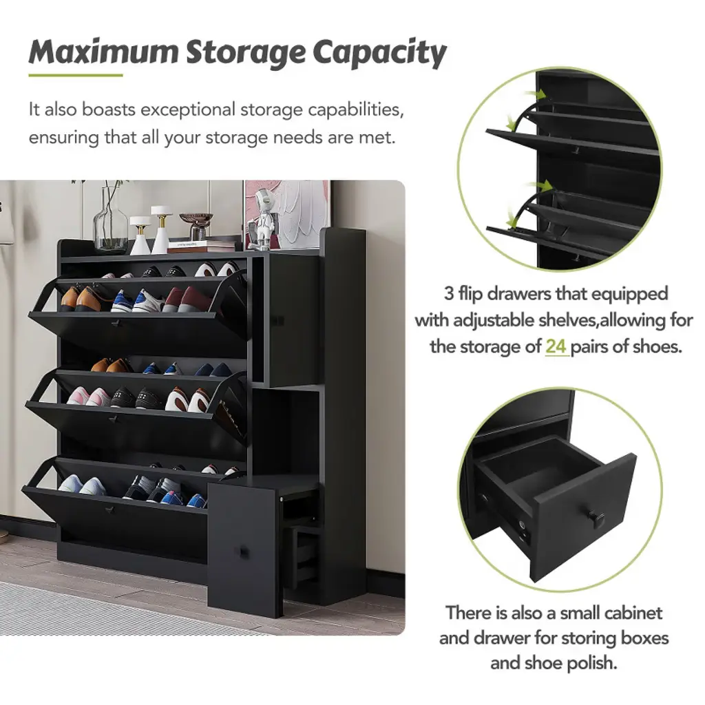 Risokeys Versatile Free Standing Shoe Racks,with 3 Flip Drawers And Storage Cabinet & Pull-down Seat And Drawer For Hallway,black