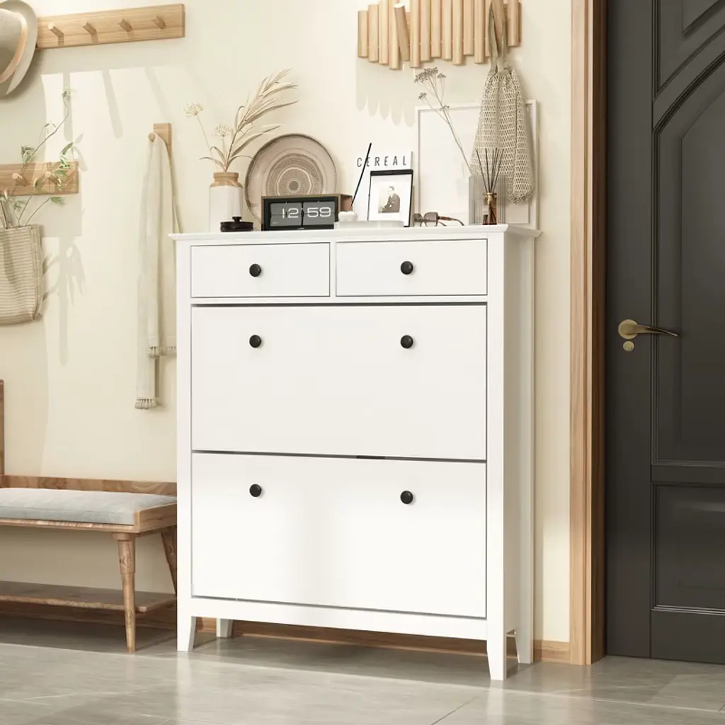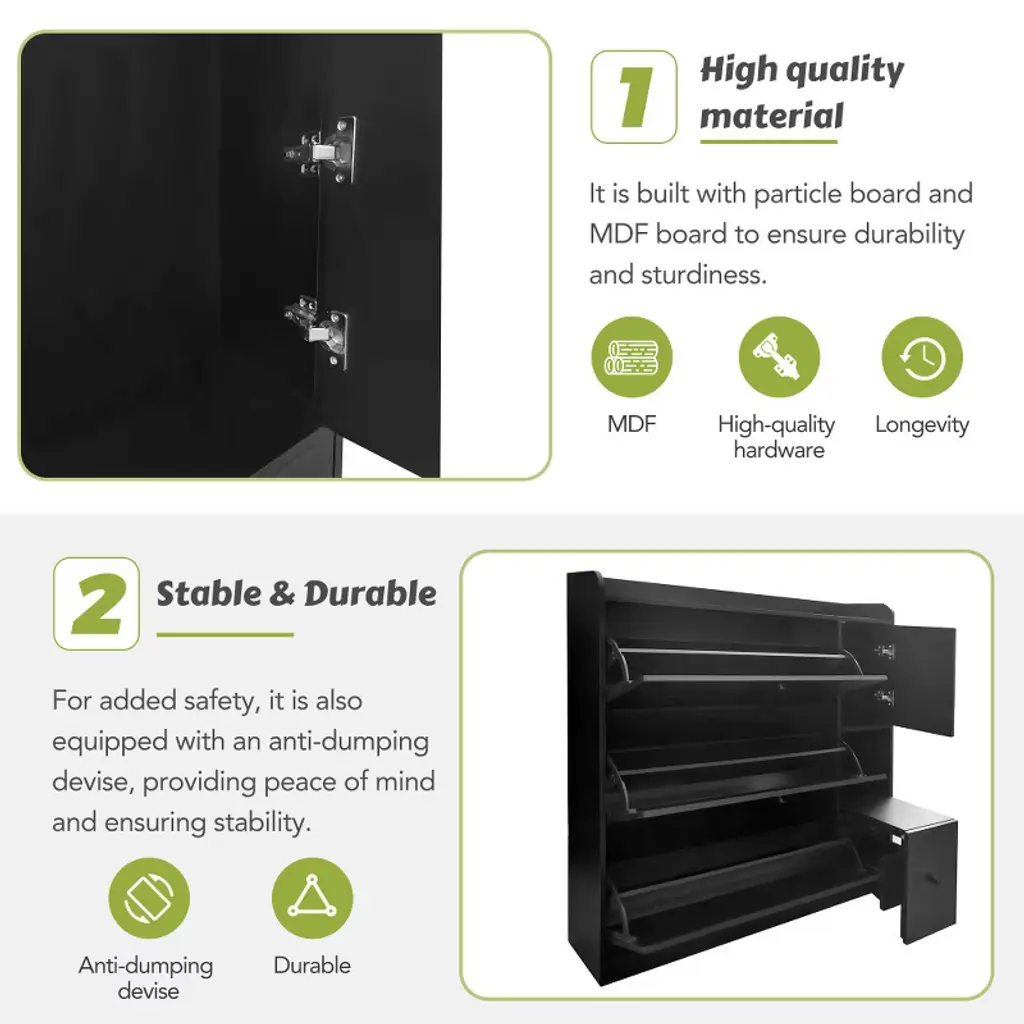 This shoe cabinet boasts sleek and elegant lines and a smooth pure color that would seamlessly integrate into any interior design scheme. The front is further adorned with a stylish black square handle, adding a touch of class and finesse to the overall look.It features a pull-down seat, providing a comfortable spot to sit and change shoes. The seat is sturdy and comfortable, making it an added bonus for anyone who struggles with uncomfortable or painful shoe-changing. When not in use, the seat can be easily put away, freeing up extra space.