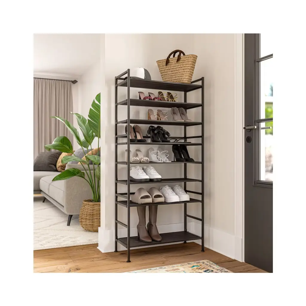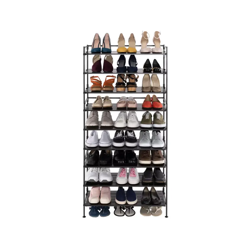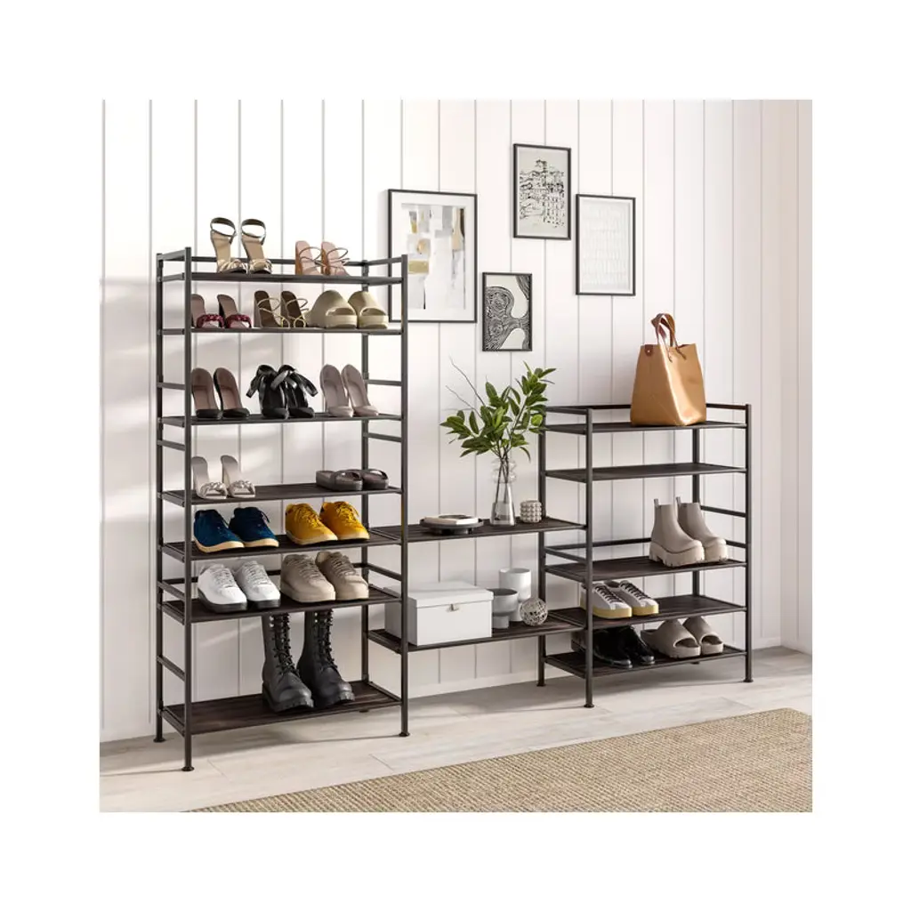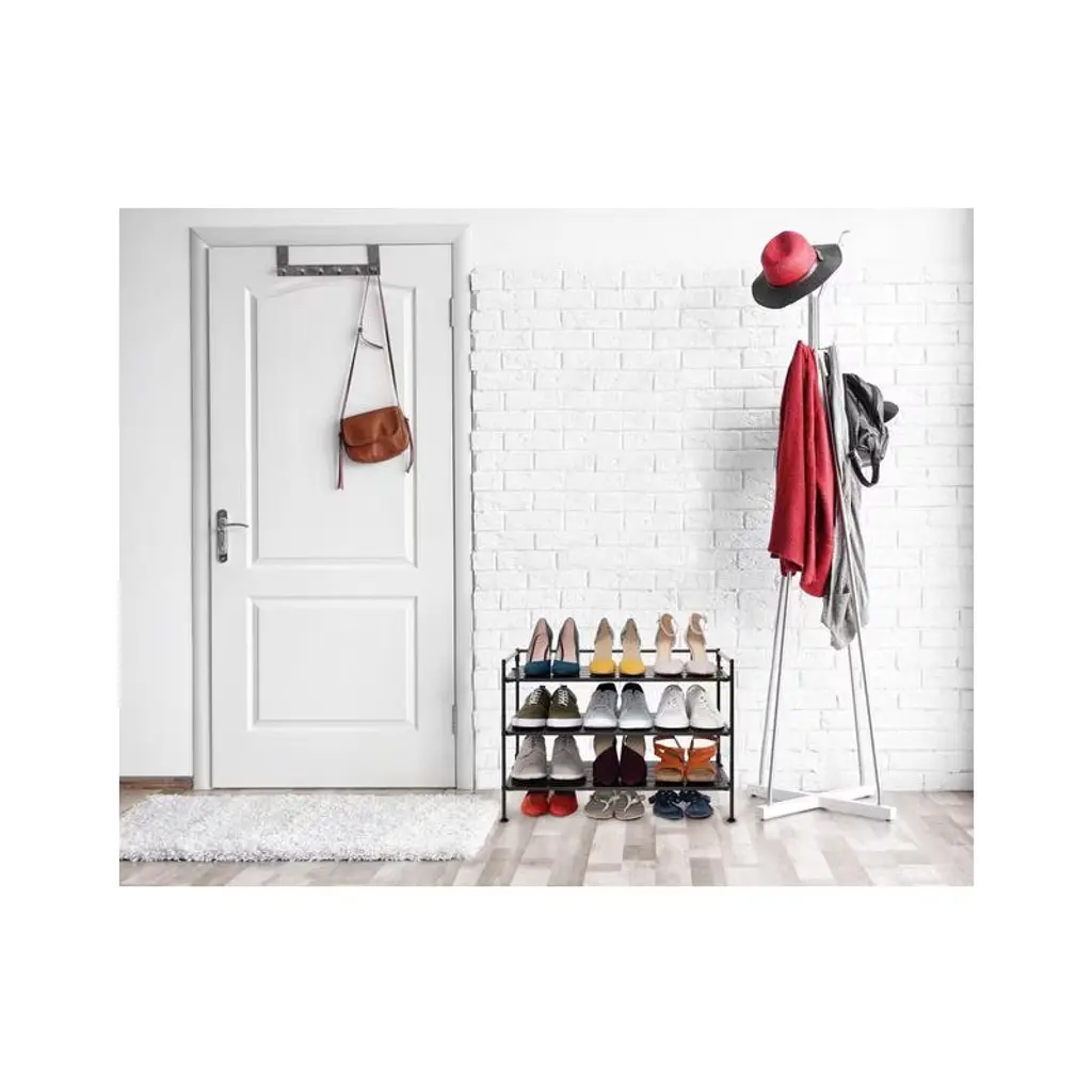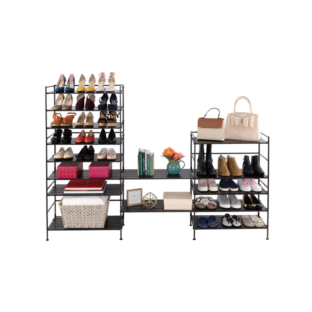 Organize your space with the Seville Classics 3-Tier HOME Resin Slatted Shoe Rack. The modern design is ideal for any room in your home from the bedroom, living room, kitchen, closet, garage, pantry, home office, and door entryway. Sort and store all sizes of sneakers, boots, sandals or heels. The patented design accommodates up to 3 shoes per shelf and 3 low-profile shoes under the rack. Our innovative Interlock design allows you to connect multiple units horizontally for a customizable modular storage system. The steel frame design will support your storage needs with a weight capacity of 90 lbs. total (30 lbs. per shelf).