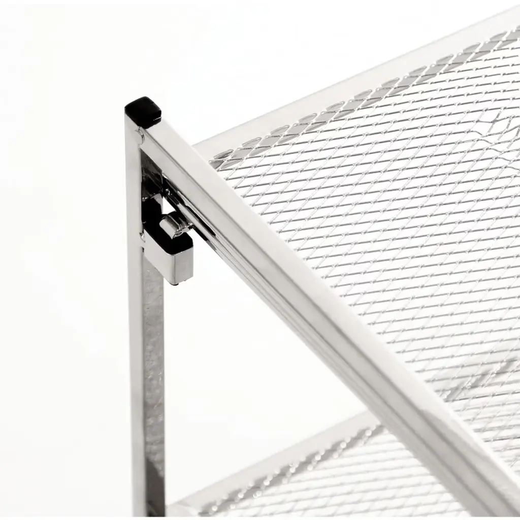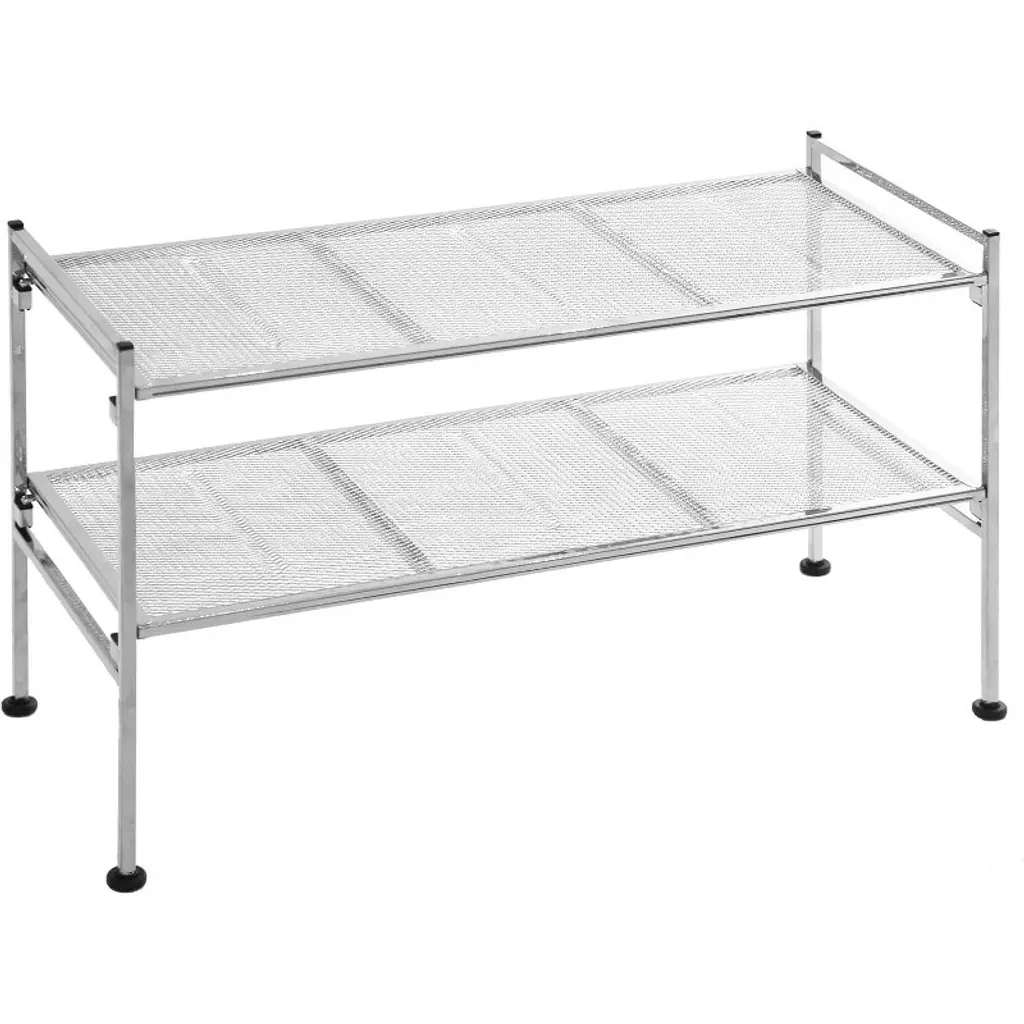 Store and organize with our 2-Tier Stackable Steel Mesh Shoe Storage Rack. The metal frame is foldable and features an attractive silver epoxy powder coat finish. The storage rack organizes up to 9 pairs of shoes, with 6 pairs of shoes on the shelves and 3 beneath the unit. Store up to 25 lbs. per shelf. Assembly is quick and easy - screw in the leveling feet and clip the shelves onto the frame. No tools required. This multipurpose rack made be used for storage in the kitchen, pantry, closet, living room, bedroom, office, and garage.