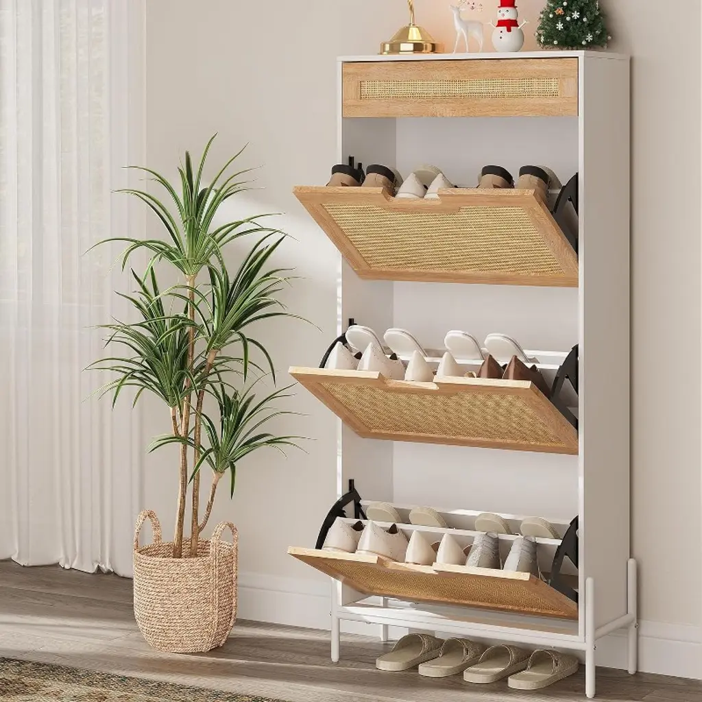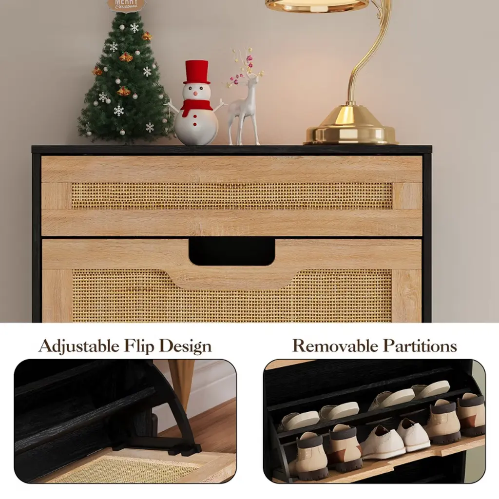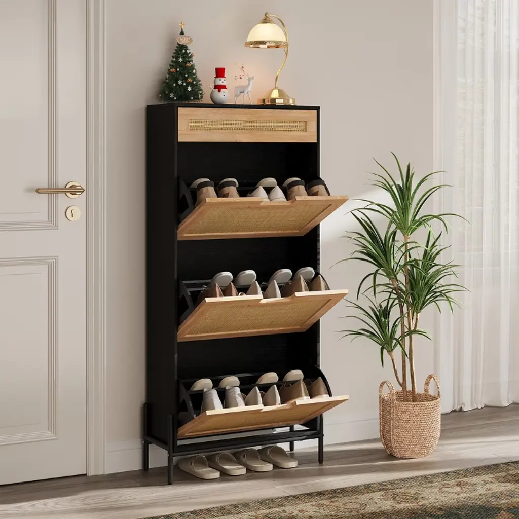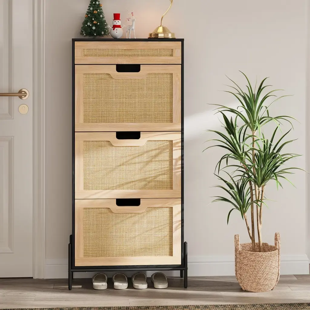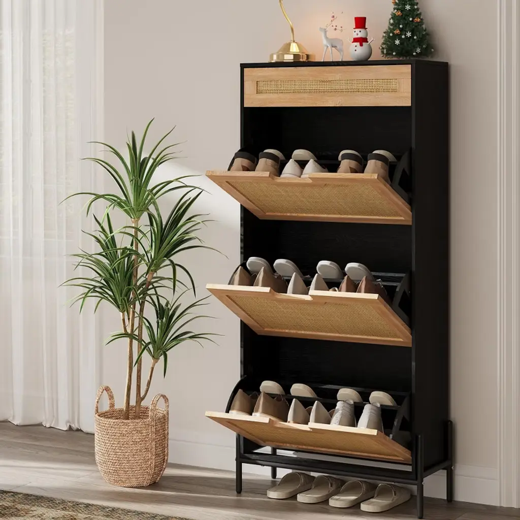 Shoe Cabinet, Shoe Storage With 3 Flip Doors, Natural Rattan Shoe Rack With Adjustable Shelf, 1 Drawer, Shoe Cabinet For Entryway, Black+oak