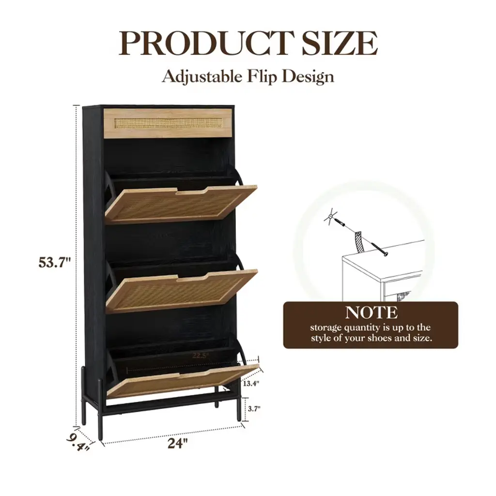Specification:Material: Wood, IronSize: 24"D x 9.4"W x 53.7"HPacking list:Shoe cabinet x1Assembly guide x1