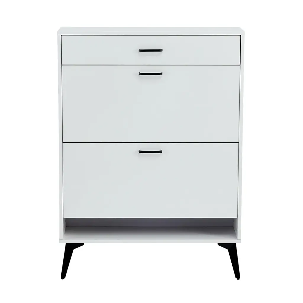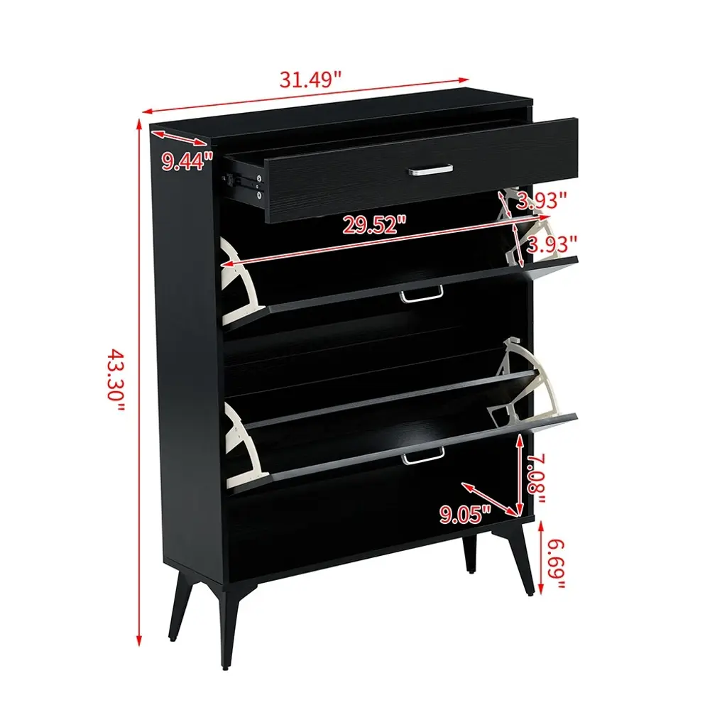 Space saving: The slender structure and space saving design make it a wise choice for narrow spaces. Use this stylish shoe cabinet to thoroughly clean up any debris in the hallway.Home decor: The smooth steel legs perfectly match the modern color scheme and can be carefully placed in the lobby or entrance passage.With 2 Flip Drawers: This shoe storage cabinet comes with two flipped storage cabinets and a very convenient open storage area, making it perfect for storing walking accessories, car keys, or dog leadsDetachable compartment: Each compartment has a detachable partition, which you can choose to keep or remove based on the size or style of the shoes.Multifunctional storage cabinet: This storage cabinet can not only be used as a shoe cabinet for storage, but also as a decoration. Shoe organizer, entrance control panel, bedroom, hallway.Description:Name: Shoe CabinetColor: Black/Grey/WhiteMaterial: Medium density fiberboardProduct assembly size: 31.49 x 9.44 x 43.30inPackaging size: 40.55 x 23.62 x 5.51 inchesPacking list:1 x Shoe CabinetNote:Different displays may cause the color of the item in the picture a little different from the real thing. Manual measuring,please allow 1~3mm error,thank you.