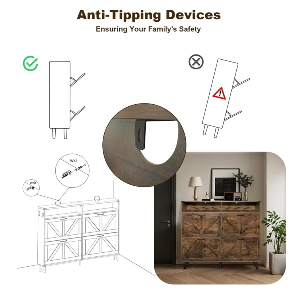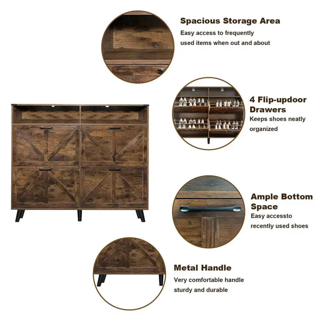 Shoe Storage Cabinet, Farmhouse Shoe Organizer With 4 Flip Drawers And Open Storage, Freestanding Narrow Shoe Rack Cabinet For Entryway, Hallway,brown