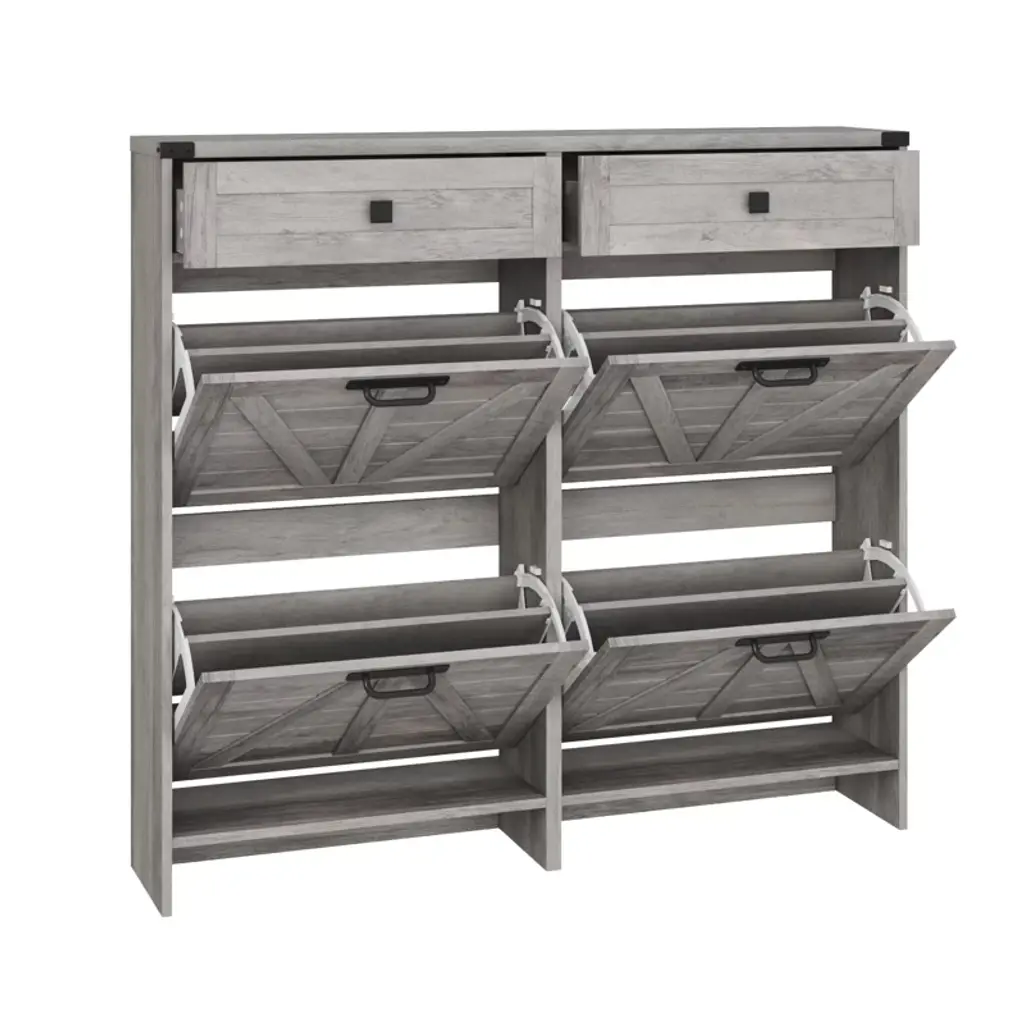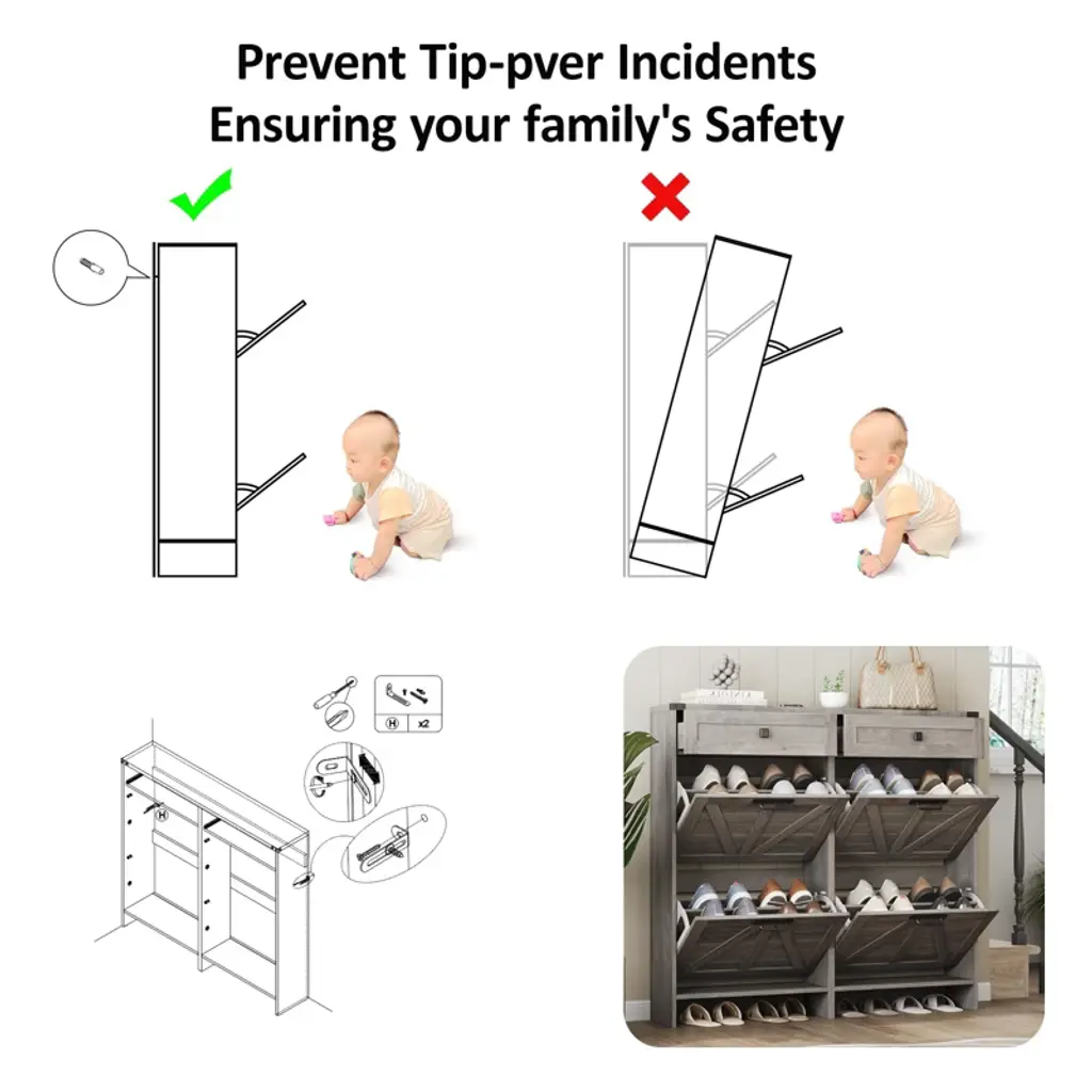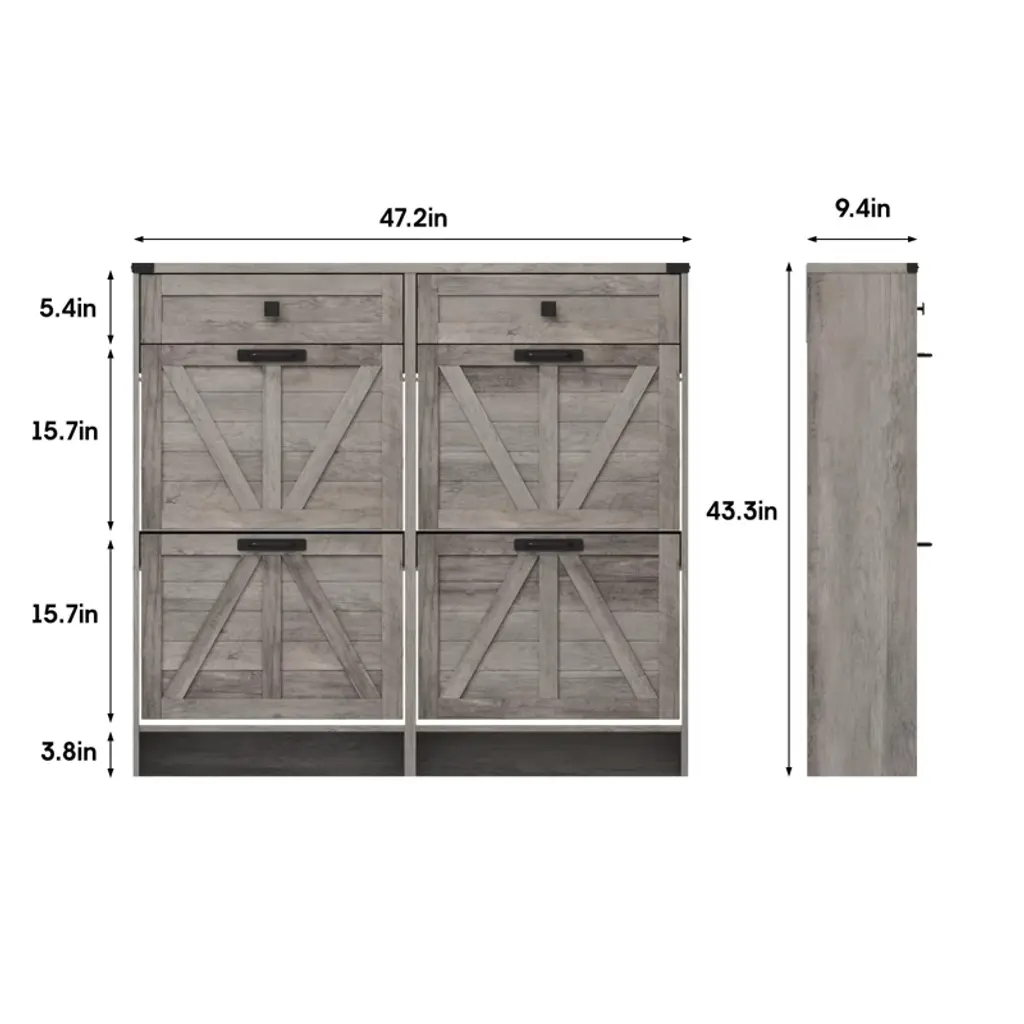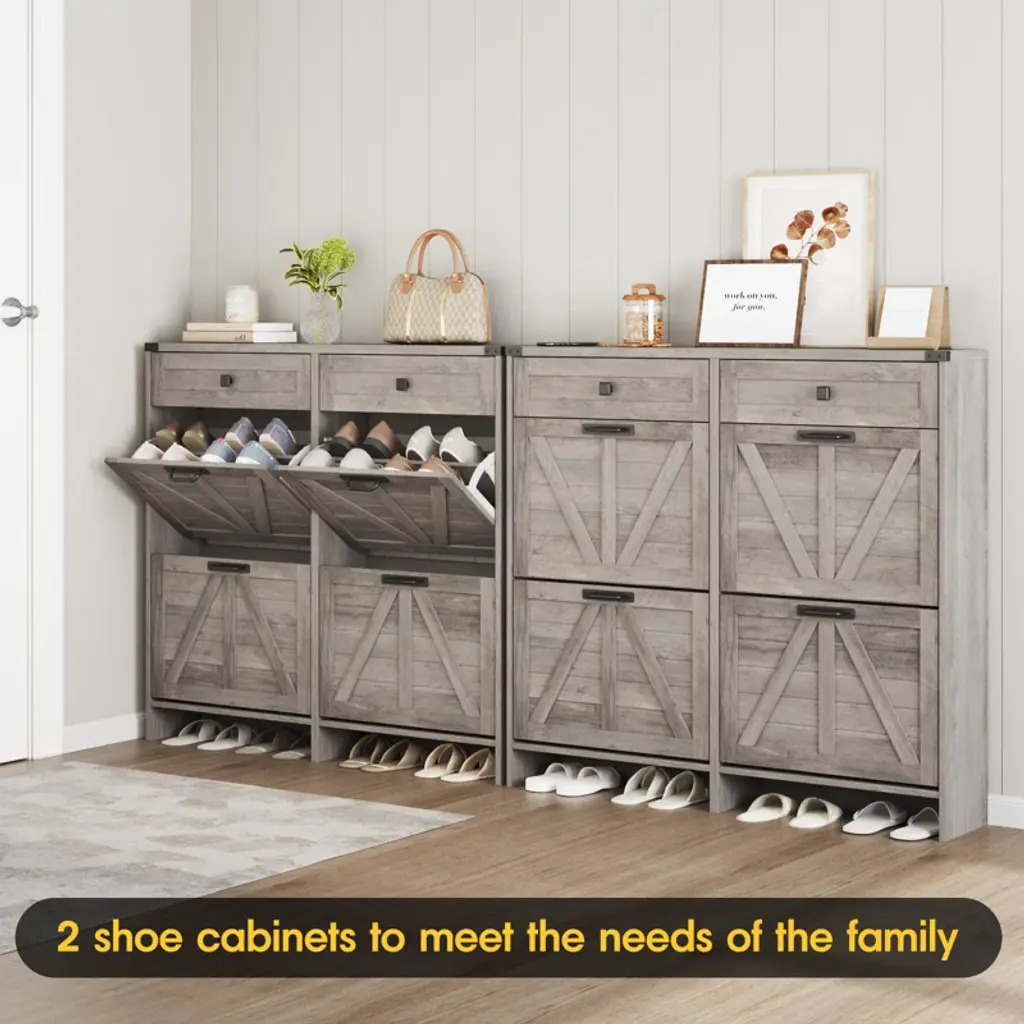 This farmhouse-style entryway shoe cabinet combines rustic charm with practical storage, featuring 4 flip drawers (each with 2 tiers and removable dividers) and 2 additional drawers for keys, wallets, and miscellany. Its slim design fits narrow spaces, keeping shoes dust-free and protected from pets, while the spacious top offers easy access to daily essentials. With 6 total drawers, it caters to families, blending neatly into entryways, hallways, or porches. Easy to assemble with labeled parts and clear instructions, it’s a space-saving, stylish solution for organized homes.