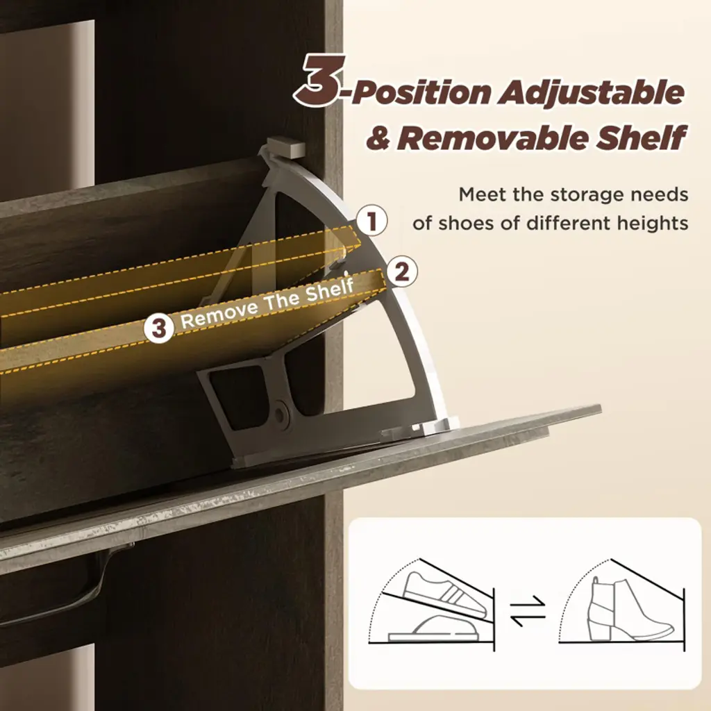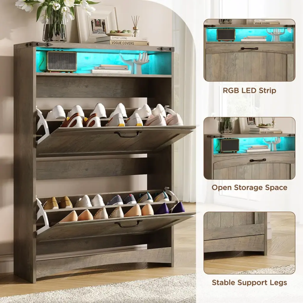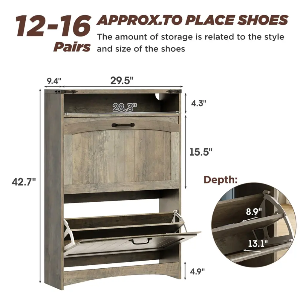 This farmhouse-style walnut shoe cabinet blends functionality and charm, featuring a rustic barn door design to keep entryways or living spaces tidy. It includes an RGB LED strip with 60,000+ colors, adjustable via button or app, with music sync and timing functions. Measuring 9.4''D x 29.5''W x 42.7''H, it holds 12-16 shoe pairs, with flip drawers, removable shelves, a spacious desktop, and open storage. Made of high-quality MDF with a stable base and anti-tipping device, it’s sturdy and safe.