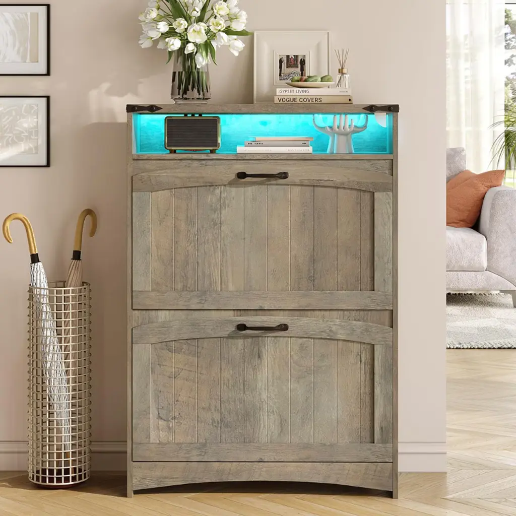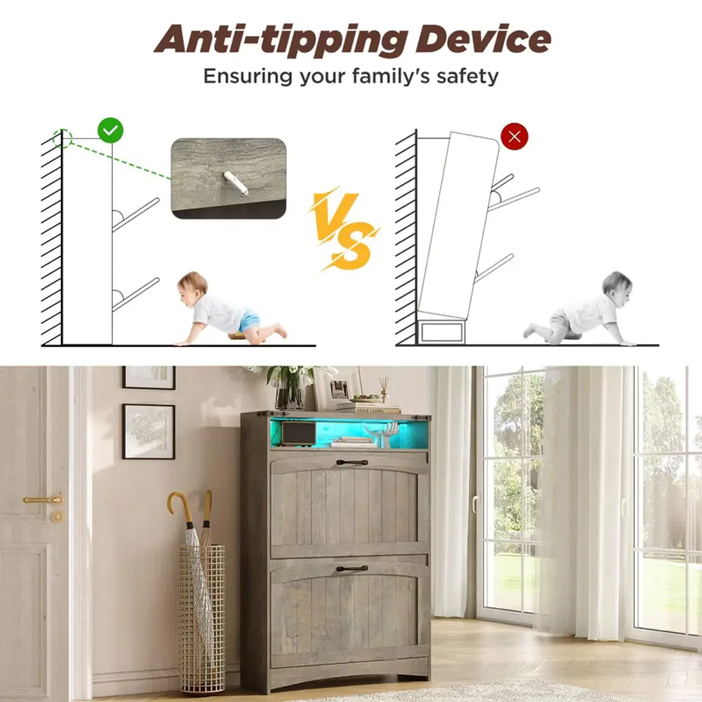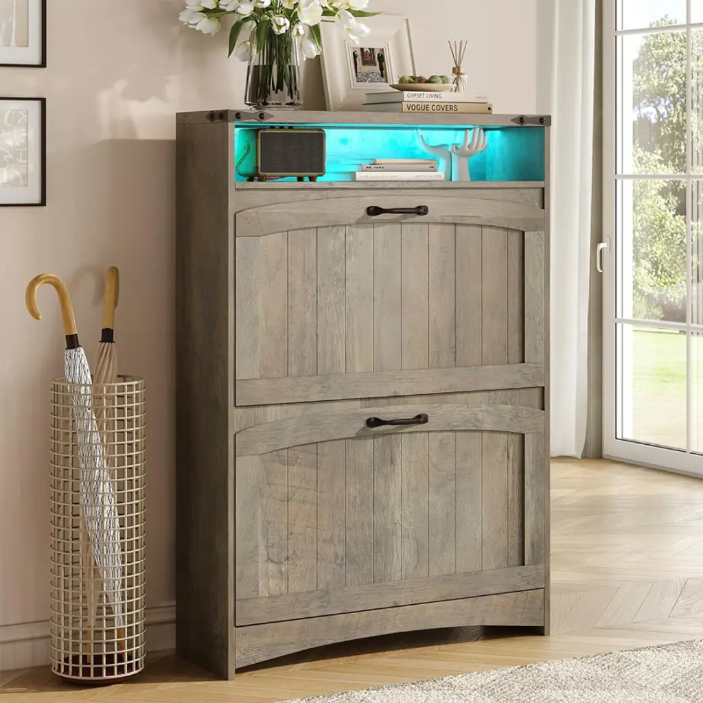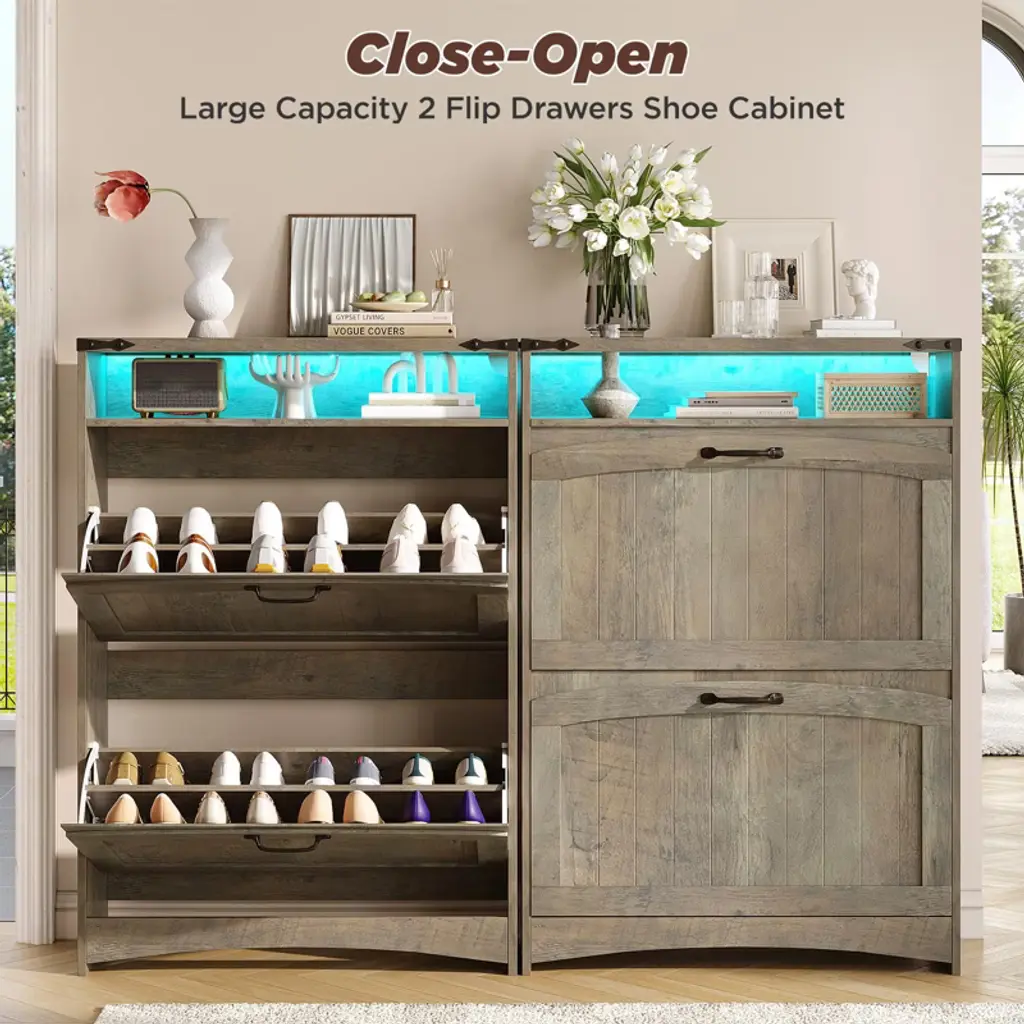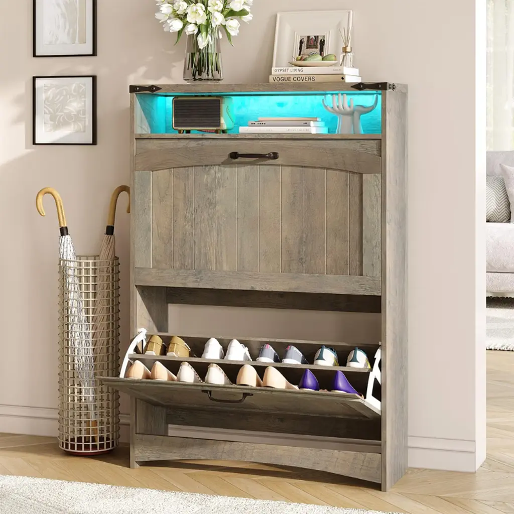 Shoe Storage Cabinet With 2 Flip Drawers & Rgb Lights, Narrow Shoe Rack Organizer, Washed Grey