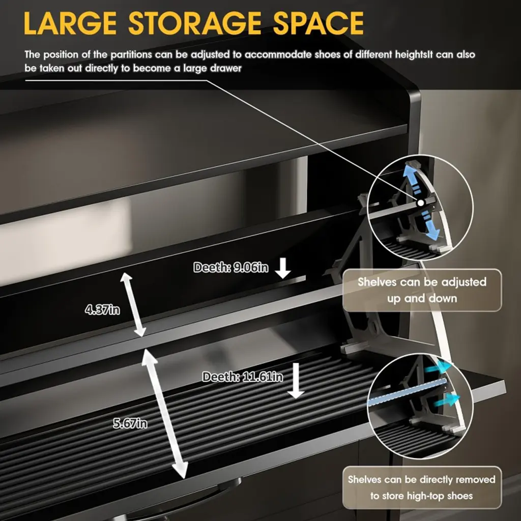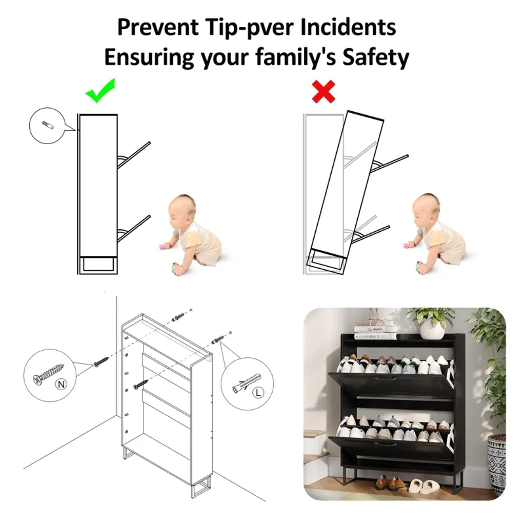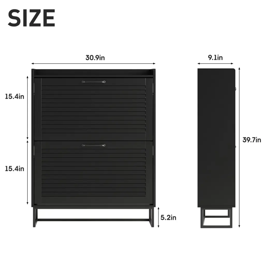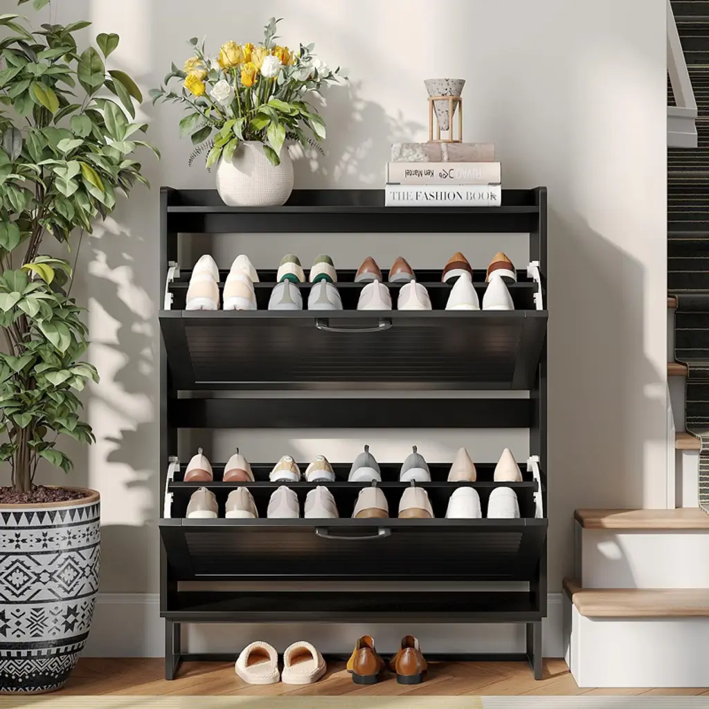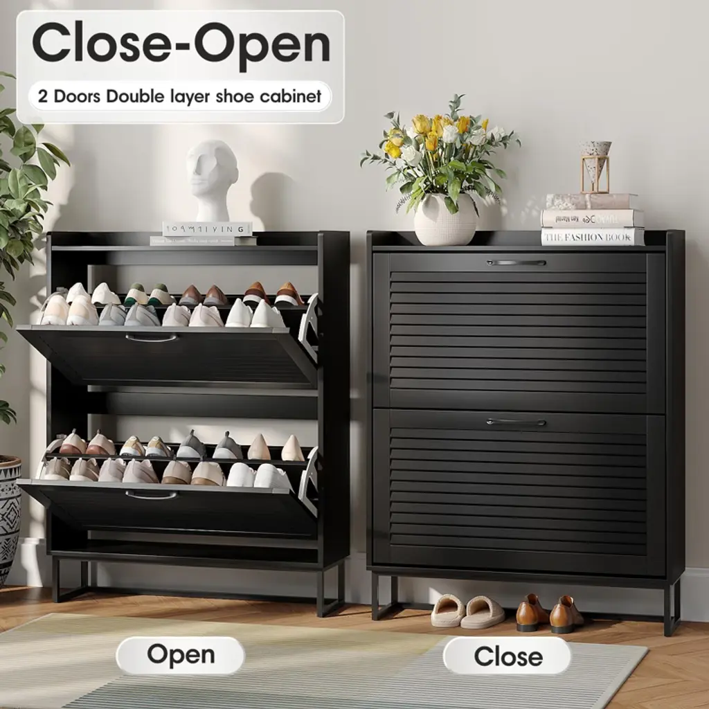 This entryway shoe cabinet features 2 flip doors with a sleek louvered design—stylish, ventilated to prevent odors, and fitting various home styles. Its narrow 9.35-inch depth (half the size of most) saves space, ideal for entryways, hallways, etc. The flip drawers (with 0.4-inch-thick louvers) open easily, hiding shoes from dust and pets, and hold 16-20 pairs. Each drawer has 2 adjustable/removable layers for flats, boots, or heels. The top with a fence fits plants, keys, etc. It includes an anti-tipping device, uses eco-friendly paint, and has durable hinges/handles for safety and longevity.