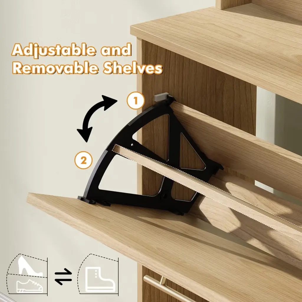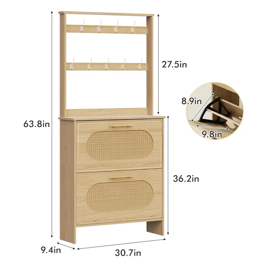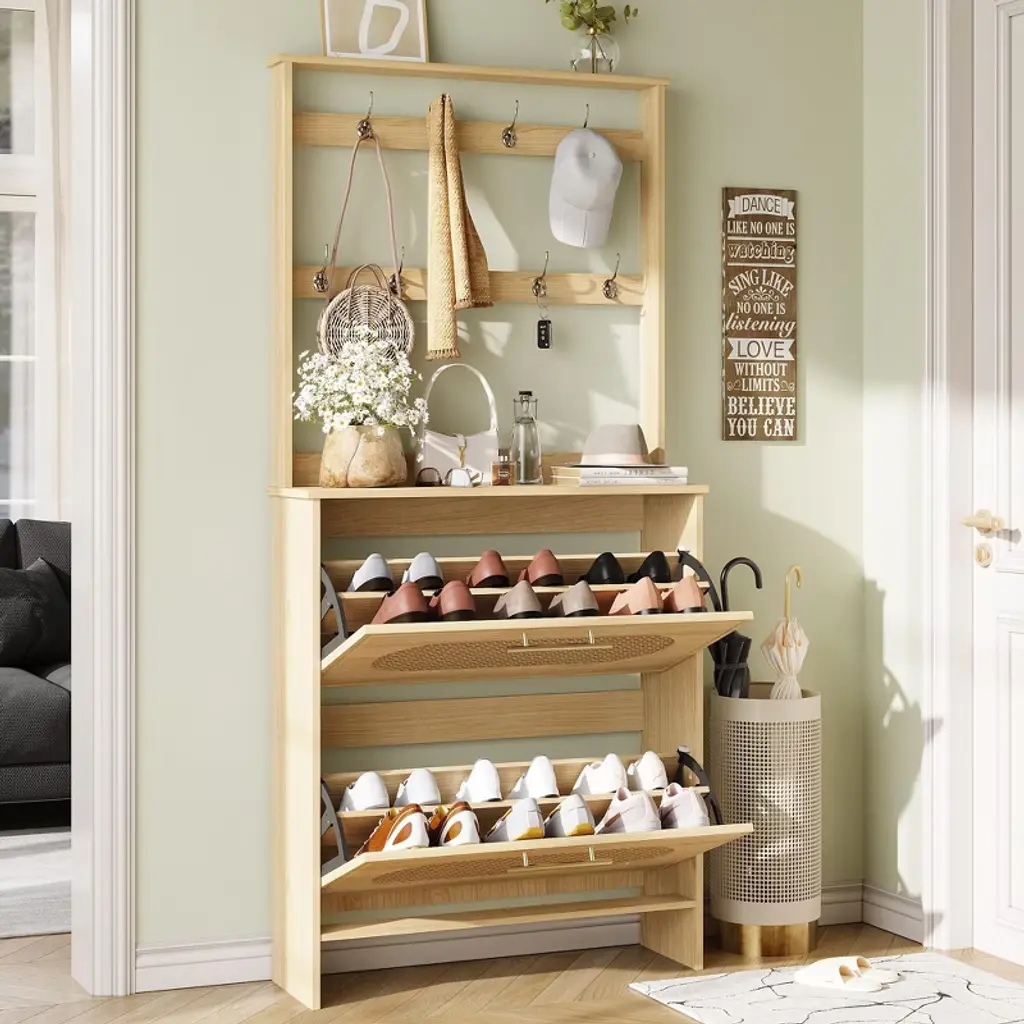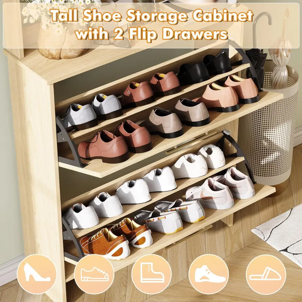 Shoe Storage Cabinet With Hanging Hooks & Flip Drawers, Hidden Shoe Rack, Oak