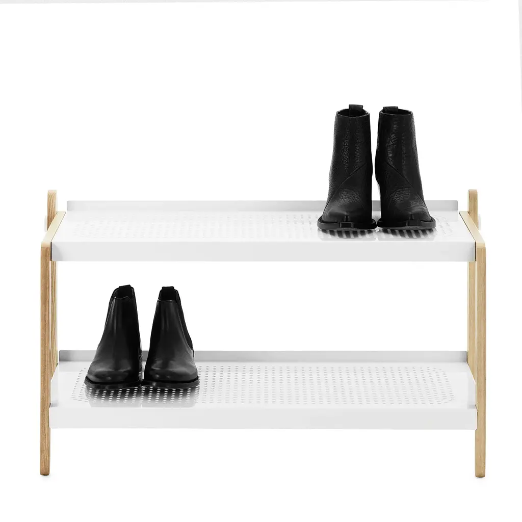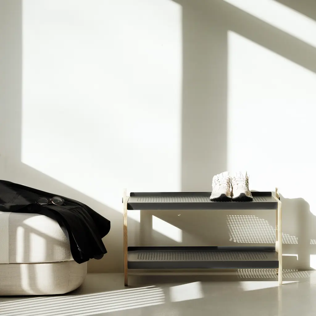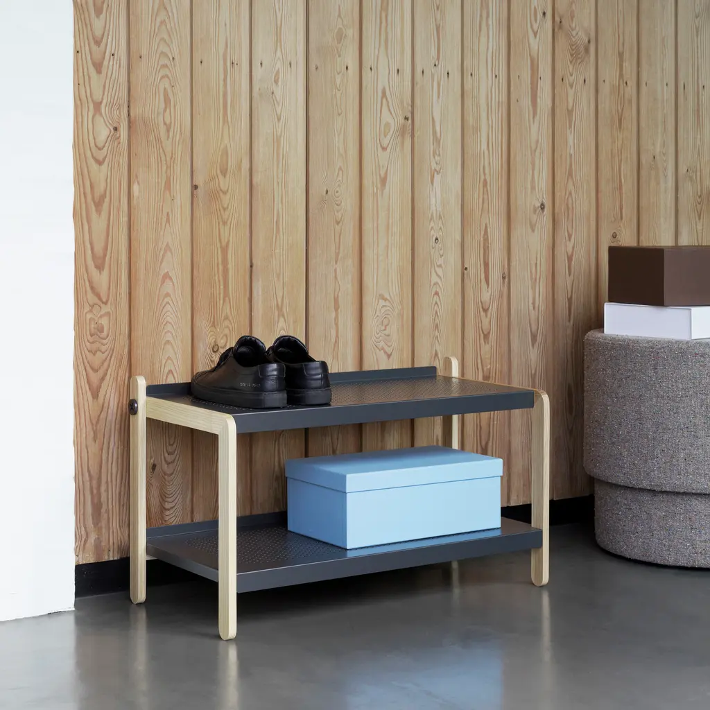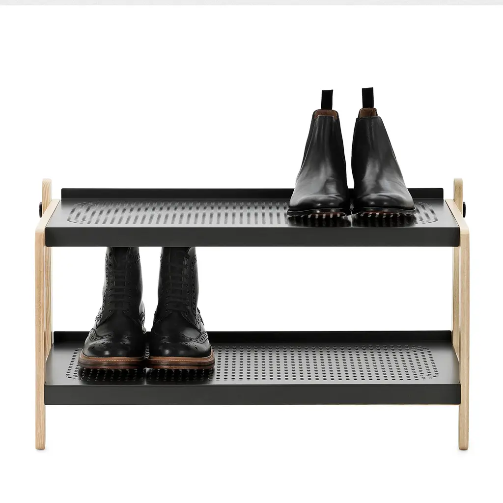 Sko makes quick work of storing shoes and boots and is attractive enough to leave out in the hallway or bedroom. Simon Legald goes for an industrial feel, with shelves in perforated steel and visible accentuated screws. Available in white or grey, the unit’s spare lines and natural ash frame also bespeak its Scandi design bonafides.