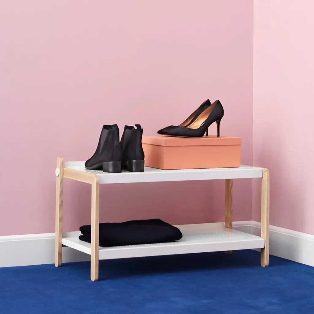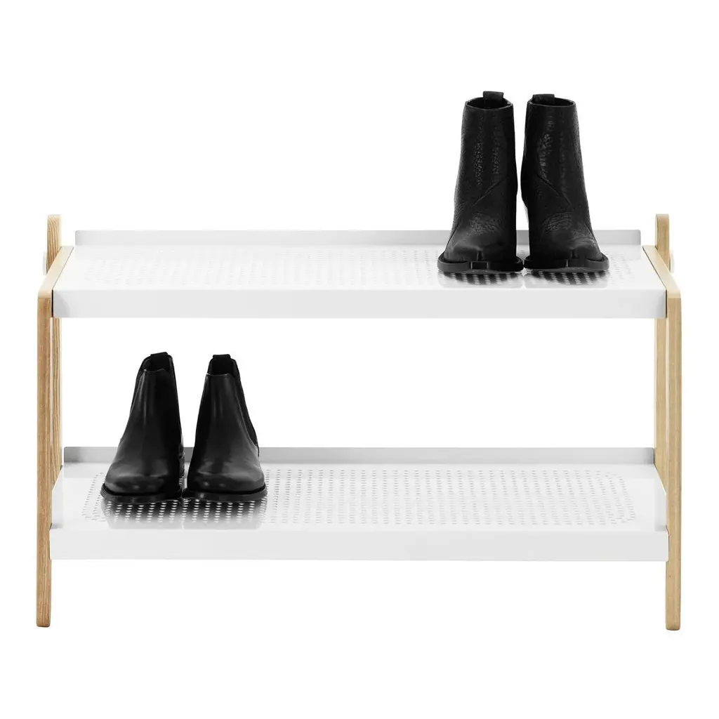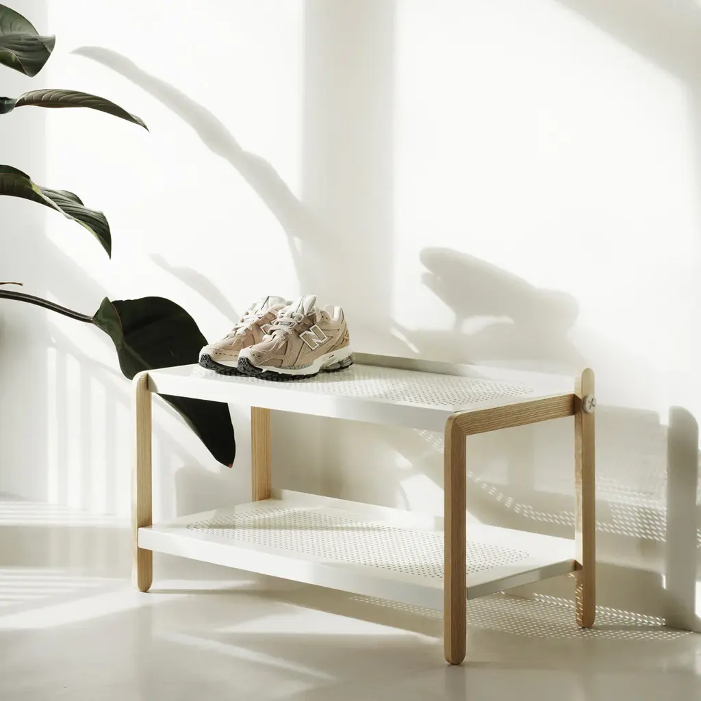 Sko is a shoe rack with both an industrial and simple feel and is made with robust, Scandinavian materials. Sko has been designed without any unnecessary components. It consists of a wooden frame with two perforated steel shelves held together by accentuated screws. Sko is available in ash, with shelves in a pure white or intense dark grey and is perfect for places where extra storage space is needed for shoes and boots, such as the hallway and bedroom etc. Includes tools for assembly, as well as an easy-to-follow manual. Load capacity: ~ 11 lbs (5 kg) per shelf.