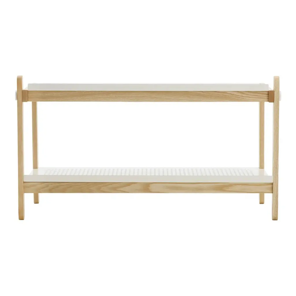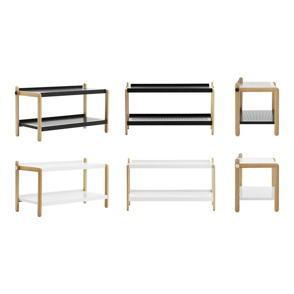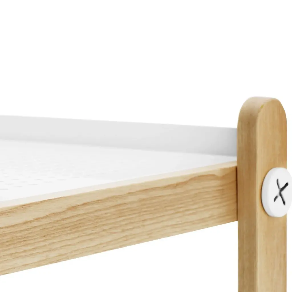 Sko is a shoe rack with both an industrial and simple feel and is made with robust, Scandinavian materials. Sko has been designed without any unnecessary components. It consists of a wooden frame with two perforated steel shelves held together by accentuated screws. Sko is available in ash, with shelves in a pure white or intense dark grey and is perfect for places where extra storage space is needed for shoes and boots, such as the hallway and bedroom etc. Includes tools for assembly, as well as an easy-to-follow manual. Load capacity: ~ 11 lbs (5 kg) per shelf.