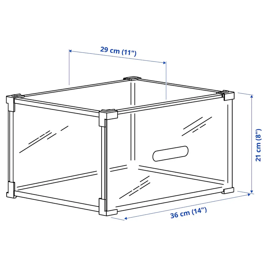 SKUFFEN Shoe box - clear 14x11x8 ". The box opens in the front so it’s always easy to reach your shoes, even if you stack several shoe boxes on top of one another. The aluminum frame allow you to stack boxes on top of each other without scratching them.
