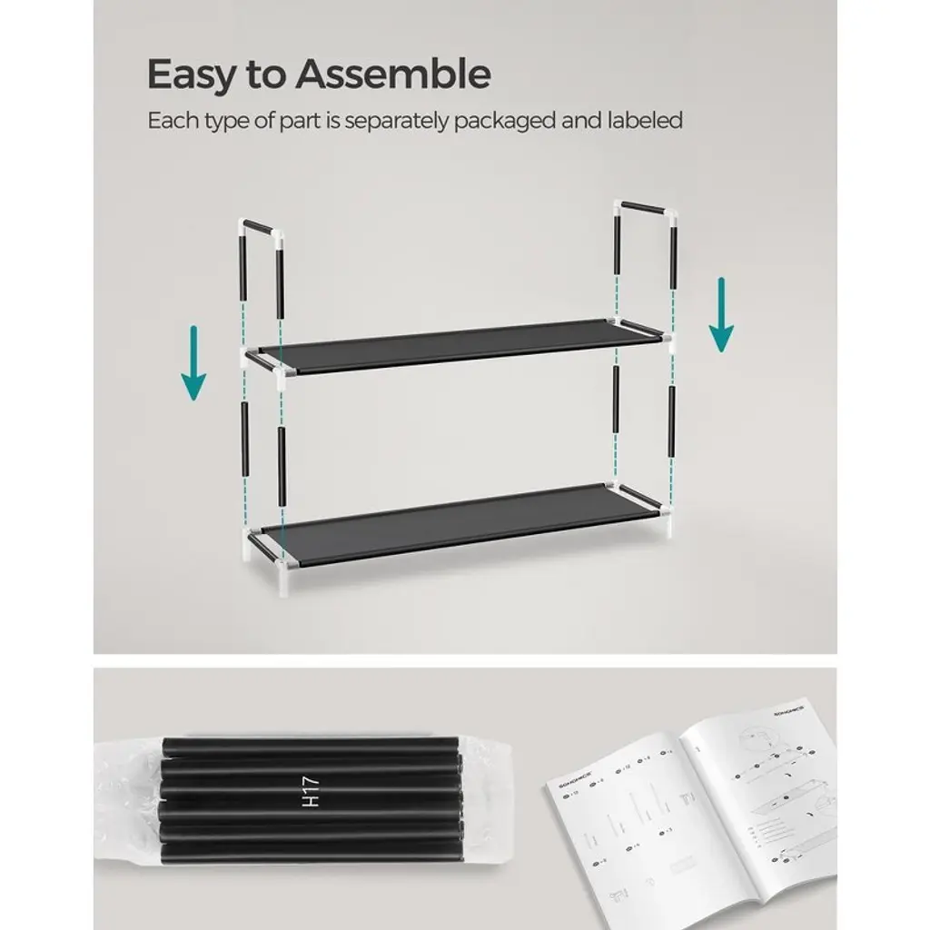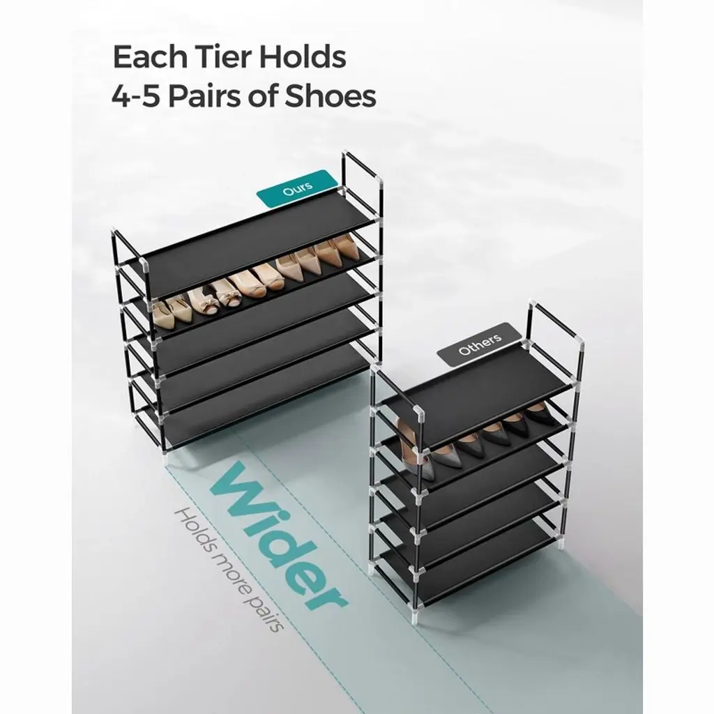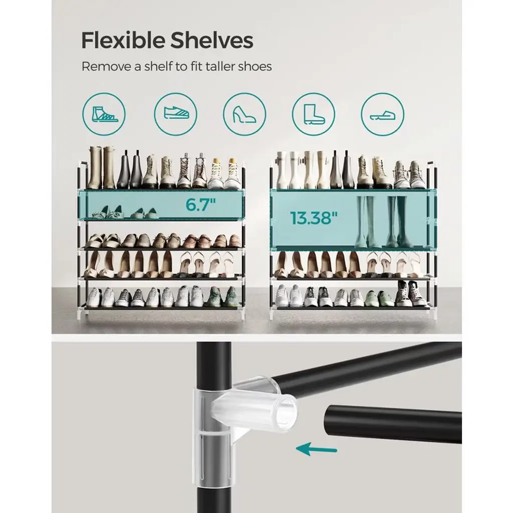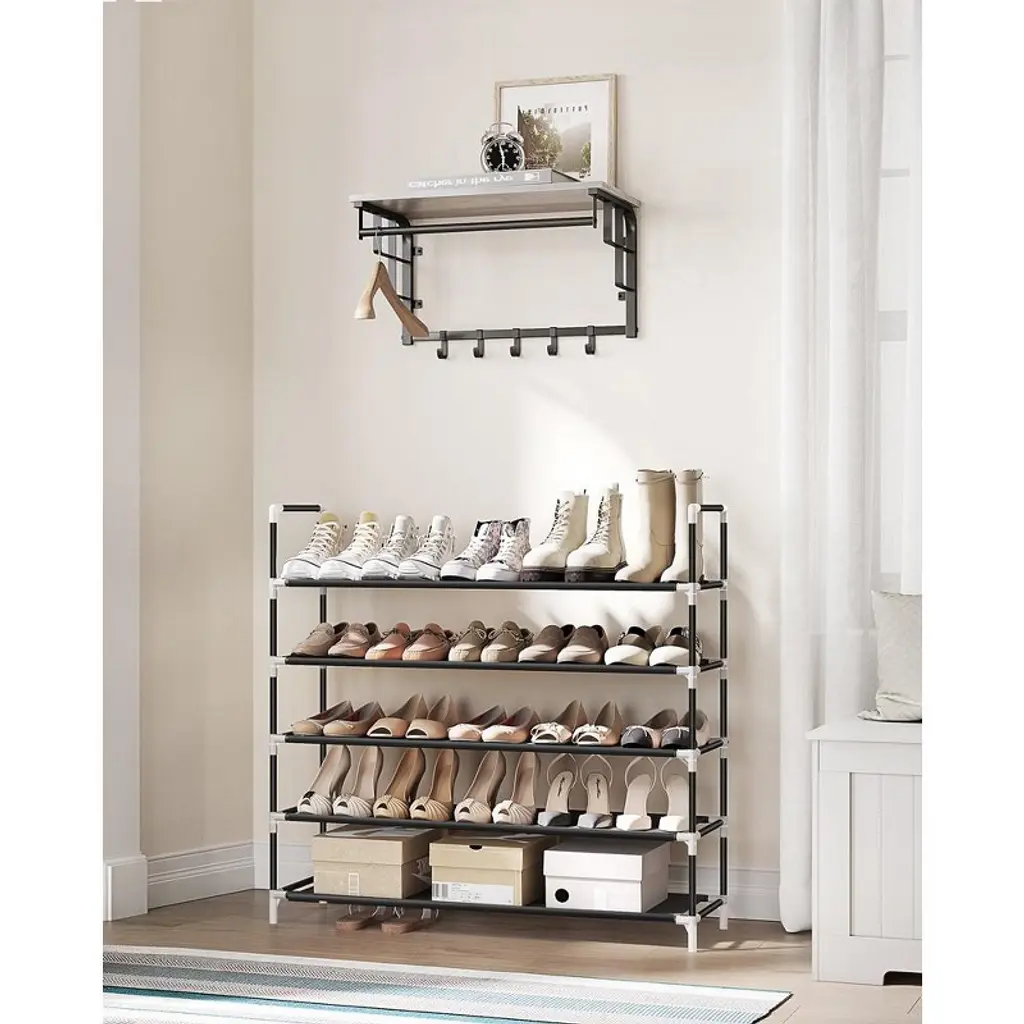 Keep your shoes organized with this Songmics 5 Tiers Shoe Rack, which is designed to provide a great storage solution for your collection of favorite footwear. It is constructed out of durable iron pipes, non-woven fabric and plastic connectors. Each shelf holds up to 3 or 4 pairs of full-size shoes. This is a decent rack to store your shoes and fits well into you doorway, entryway, mud room, bedroom, closet and so on. This space-saving shoe rack could also be put in a corner or in a hall.