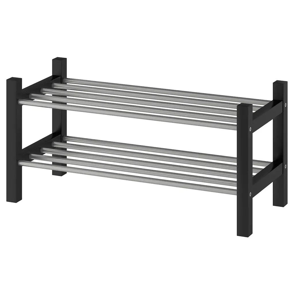 TJUSIG Shoe rack - black 31 1/8x12 5/8x14 5/8 ". If you need more storage space for your shoes, simply stack one shoe rack on top of another. Holds a min. of 6 pairs of shoes. Connection hardware for stacking 2 shoe racks is included. Coordinates with other products in the TJUSIG series.