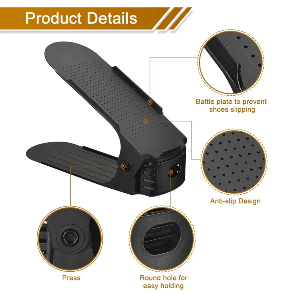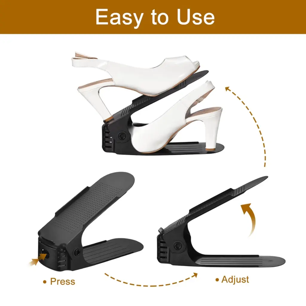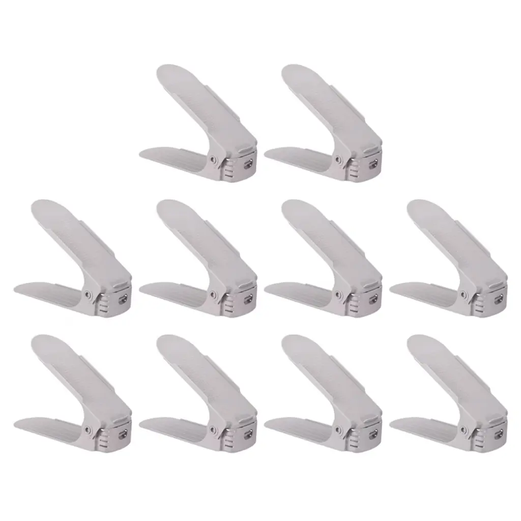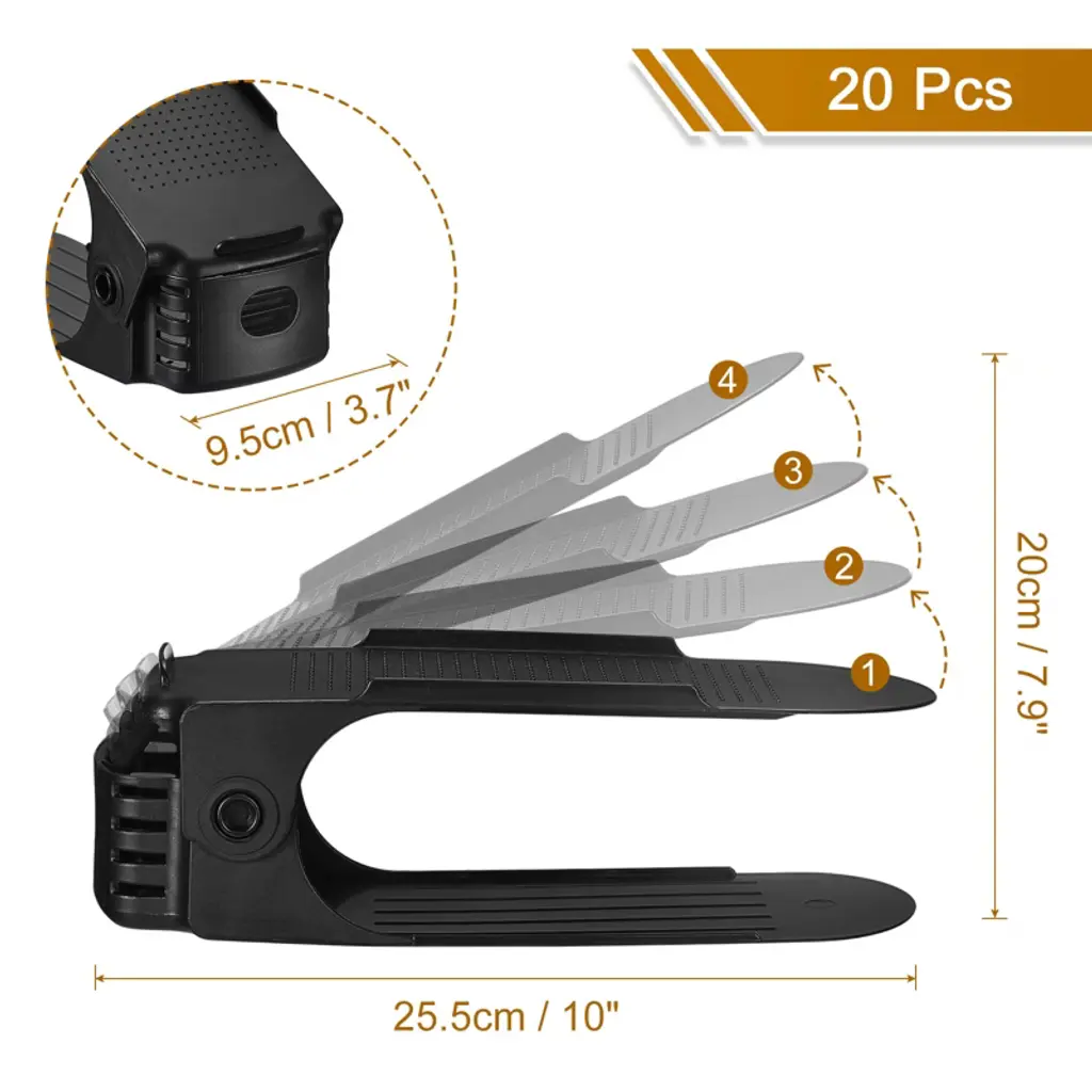 The shoe slots are designed to save up to 50% of storage space with their double-layered design, making your shoe closet or wardrobe more organized and tidy. They come equipped with a four-level height adjustment feature, allowing you to adjust the height according to the type of shoe to avoid squeezing or damaging them. Simply place one shoe on the first layer and the other on the second layer to create a tidy and space-saving shoe closet. The package includes 20 plastic shoe slots.
