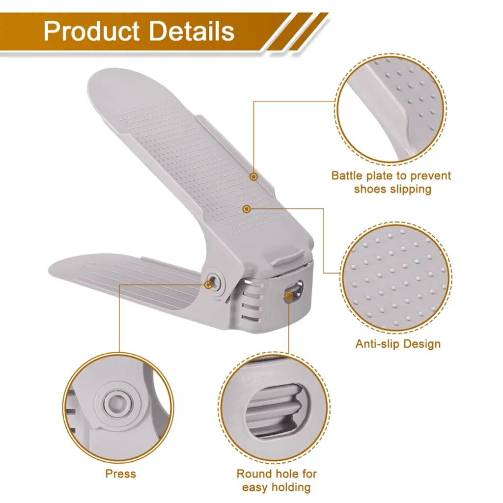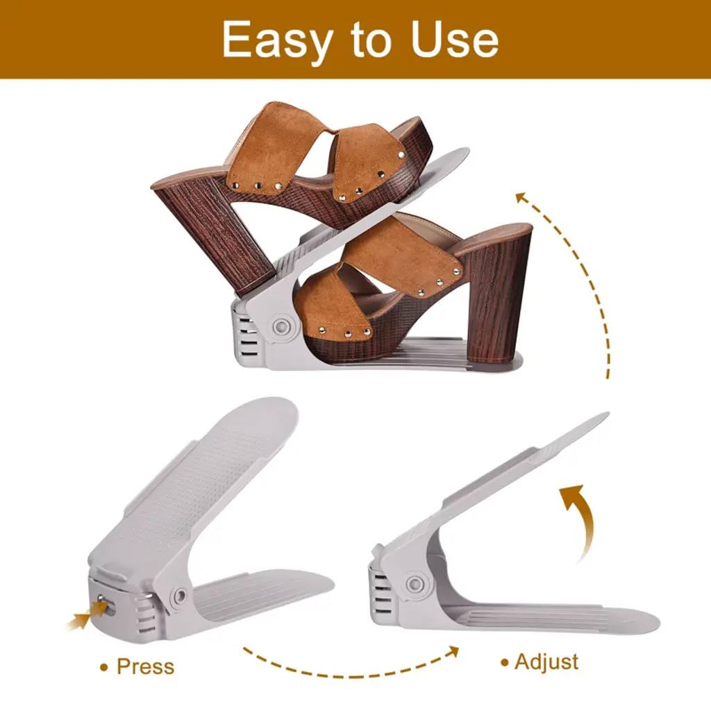 The shoe slots are designed to save up to 50% of storage space with their double-layered design, making your shoe closet or wardrobe more organized and tidy. They come equipped with a four-level height adjustment feature, allowing you to adjust the height according to the type of shoe to avoid squeezing or damaging them. Simply place one shoe on the first layer and the other on the second layer to create a tidy and space-saving shoe closet. The package includes 20 plastic shoe slots.