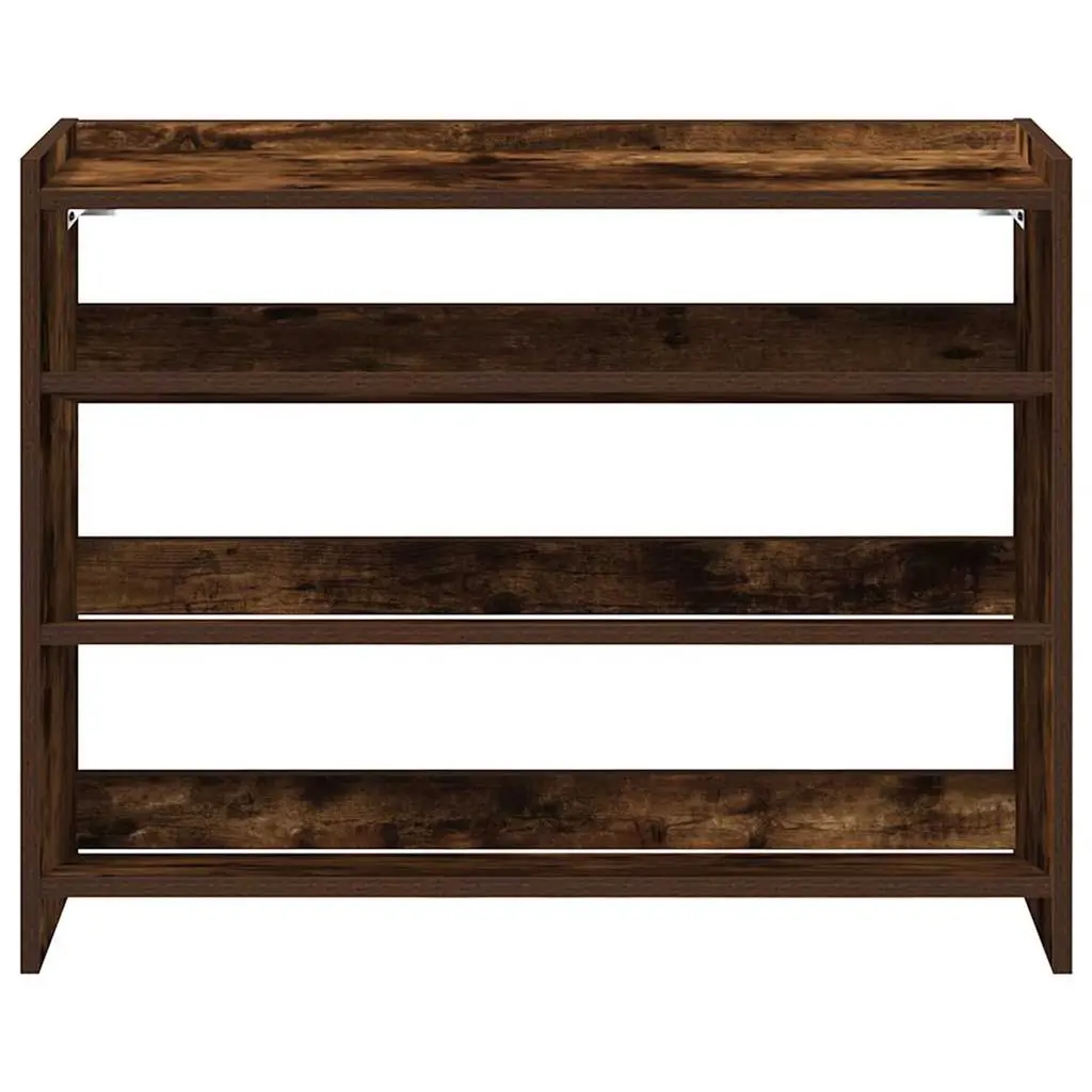 This Slim Smoked Oak Shoe Rack is a sleek way to keep your shoes neat at home. Its modern design fits perfectly into any hallway, not just keeping your shoes organized but also looking great. With a smooth touch and rich Smoked Oak finish, it neatly stores all types of shoes, ensuring your entryway stays tidy and welcoming. Ample Storage: With three roomy shelves, this shoe rack fits up to 12 pairs of shoes, keeping your entryway tidy and organized. Each pair is on display and easy to grab when you need them.Robust Construction: Made from durable engineered wood, this rack can hold a max weight of 132.3 lbs. It's designed for stability, so your shoes stay safely stored.Stylish Design: Its contemporary look, with clean lines and a smooth finish, adds elegance to any hallway. The smoked color is on trend and fits in with various interior styles.Versatile Placement: Ideal for indoors, the Smoked Oak Shoe Rack can go in entryways, hallways, or under stairs. Its slim build suits tight spaces without skimping on storage.Easy Assembly: This rack comes with straightforward instructions and all the bits you need to set it up. Just grab a screwdriver, and you’ll have your shoe organizer ready in no time.
