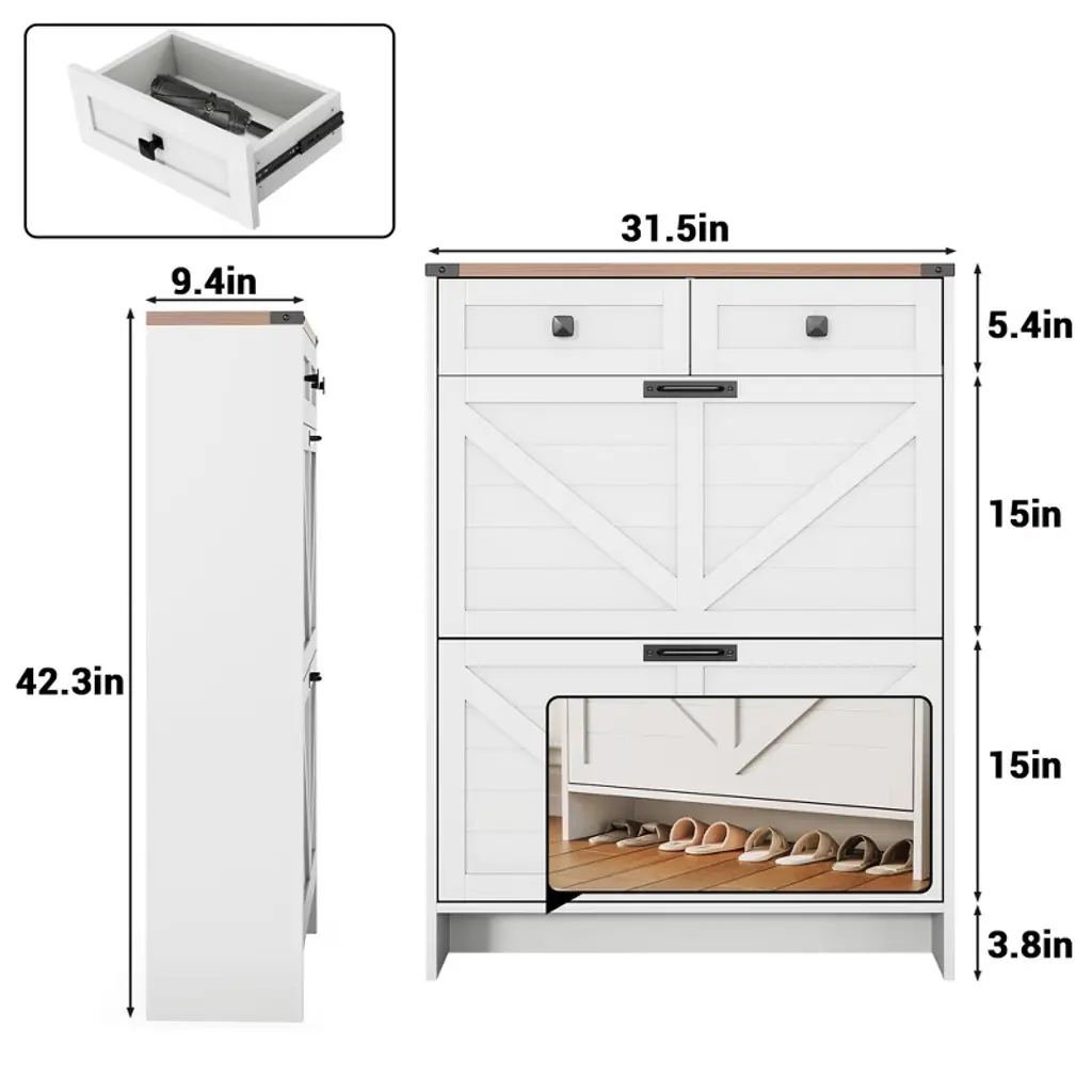 White Freestanding Shoe Storage Cabinet, Wooden Shoe Organizer With 2 Flip Drawers And 2 Storage Drawers, Narrow Shoe Rack Cabinets