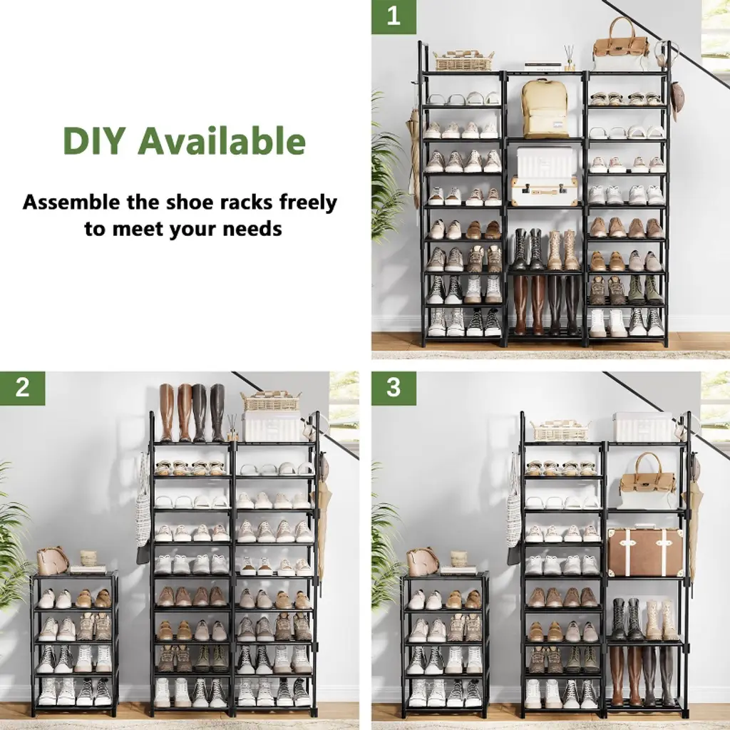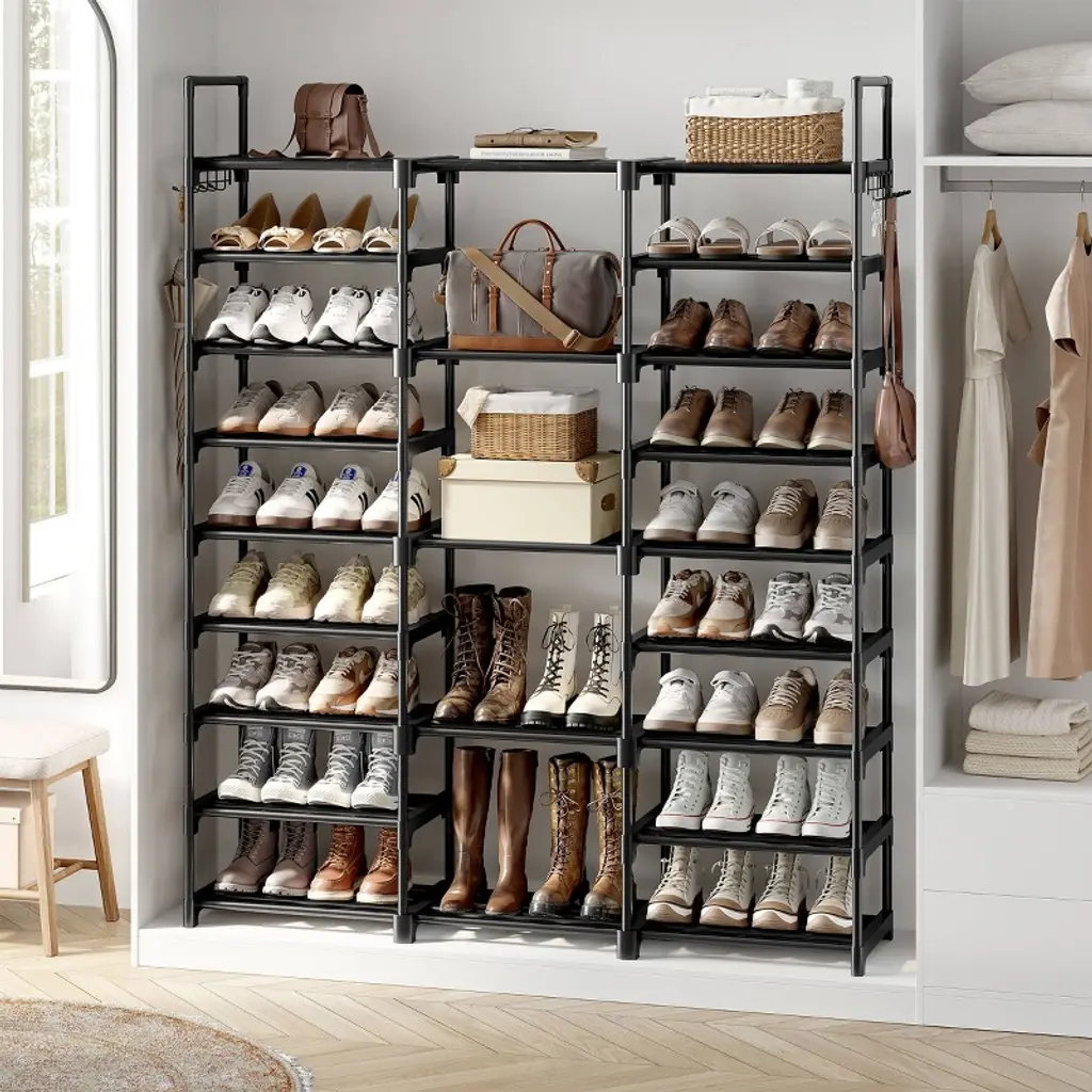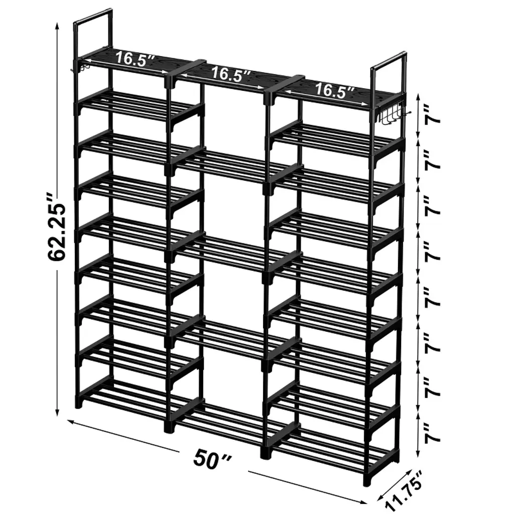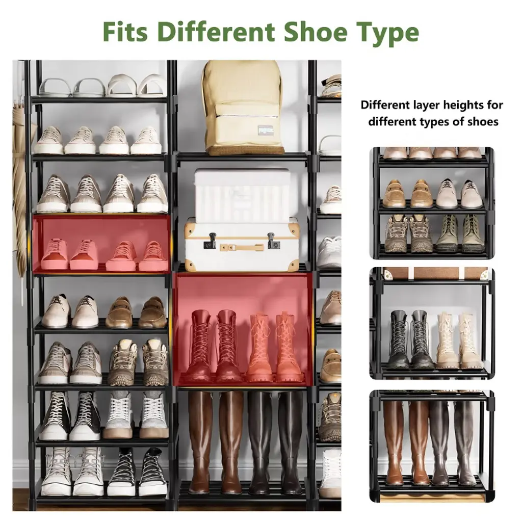 Meet the ultimate storage solution: this heavy-duty shoe rack measures 50L x 9.84W x 62.25H and holds 50+ pairs of shoes. Features a height-adjustable tier for boots, bags, or boxes, and a modular design perfect for closets, entryways, or garages. Built with a rust-proof industrial steel frame that stays rock-solid even when fully loaded. Sets up quickly without tools—just follow the clear manual and get organized in minutes.