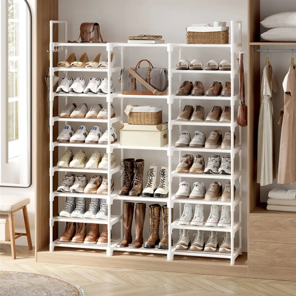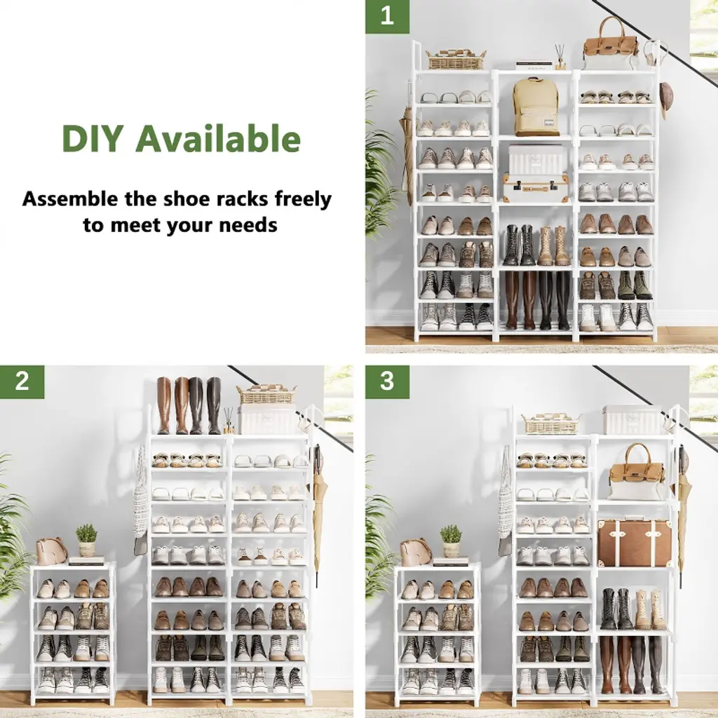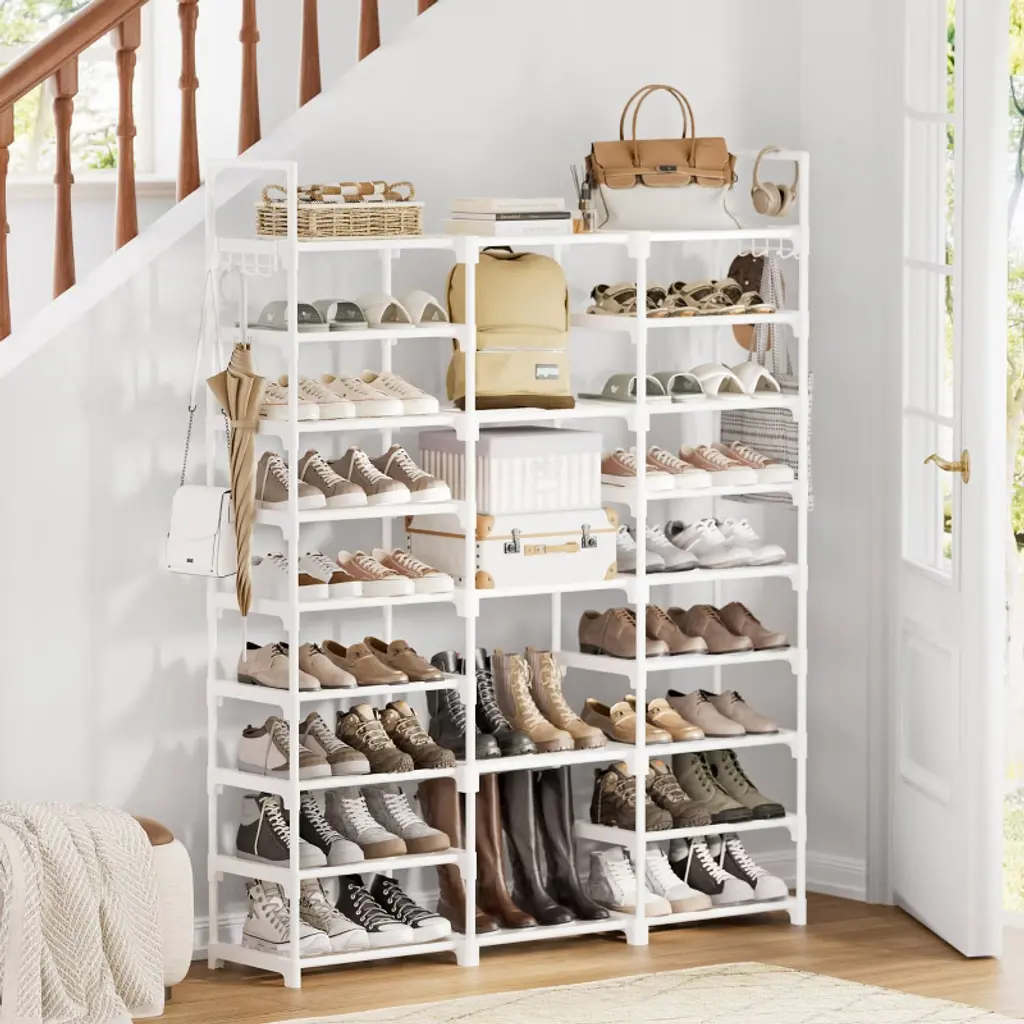 Meet the ultimate storage solution: this heavy-duty shoe rack measures 50L x 9.84W x 62.25H and holds 50+ pairs of shoes. Features a height-adjustable tier for boots, bags, or boxes, and a modular design perfect for closets, entryways, or garages. Built with a rust-proof industrial steel frame that stays rock-solid even when fully loaded. Sets up quickly without tools—just follow the clear manual and get organized in minutes.