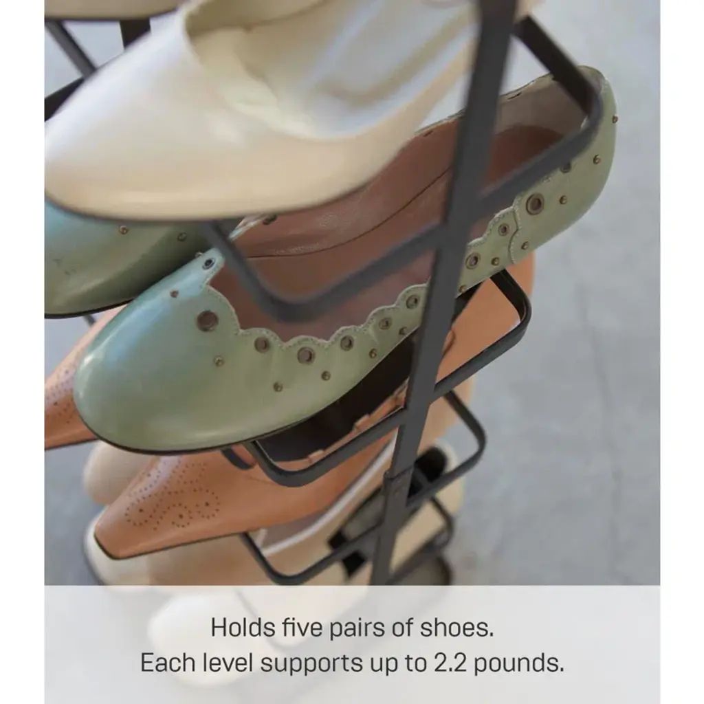 This simply designed shoe rack by Yamazaki is stackable to ensure maximum capacity. Each rack is beautifully designed to hold 5 pairs of shoes. Made for even the smallest of spaces. Sturdy steel frame and handle for easy maneuvering in and out of closets.