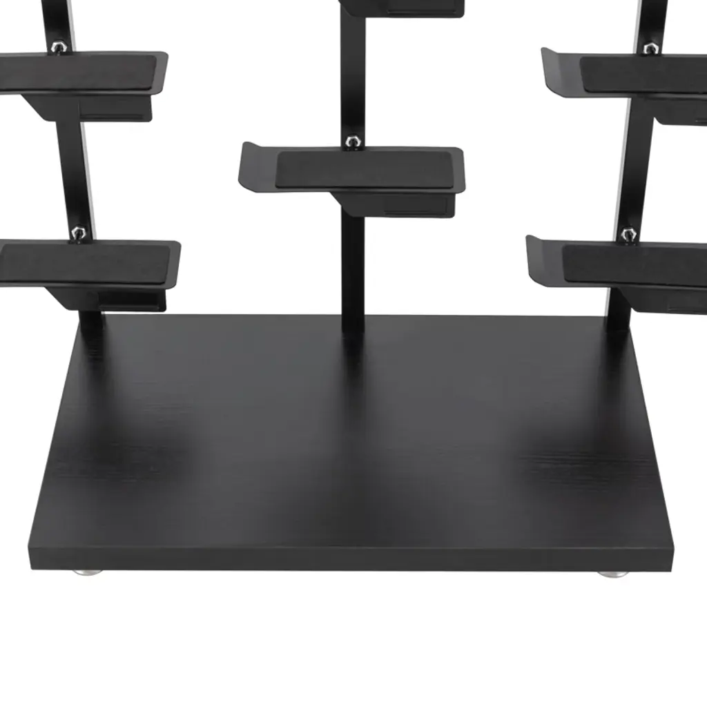 This modern minimalist three-column shoe rack is both stylish and practical. Made with a robust iron frame and oak base, it's durable, space-saving, and can display up to 9 pairs of shoes. The single-sided design offers clear visibility, while non-slip feet and sponge-padded holders ensure stability and protect your footwear. Easy to assemble, it's perfect for stores or home use, enhancing both organization and aesthetics.