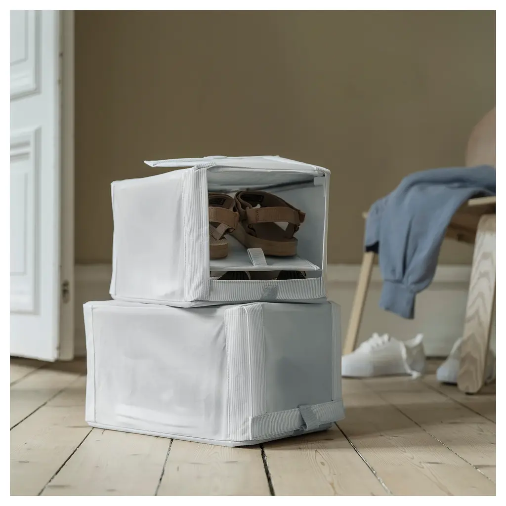 HEMMAFIXARE Shoe box - fabric stripe/white/gray 9x13x7 ". The box opens in the front so it’s always easy to reach your shoes, even if you stack several shoe boxes on top of one another. This shoe box fits perfectly in PAX wardrobe system, but can of course be used wherever you like.