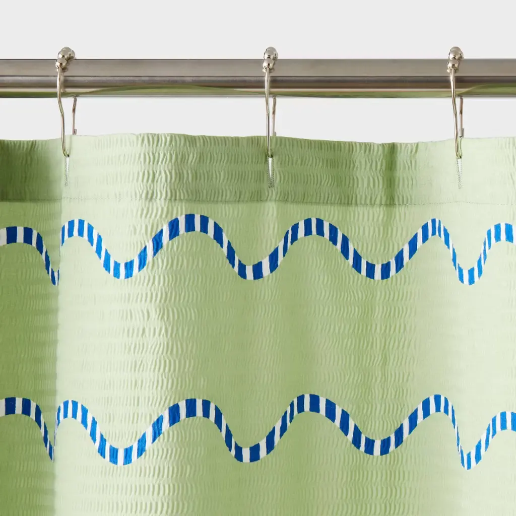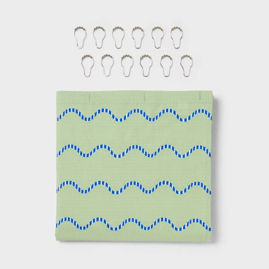 Refresh your shower space with this 13-Piece Fabric Shower Curtain Set from Room Essentials™. The multi-piece set includes a fabric shower curtain made of 100% recycled polyester and 12 metal rings for easily hanging the curtain from the rod. The shower curtain is machine washable for convenient cleaning and the rings slide smoothly along the rod, making a practical choice for a clean, uncluttered shower setup.Room Essentials™: Everyday Value