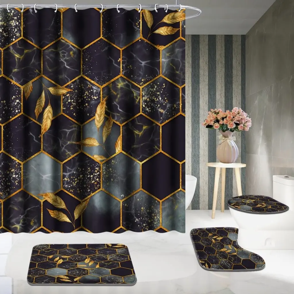 4 Pcs Bathroom Shower Curtain Set,bathroom Sets With Rugs - Marble-02