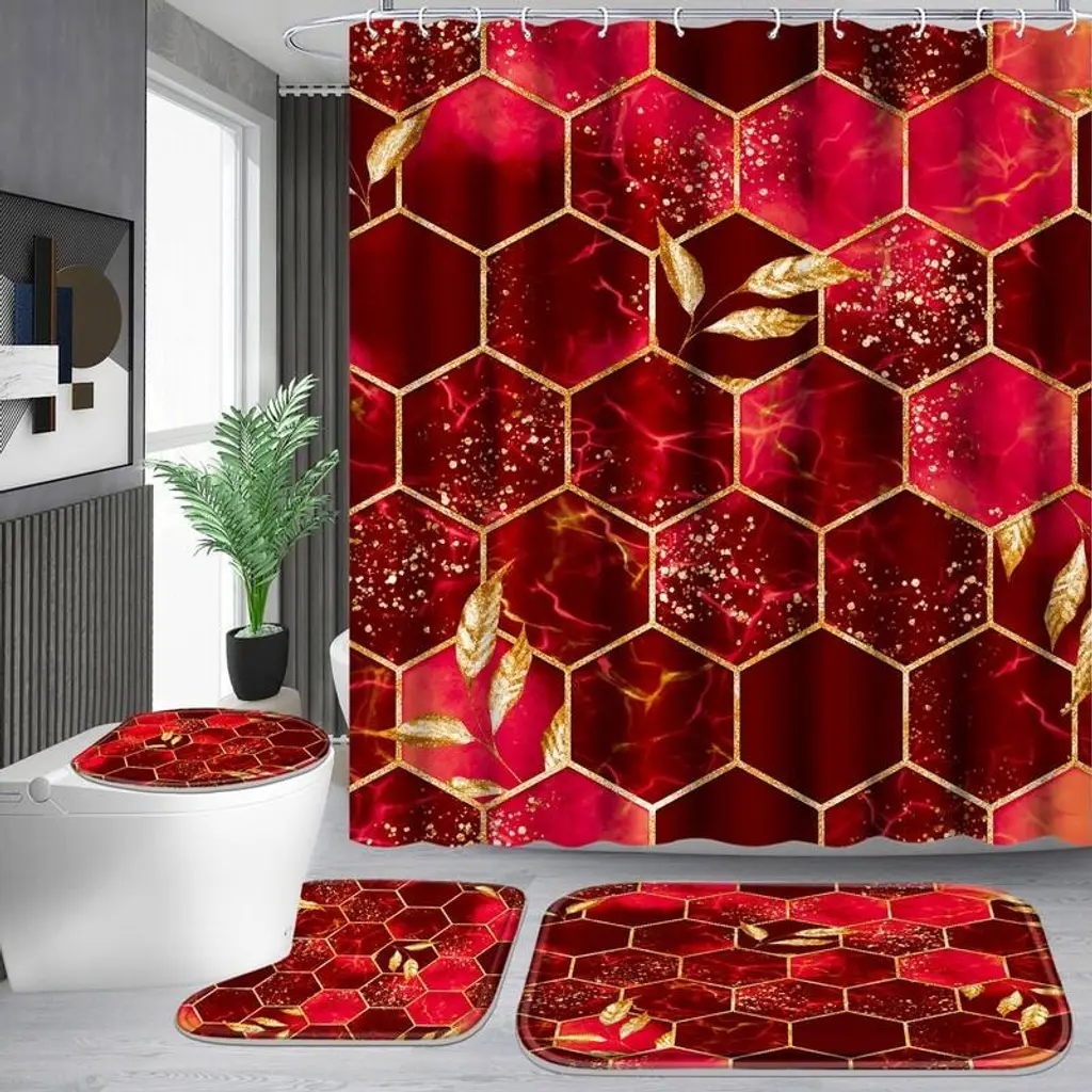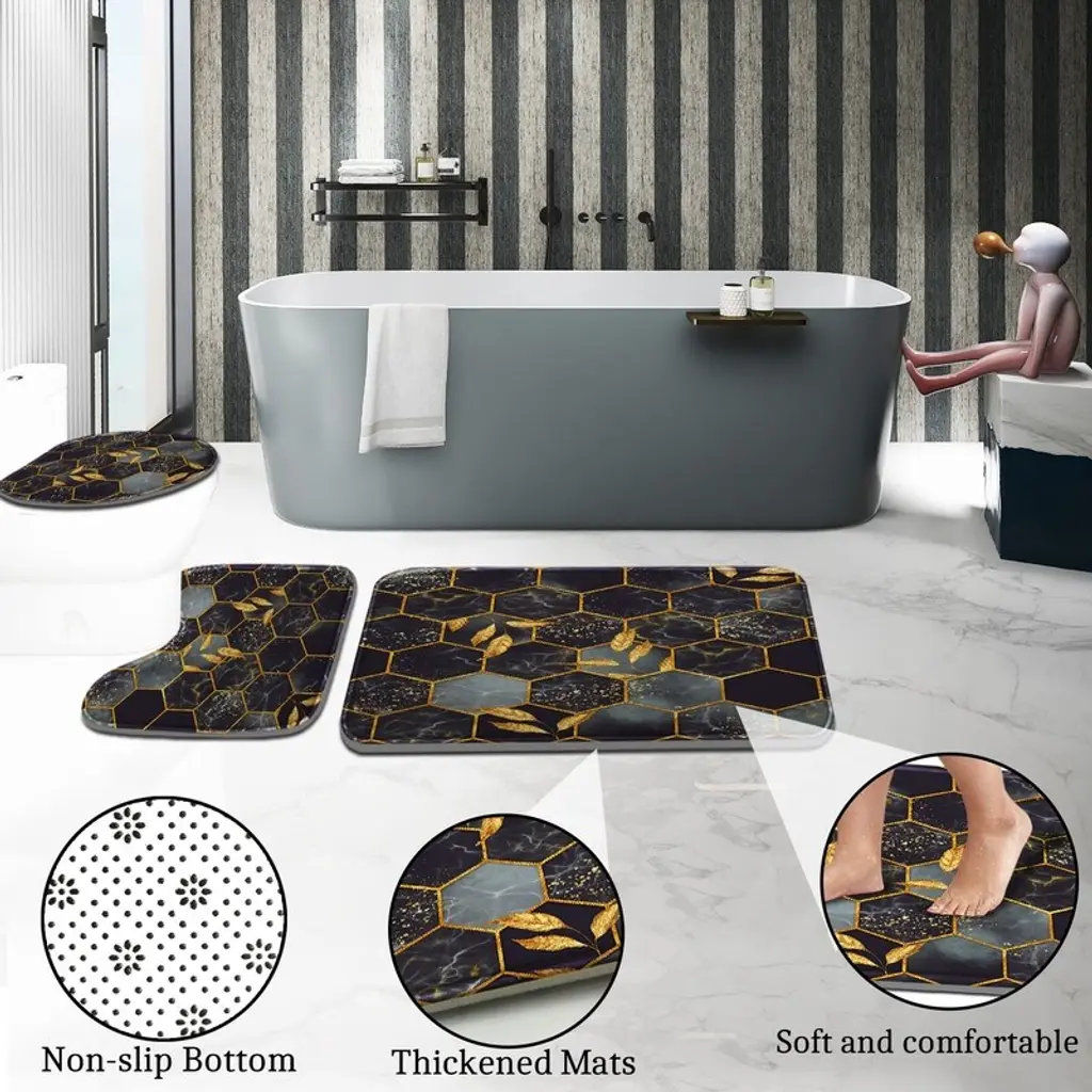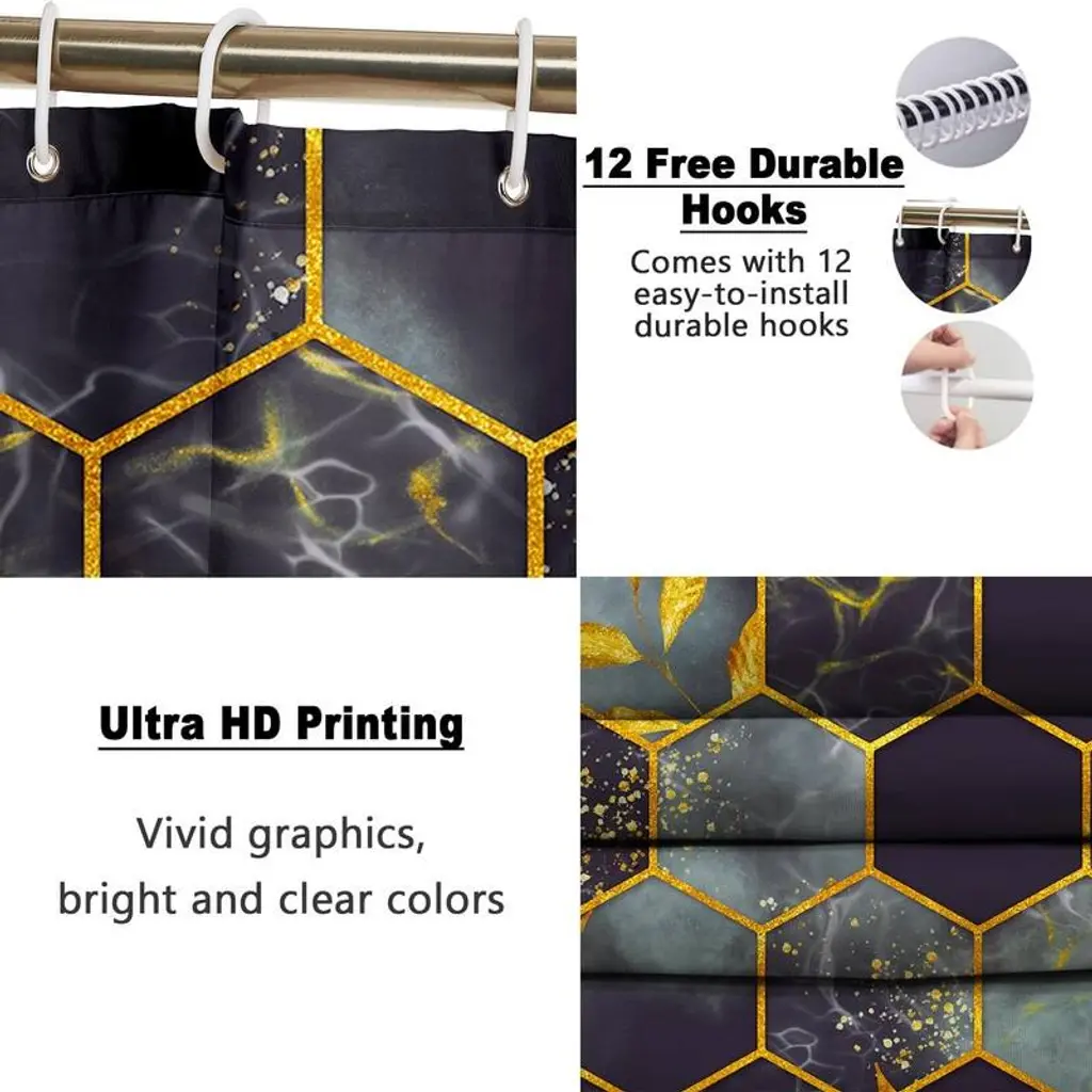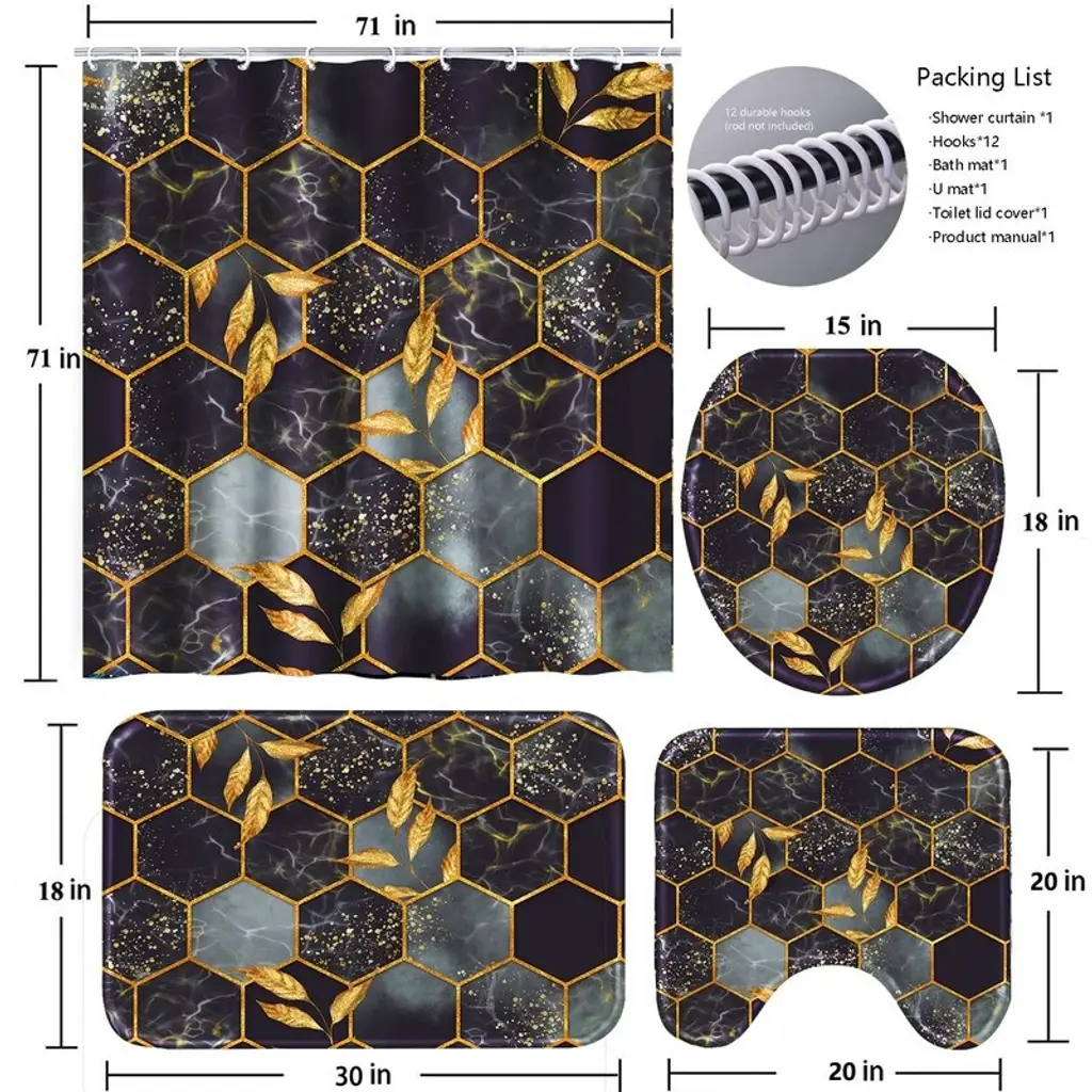【Bathroom set】This Honeycomb Navy shower curtain set is made of environmentally friendly polyester fabric, which can make the water dry quickly and prevent water from splashing on the floor. The durable thick coral velvet bath mat is soft and comfortable, which can quickly absorb dripping water and help you keep it The floor is dry and tidy. It has no chemical smell and will never cause any harm to your family. 【Improved craftsmanship and materials】The products currently in stock adopted new craftsmanship and new materials, which solves the problem of upturned mats. When you receive the bathroom shower curtain set, just take out the mats and put them on floor for a few hours(about 4-6 hours), then they'll return to their original shape-Normal floor mats, U-shaped mats and toilet lid cover mats,Lying flat and comfortable. 【Good Sizes】Waterproof shower curtain size:72"x72" W, O shape toilet lid cover size: 18"x16"W, Non-slip flannel bathroom mat sizes: 30" L X 18" W, U shape rug sizes: 20" L X 20" W. This shower curtain set has been enlarged in size and thickened thickness, which is suitable for most family bathrooms 【Easy installation】We give 12 hooks for free. No need to worry about how to install it. 12 reinforced head grommets, simple suspension; weighted bottom hem to maintain perfect drape; toilet seat cushion has a durable elastic band for fixing; the floor mat has a unique bottom dotting non-slip design that is not easy to move, ensuring safety. You can use this Honeycomb Navyshower curtain set to bring new life to your bathroom, walls, and windows. 【Tips for You】No.1-The fluorescent effect of the mobile phone or computer may cause a few color difference between the product picture and the actual product, which is a normal phenomenon, please forgive its existence. No.2- Due to the vacuum packaging, the mats has not returned to its original shape when the package is opened, please be patient for a few hours.If the mats do not lay flat, soak and hang to dry them to solve the problem.Any questions please don't forget to contact us anytime.