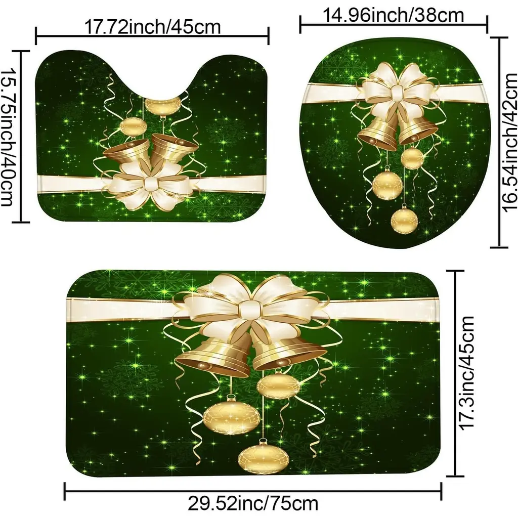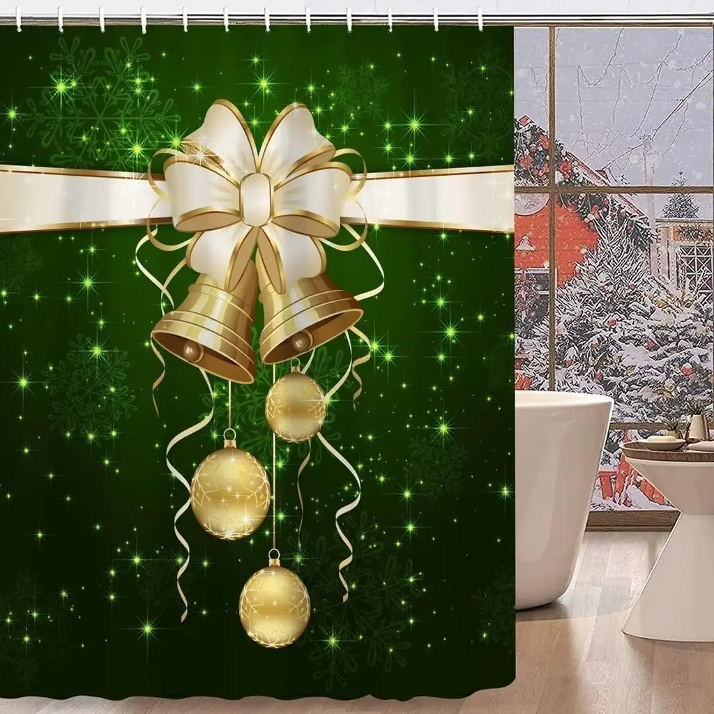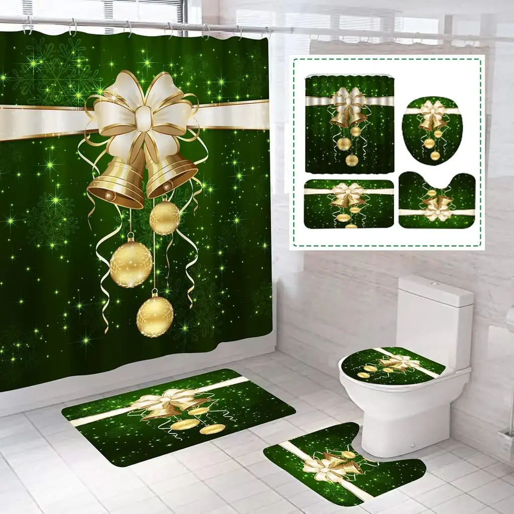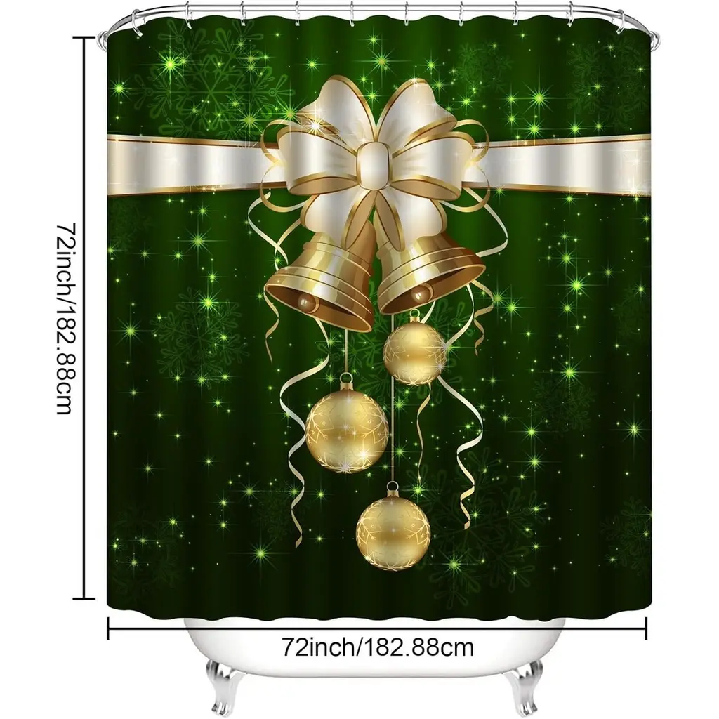 Create a festive bathroom ambiance with this 4-Pcs Christmas Shower Curtain Set, featuring a beautifully designed golden bell and green decor motif. The set includes a 72" x 72" shower curtain, adding seasonal charm and privacy to your space, along with matching hooks and a non-slip rug to complete the look. Crafted from durable, water-resistant material, this set ensures lasting use throughout the holiday season. Easy to install and maintain, it's the perfect way to bring the warmth and joy of Christmas into your home.