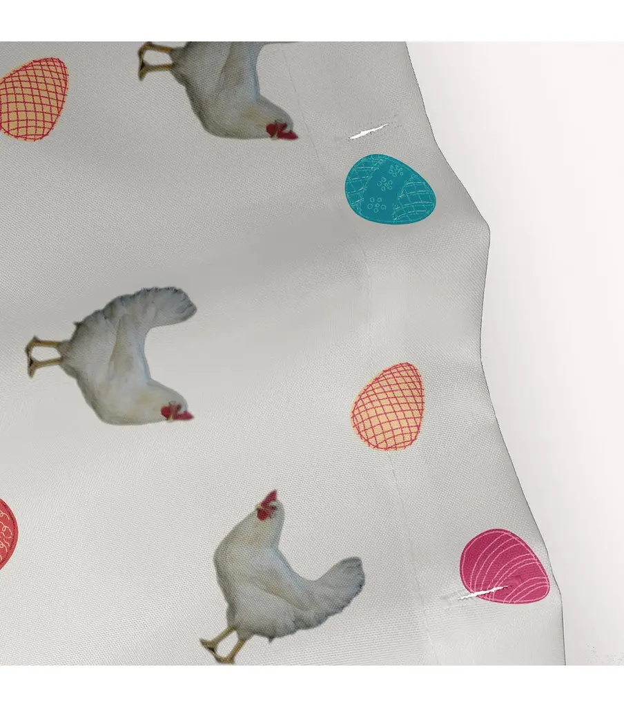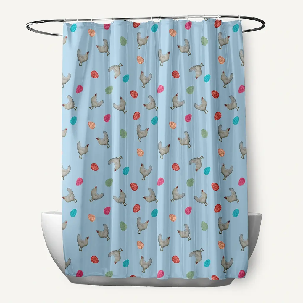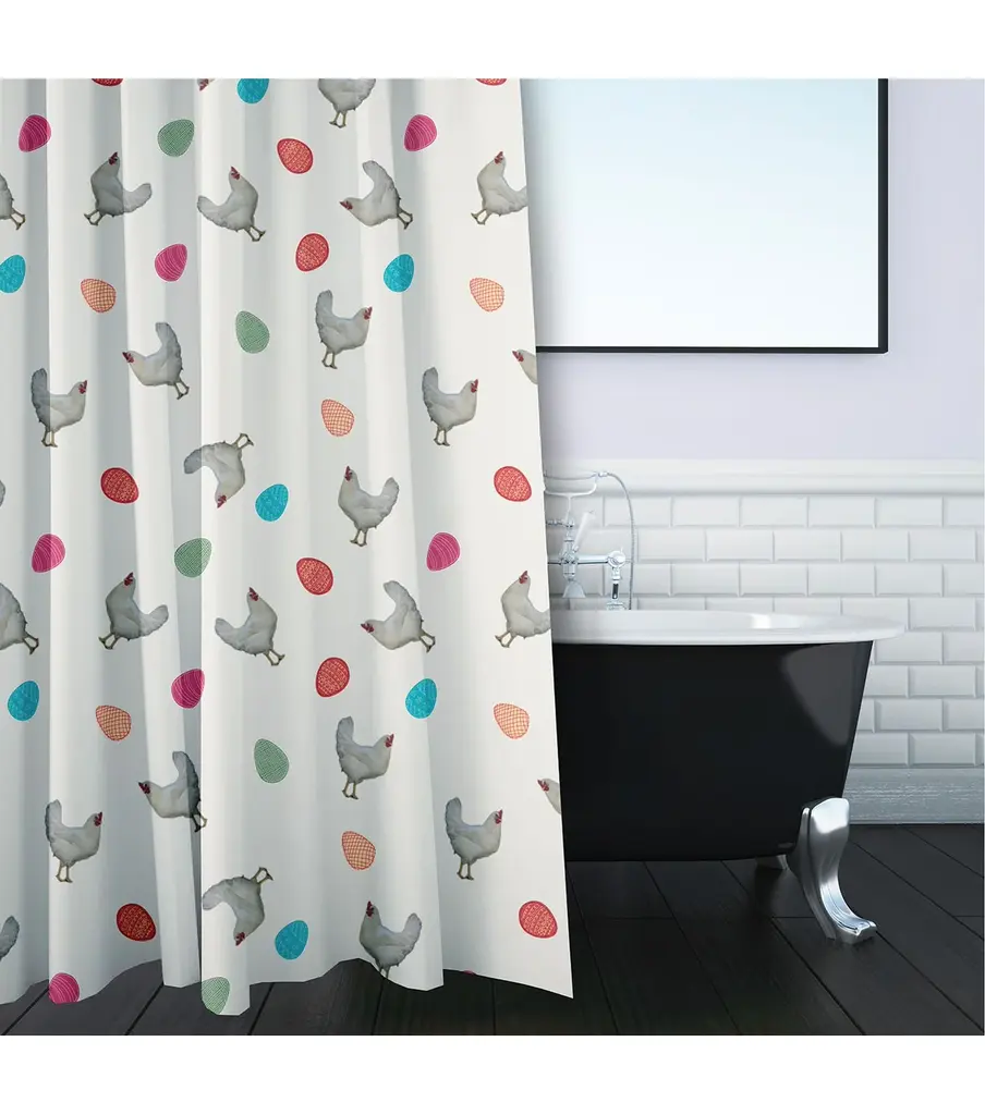 Enjoy a new style this season with a Simply Daisy 70" x 73" Whisper White Chickens and Eggs Shower Curtain from our Funky Junky Collection.This durable and decorative polyester fabric shower curtain has a single sided design and a buttonhole top to easily refresh your bath for each season. It is made of 100% polyester that is quick drying. When it needs to be washed, just toss it into your washing machine, and then tumble dry. Everyone will enjoy the charm and style brought to your bath space by this decorative shower curtain! The combination of bright colors and charming designs from this collection are the perfect way to enliven your home decor.