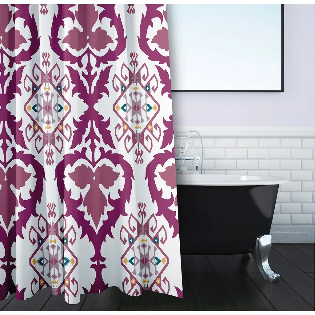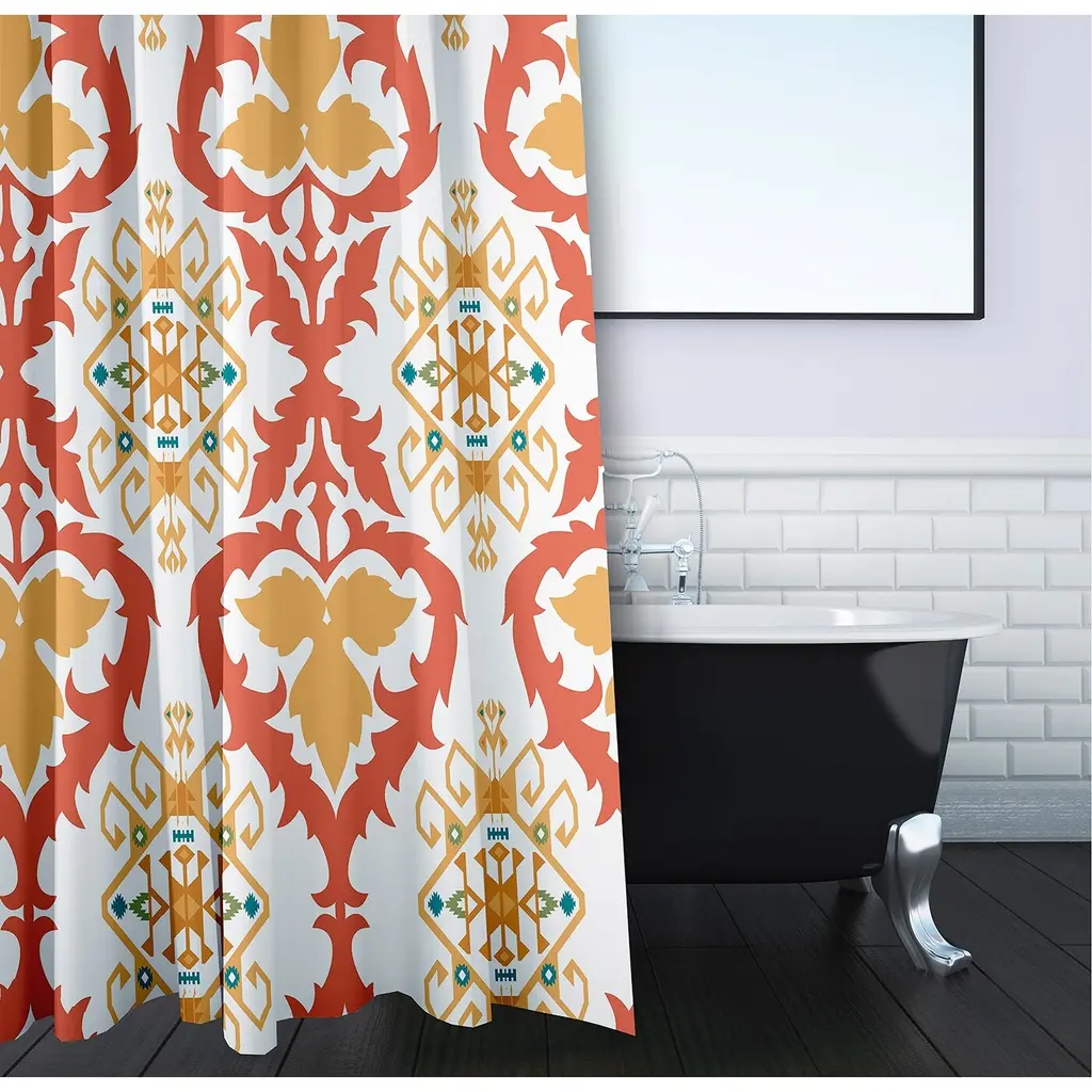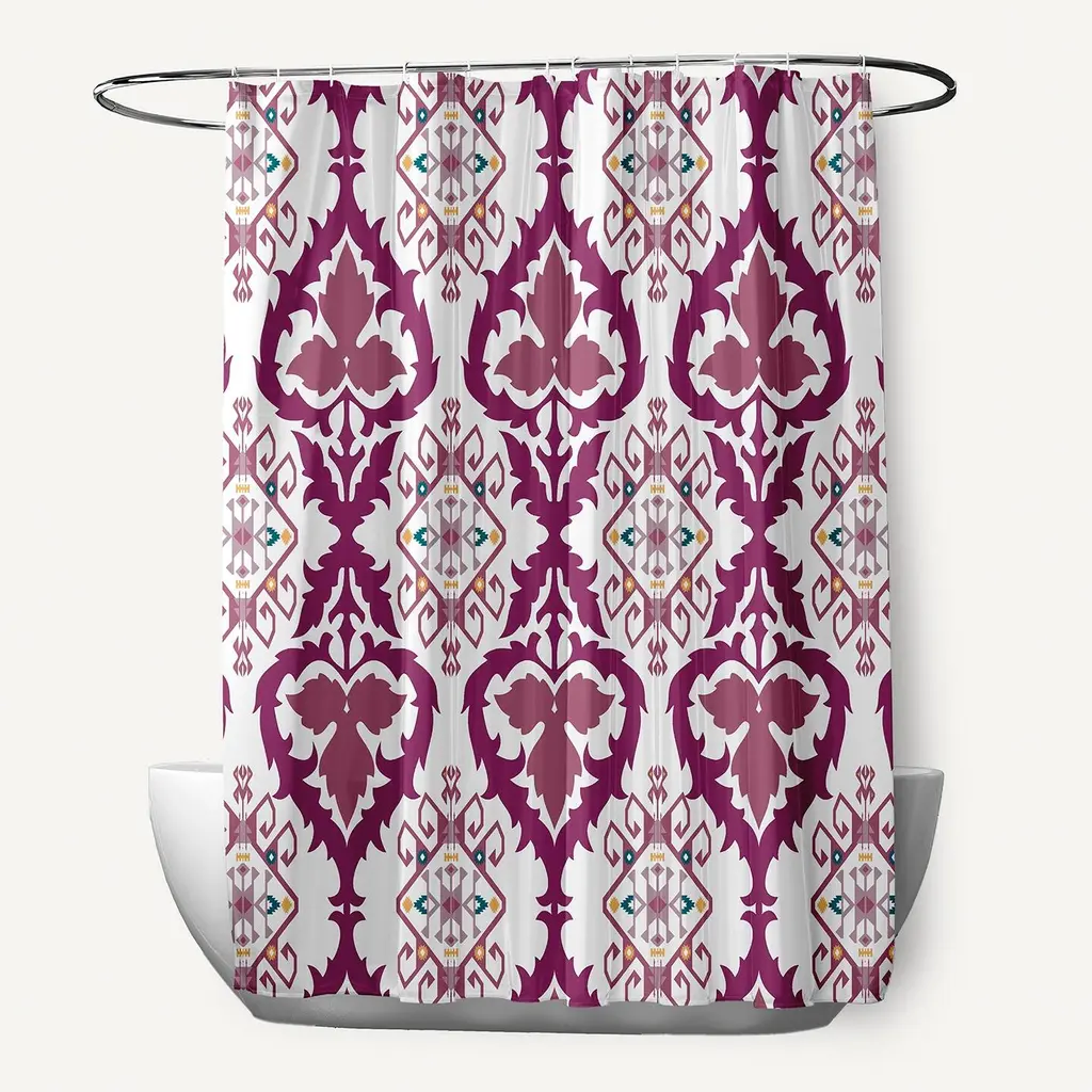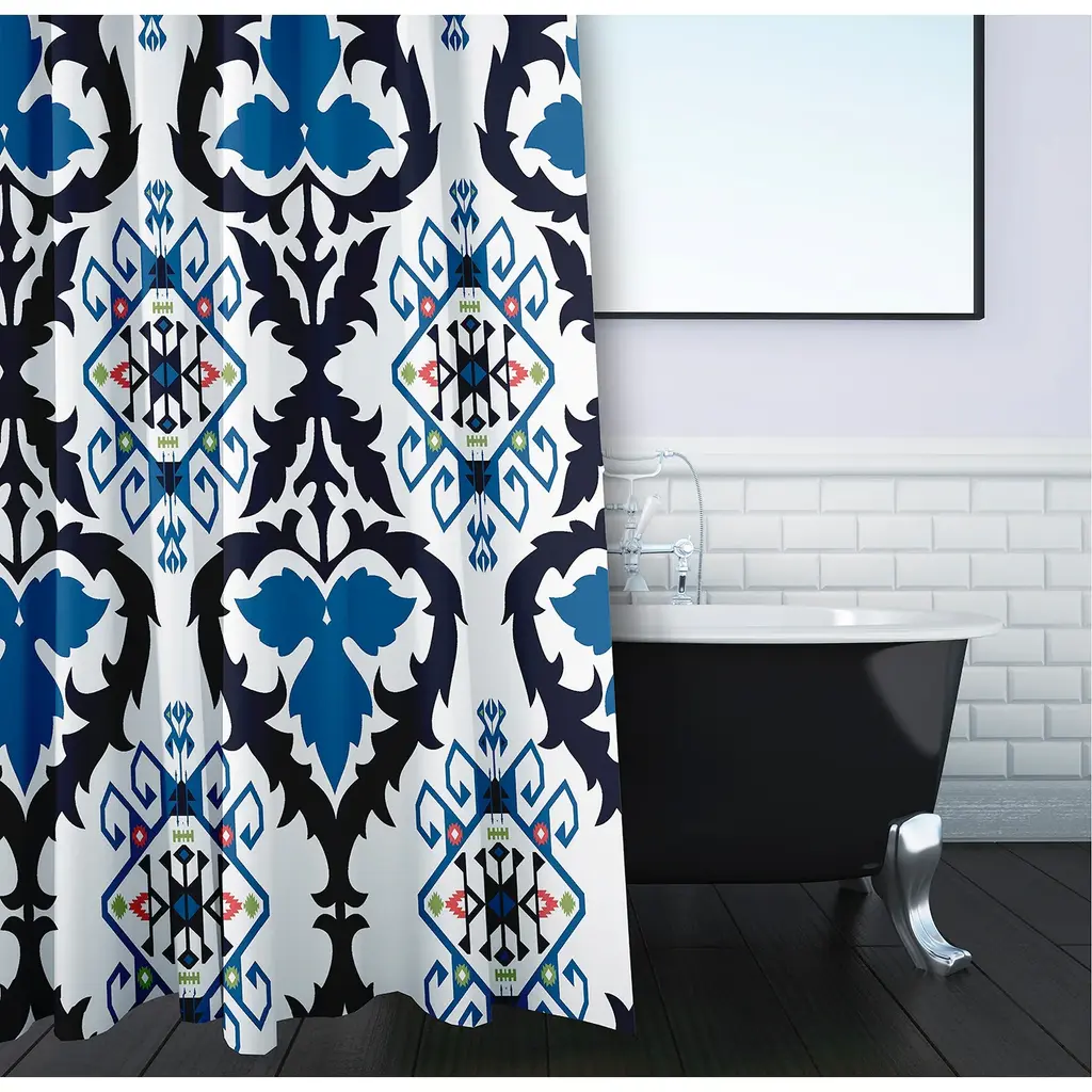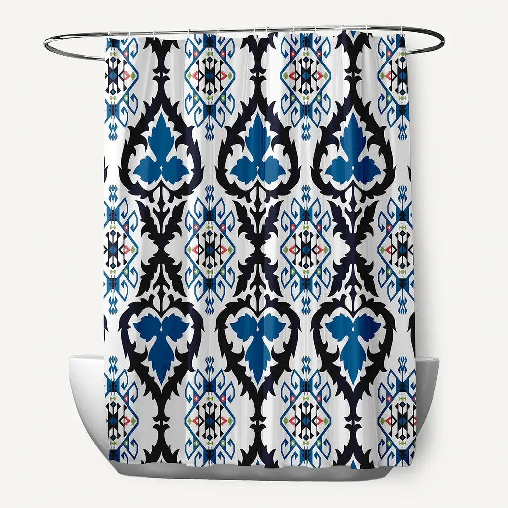 Create a colorful and radiant vibe around your home with the Navy Bombay shower curtain from our Happy Hippy Collection. All the designs in this collection will make you smile as you bask in the color brought to your home. Features:Durable Polyester FabricQuick DryingMachine Washable71" x 74"12 Button Holes for hook placementPattern: IkatStyle: French CountryColor Choices: Navy, Green, Orange, Purple