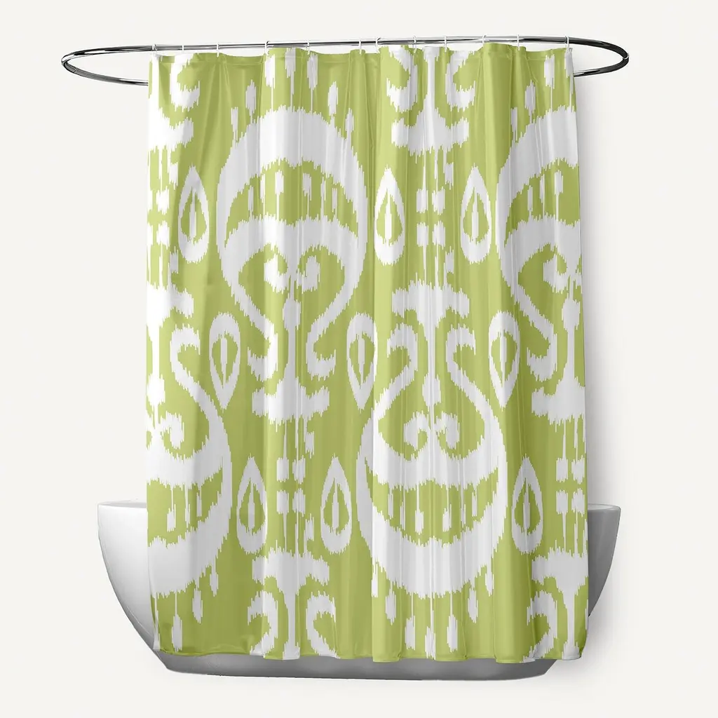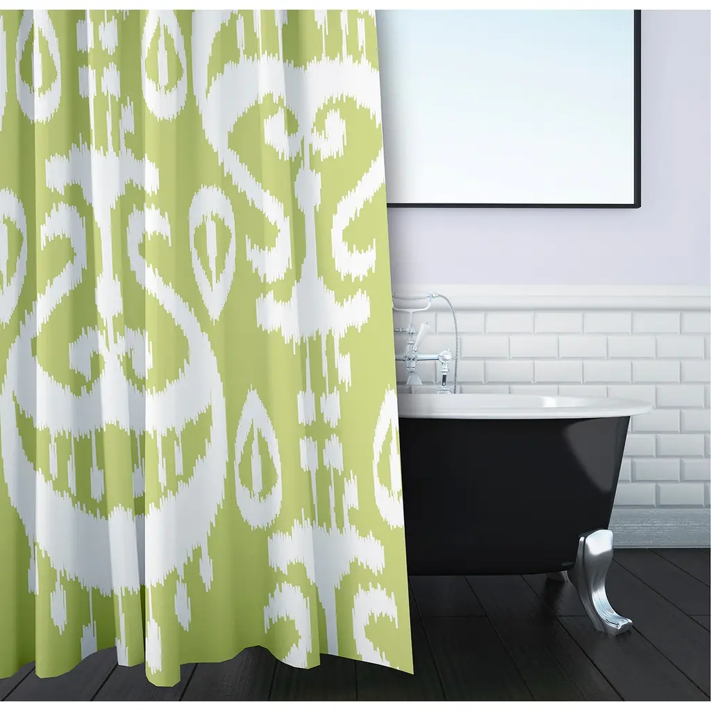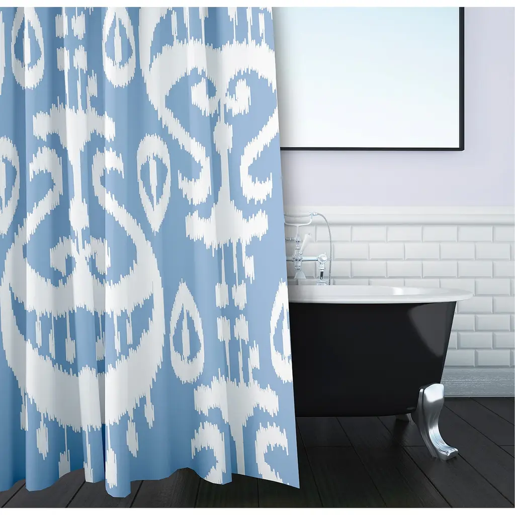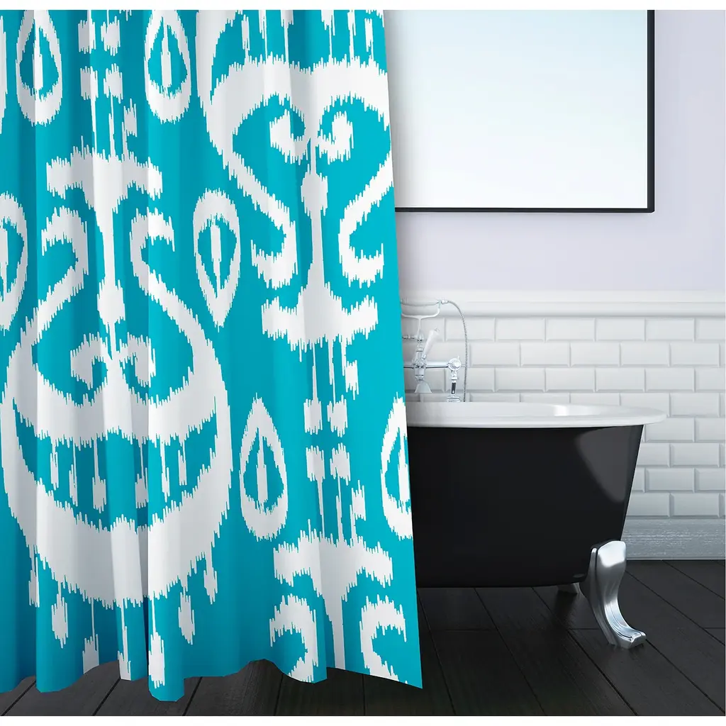 Create a colorful and radiant vibe around your home with the Black Ikat shower curtain from our Happy Hippy Collection. All the designs in this collection will make you smile as you bask in the color brought to your home. Features:Durable Polyester FabricQuick DryingMachine Washable71" x 74"12 Button Holes for hook placementPattern: IkatStyle: French CountryColor Choices: Black, Blue, Turquoise, Green, Grey, Yellow