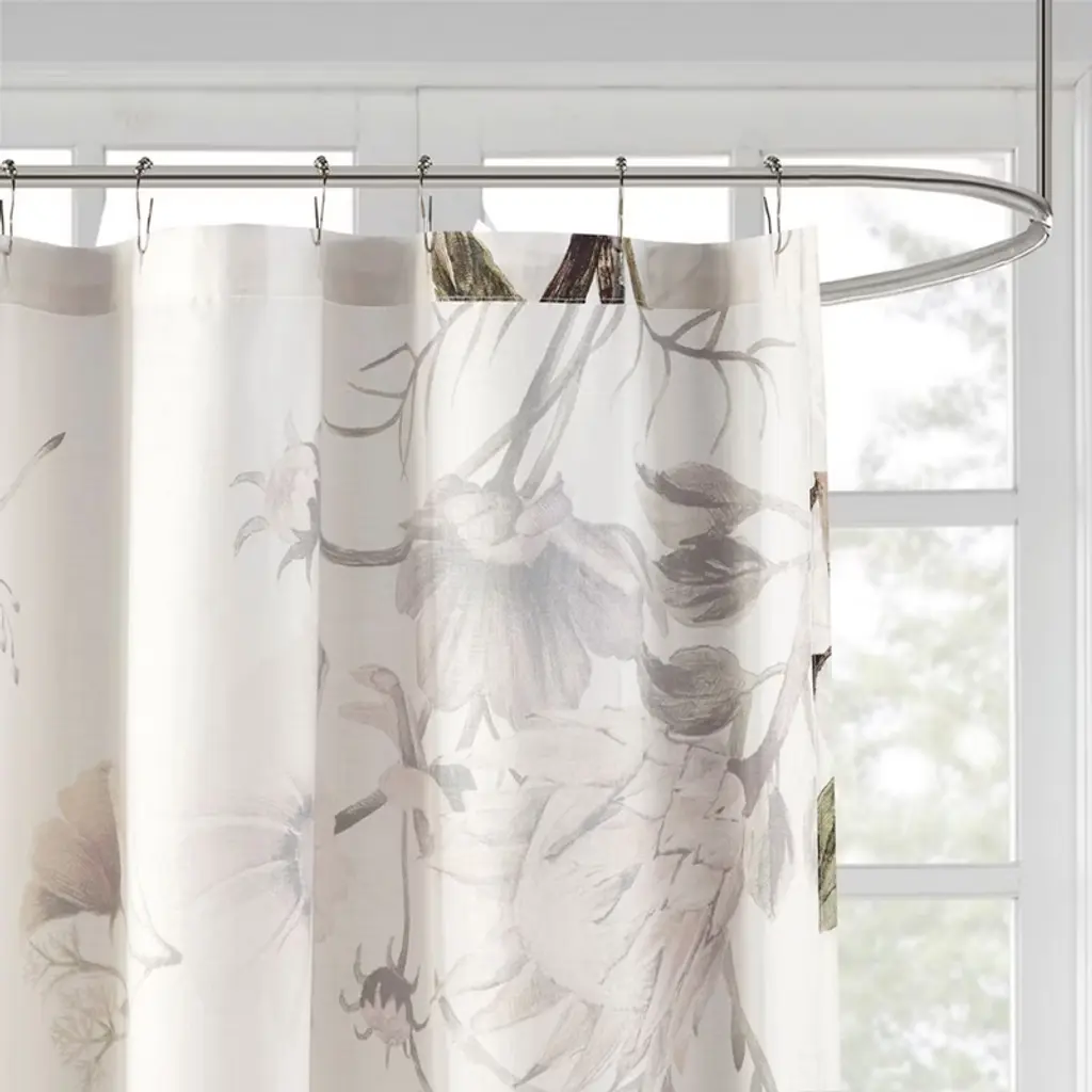 The Madison Park Cassandra Printed Cotton Shower Curtain offers a beautiful shabby chic update to any bathroom. Made from 100% cotton percale, this shower curtain features a large floral print in soft blue hues on a grey ground to create a gorgeous and unique design. With a soft and romantic color combination, this shabby chic shower curtain is the perfect touch to flourish any decor and bathroom. Machine washable for easy care, this shower curtain is also OEKO-TEX certified meaning it does not contain any harmful substances or chemicals to ensure quality comfort and wellness. Each shower curtain measure 72"x72" and is finished with 12 button holes at the top making it easy to hang; hooks, rod, and a water repellant liner are not included and will need to be purchased separately. Complete the look with coordinating bedding, available and sold separately.