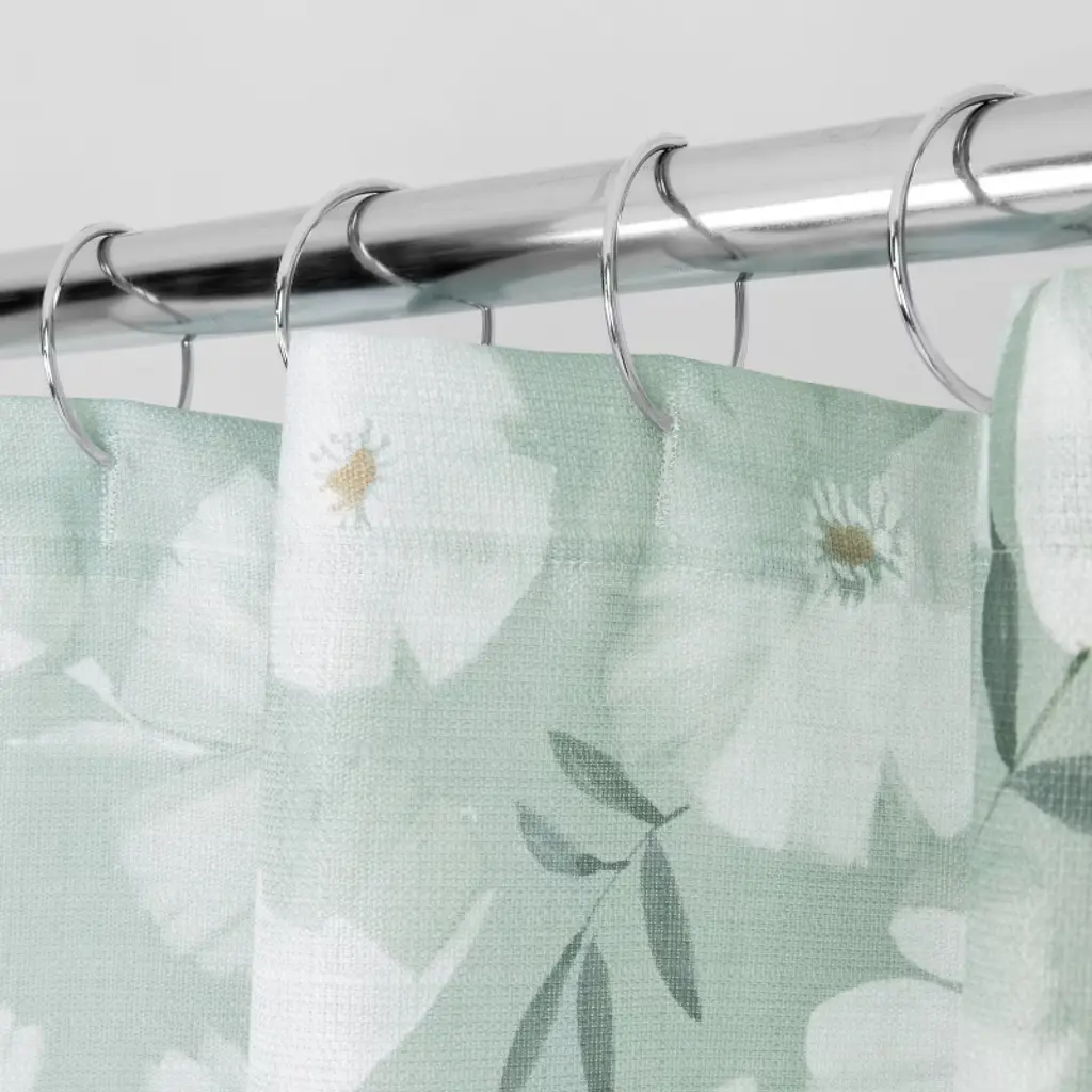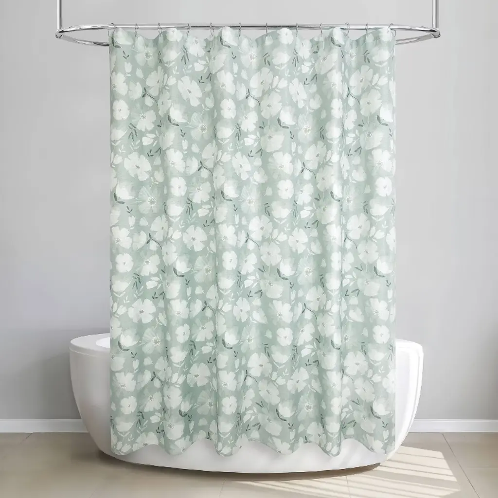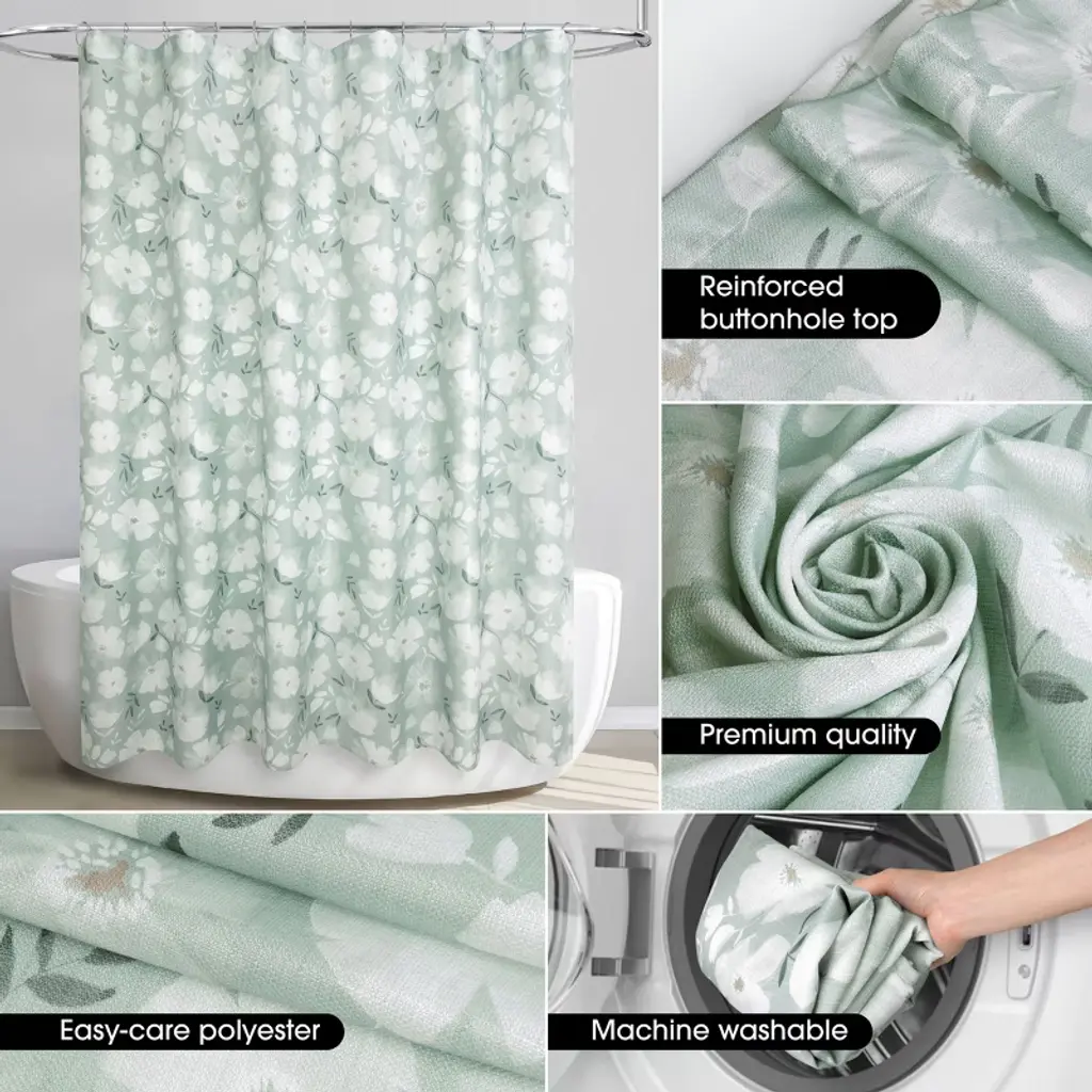 Shower your space in a garden of floral blooms with the Monotone Floral Sage Shower Curtain by Allure Home Creation. This soothing, all-over print, in soft monochromatic shades of sage with dusted white, features a scattered array of watercolor florals. The soft, relaxed feeling of this design will bring a feeling of calm to your peaceful bathroom retreat. This printed shower curtain measures 72" x 72" and fits most standard sized tubs and shower areas providing privacy as well as protection from water splashing onto the floor. Crafted from 100% easy care polyester linen grid look fabric with a reinforced buttonhole top that works well with standard shower hooks and curtain rods. Use of a liner is recommended. Machine wash and tumble dry on low heat.