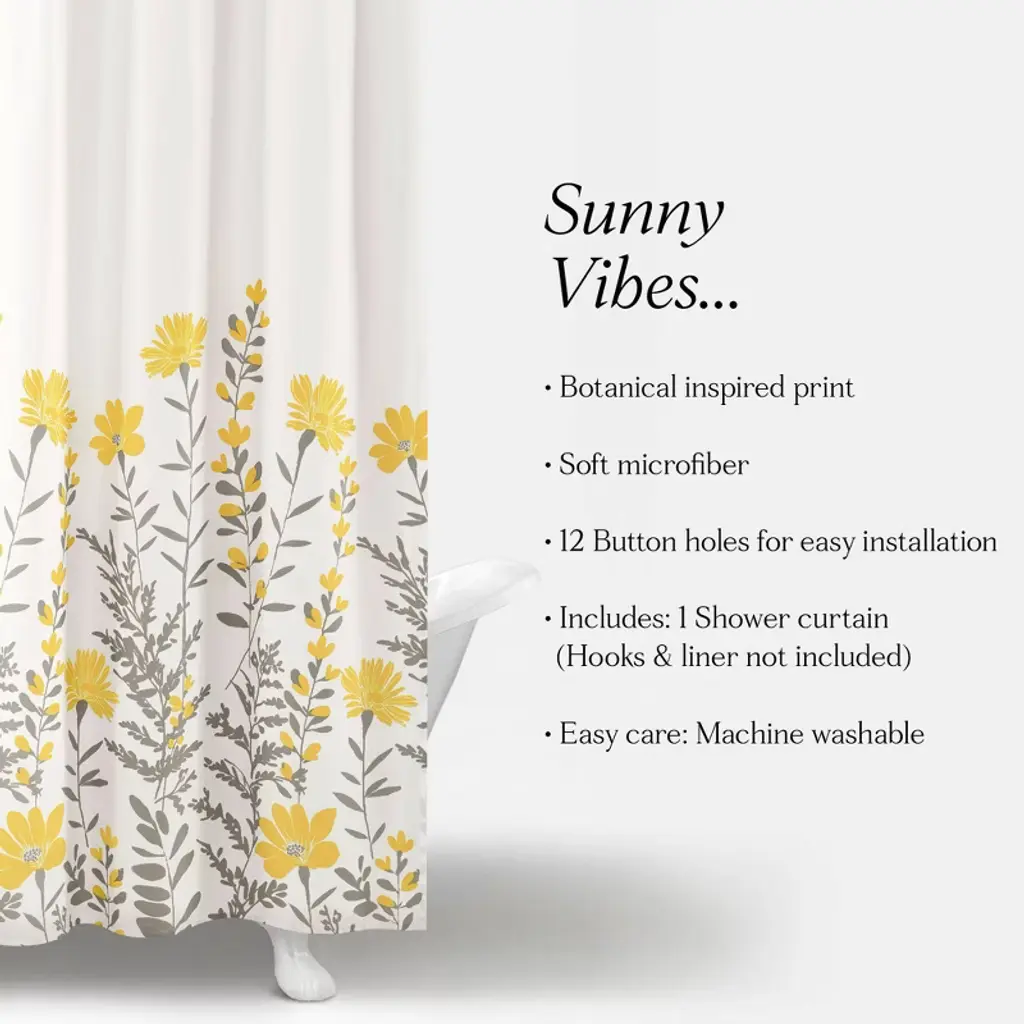 Brighten your bathroom with the blooming florals of our Aprile Shower Curtain. This print embodies the spirit of spring with a gorgeous garden of yellow flowers & gray vines flowing upward from the bottom of the curtain. This Aprile Shower Curtain would add understated elegance to your space. The design will transport you and your guests to a flowery pasture or meadow. Turn your primary, guest, or child's bathroom into a spa-like experience with our charming floral shower curtain. The colorful design on a white background radiates beauty and easily matches with your existing bathroom decor. This colorful flower print shower curtain measures 72 inches wide by 72 inches long and is crafted from soft microfiber. The elegant design is sure to make a statement in your modern farmhouse, cottage, or French country styled bathroom. The 12 button holes at the top of this shower curtain make it easy to hang with hooks or rings, ensuring a simple installation process. Because this is a fabric shower curtain, we recommend pairing it with a liner, sold separately. This shower curtain offers easy maintenance, simply machine wash cold on gentle cycle and tumble dry on low. If needed use a non-chlorine bleach for cleaning or an iron on low heat to release wrinkles. Please refer to the product label for full care instructions.