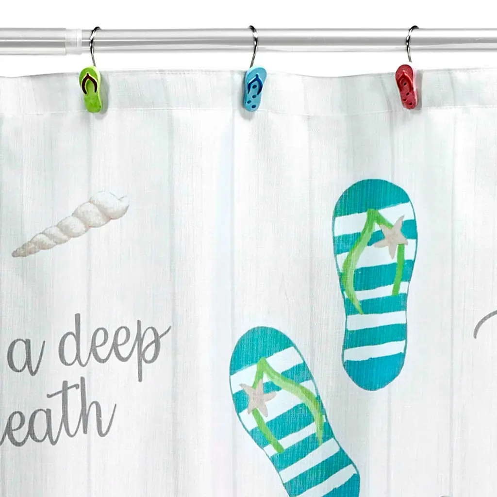 The Avanti Beach Mode Collection Shower Curtain is decorated with beach sayings, flip-flops in blue, green and pink and sunglasses. The background is a white shiplap design with a sand base at the bottom. Printed on 100% polyester, 72 x 72 in. and coordinating pieces available.