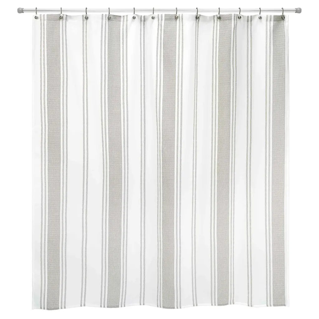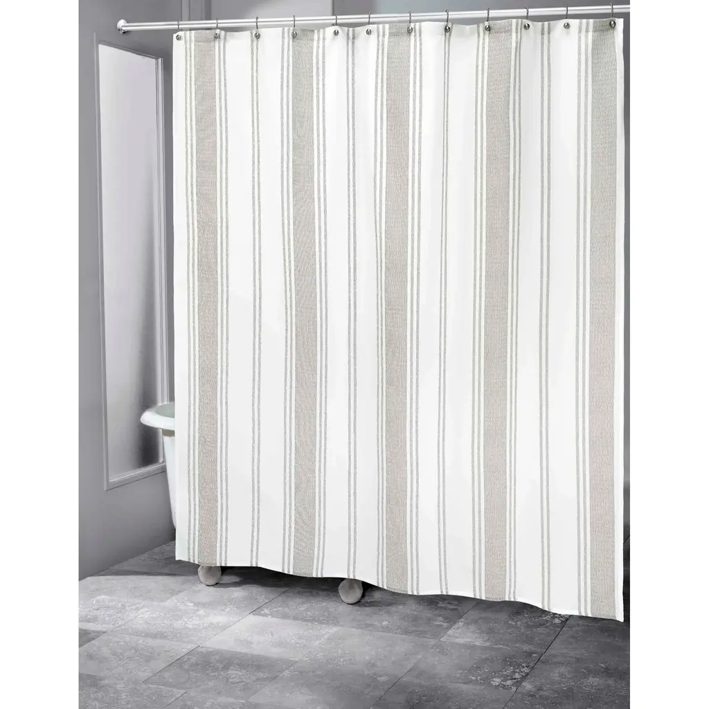 The Avanti Kyoto Tan Shower Curtain features a textural geometric design in tan and white with a repeating trio of vertical stripes running top to bottom. Woven of 100% polyester, this timeless yarn-dyed jacquard design will fit in almost any décor. 72" x 72", machine washable, air dry.