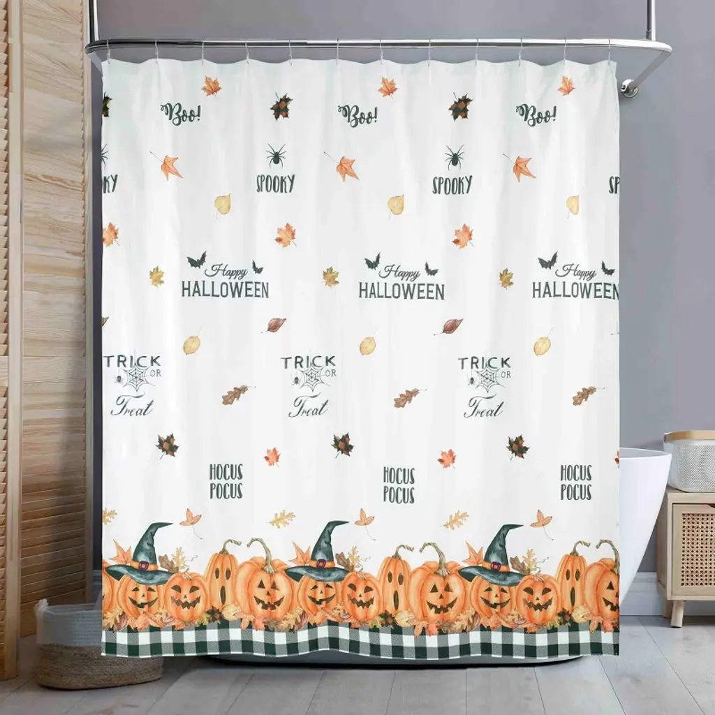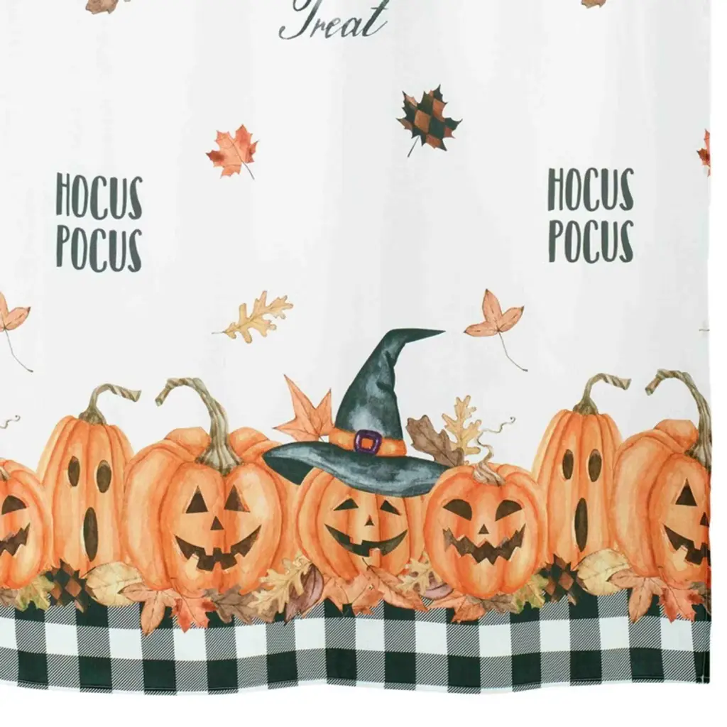 The Avanti Pumpkin Patch Decorative Halloween Shower Curtain features holiday sayings surrounded by falling leaves on a white ground. The bottom border is filled with various jack-o-lanterns with a black and white check border. Printed on 100% polyester for easy care and bright colors, 72" x 72".