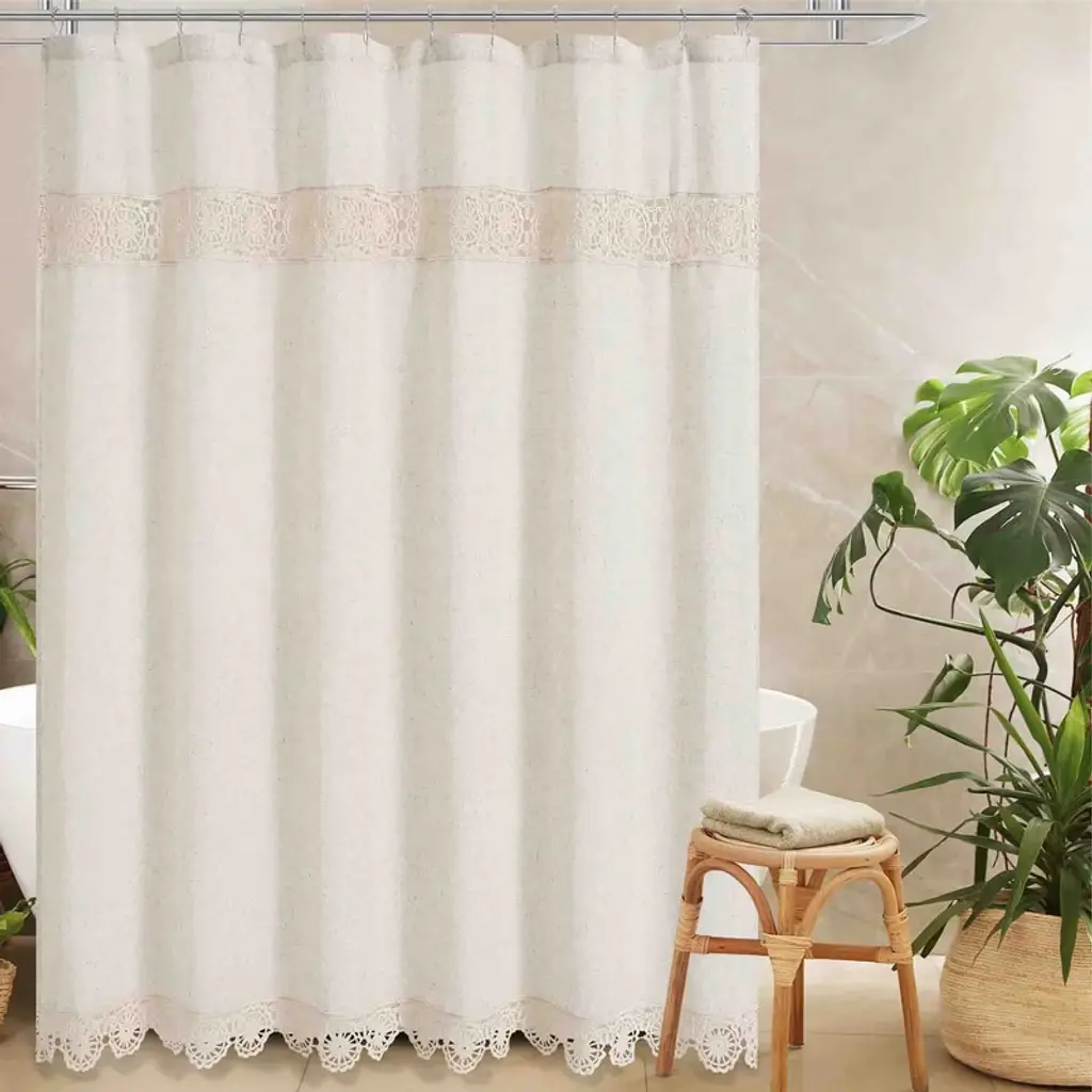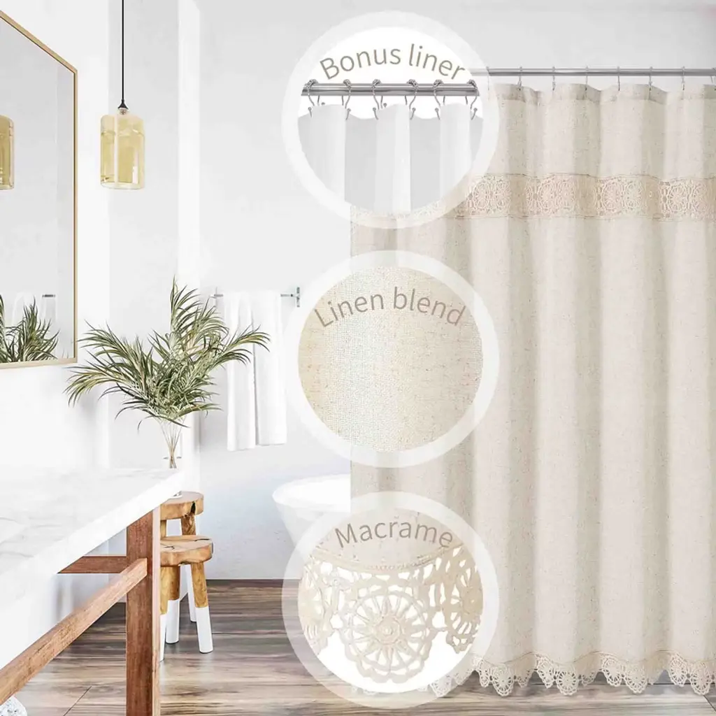 This boho-inspired shower curtain brings soft texture and natural charm to your space. Made from a breathable linen blend fabric (15% linen, 85% polyester) with 100% cotton macrame trim, it adds a relaxed, earthy touch to any farmhouse or boho style bathroom.