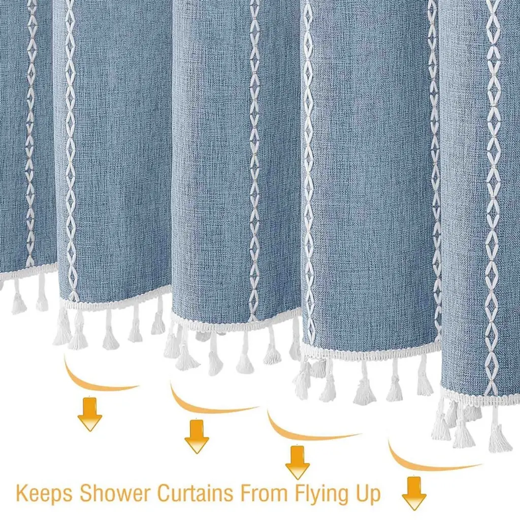 This boho farmhouse shower curtain brings refined charm and a cozy, curated feel to your bathroom. Designed with 3D embroidered stripes and tassels along three sides, it combines rustic texture with elegant detail¡ªcreating a spa-like retreat that feels both warm and luxurious.