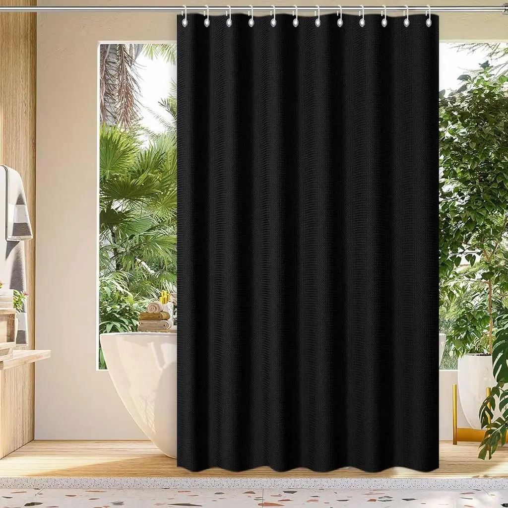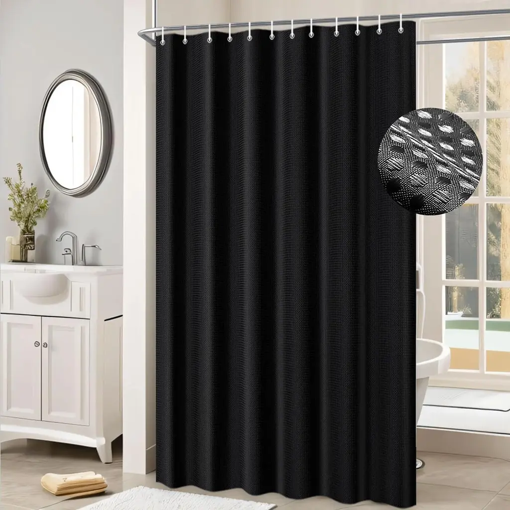 Black Waffle Weave Fabric Shower Curtain, Premium Quality - Black