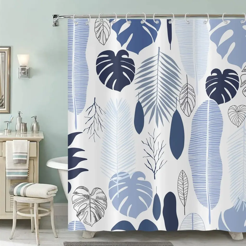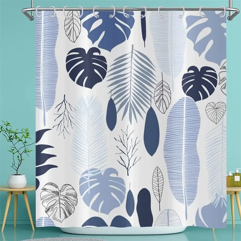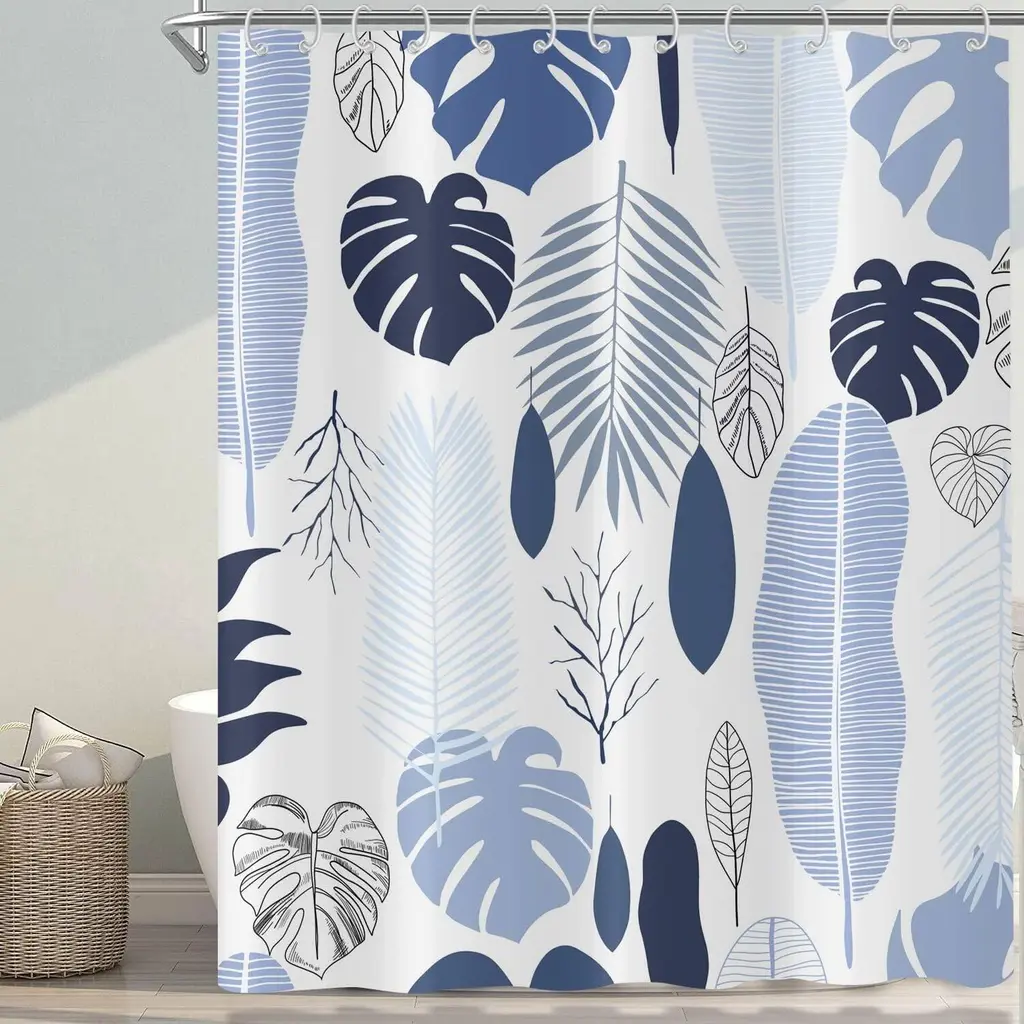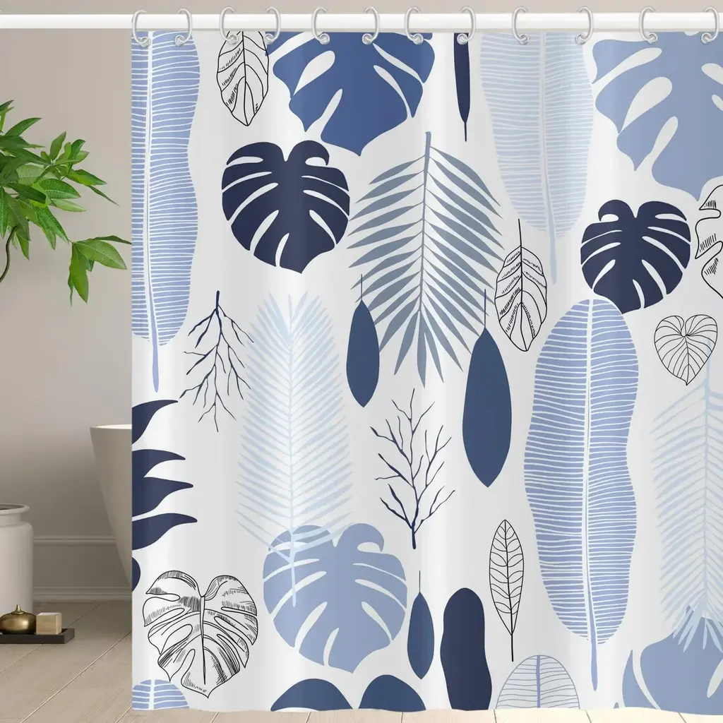 Bring a touch of tropical paradise to your bathroom with our Blue Leaves Shower Curtain, featuring a botanical pattern of lush tropical palm plants. Embrace the serene beauty of nature with this elegant design, perfect for creating a tranquil oasis in your space. Crafted with meticulous attention to detail, this curtain adds a refreshing and vibrant accent to your bathroom decor. Elevate your bathing experience with our Blue Leaves Shower Curtain, where each shower becomes a rejuvenating escape into the lushness of a tropical paradise.