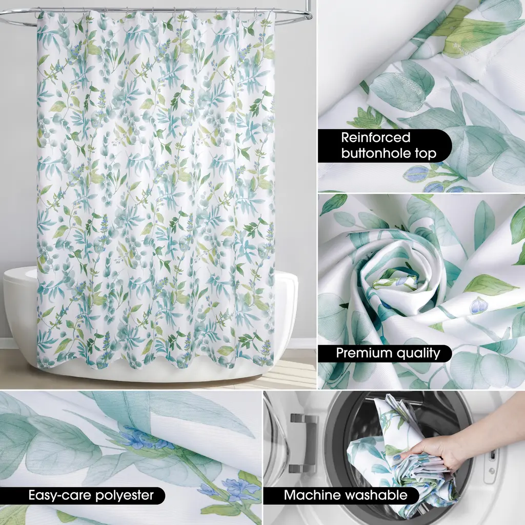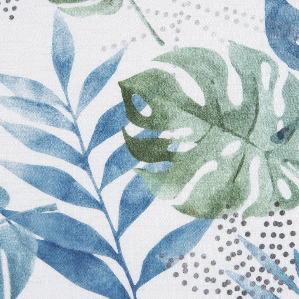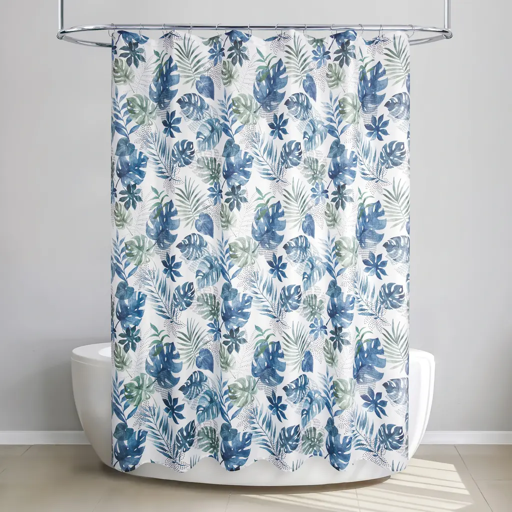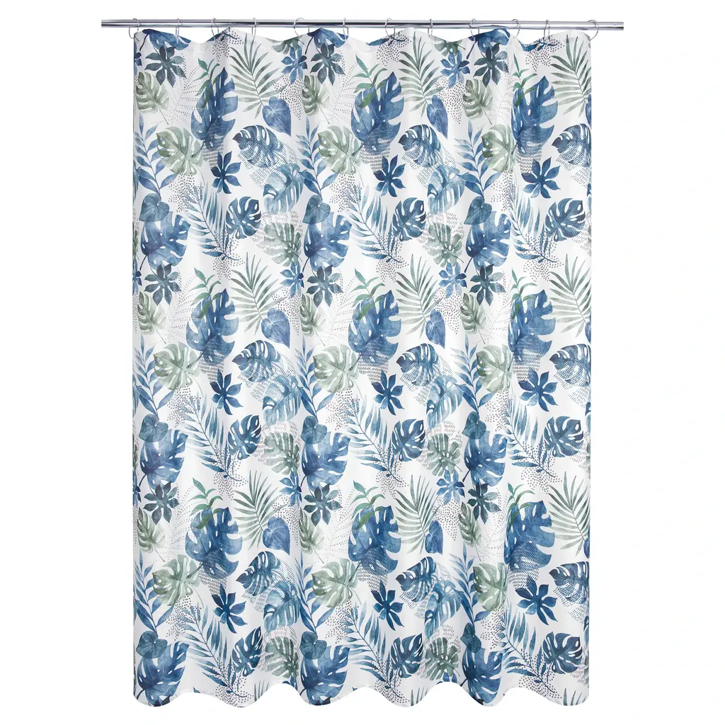 Step into tranquility with the Blue Palm Shower Curtain by Allure Home Creation. This breezy, all-over print, in watercolor shades of blue and green on a white ground, features a tossed array of palm leaves. The soothing feeling of this airy design creates a tropical haven that will bring calm into your daily routine. This shower curtain measures 70" x 72" and fits most standard sized tubs and shower areas providing privacy and protection from water splashing onto the floor. Crafted from 100% easy care polyester linen fabric with a reinforced buttonhole top that works well with standard shower hooks and curtain rods. Use of a liner is recommended. Machine wash and tumble dry on low heat. Complete the look by coordinating with other pieces in the Blue Palm Bath Collection or use alone.