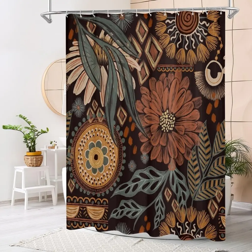 SPECIAL DESIGN - The chic shower curtain is decorated with bohemian floral botanicals that will blend in with any existing home décor. This design is a perfect accent piece, perfect for a beautiful and vintage bathroom style.LASTING WATERPROOF - This polyester fabric shower curtain is colorful and durable. The waterproof material allows water to bead up on the surface and dry quickly.EASY INSTALLATION - Metal grommets at the top allow the shower curtain to be quickly hung on a pole using shower rings. Plus, the included 12 C-hooks make installation a breeze.EASY CARE - Simply remove the curtain rings and wash in the washing machine. If there are wrinkles, gently iron on low heat.MULTIPLE OPTIONS - Our shower curtain is not only suitable for bathrooms, it is also perfect for use as a hotel, door, bathroom window, room divider, dorm room, closet or car curtain when traveling. It can even be used as a party backdrop!