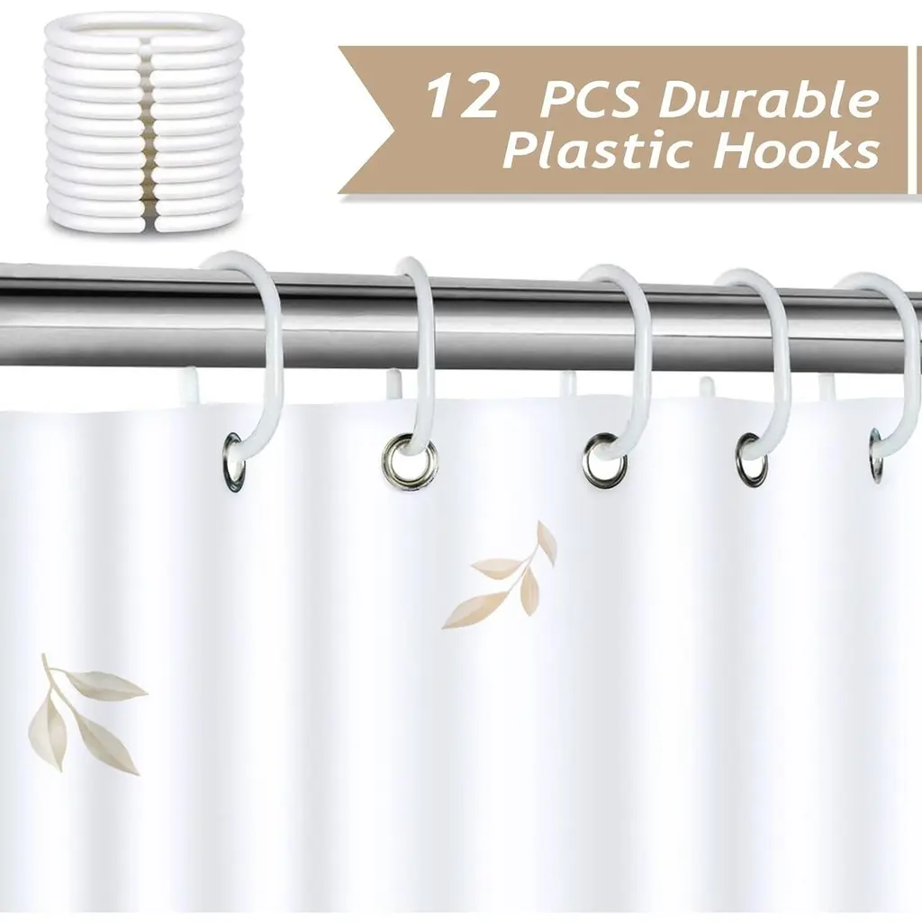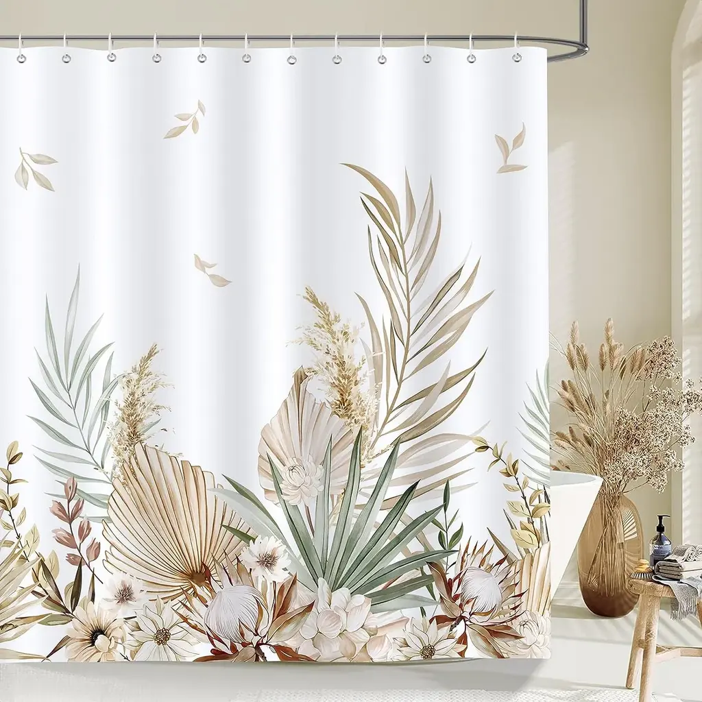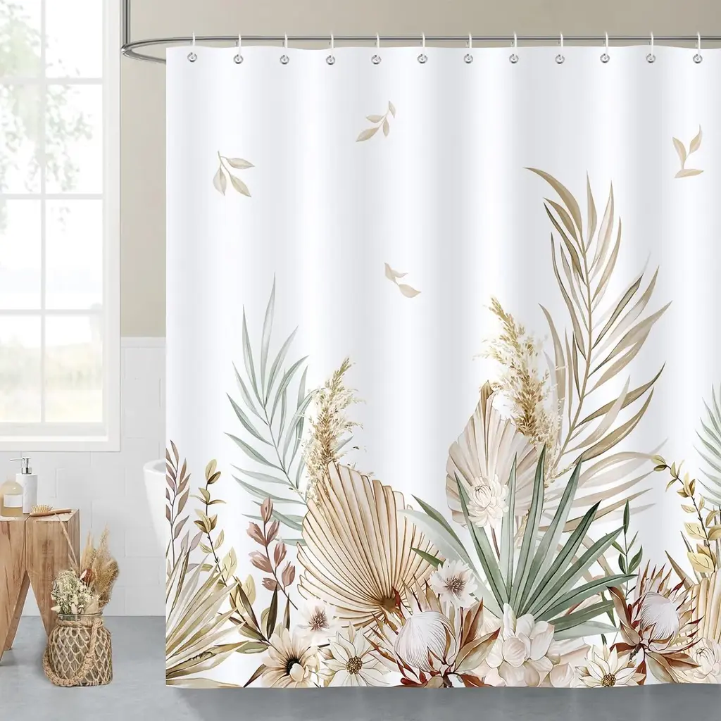 Material: 100% polyester fabric, eco-Friendly, waterproof, machine washable. Design: Designed with light colored tropical leaves in boho style, this shower curtain will definitely create an autumn vibe for your bathroom and make your space fresh and stylish. Size: 72 x 72 Inch (183 x 183 cm), due to manual measurement, please kindly allow 1-2 cm deviation. The standard size shower curtain is fit for most bathtubs and shower stalls. Easy to Install: The shower curtain includes 12 plastic curtain hooks and 12 reinforced metal grommets, easy to install and and slide. Easy Care: It can be cleaned with a quick rinse, wipe after a shower or machine washable in cold water, tumble dry low, do not bleach.